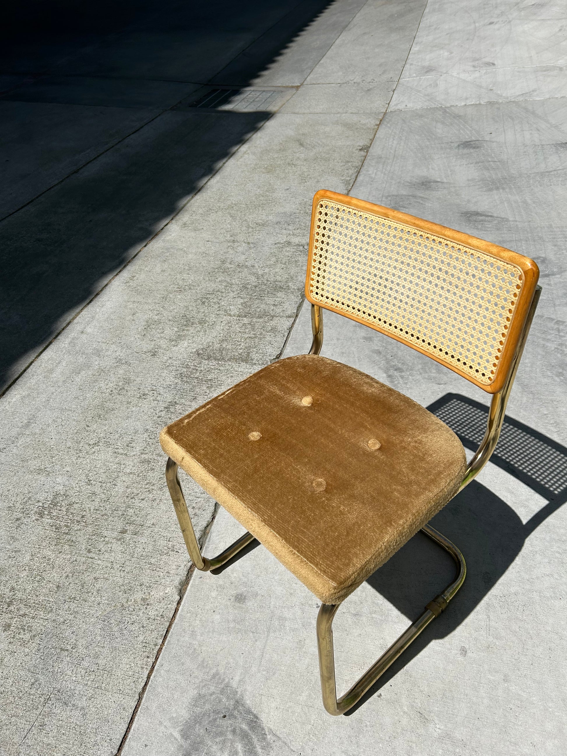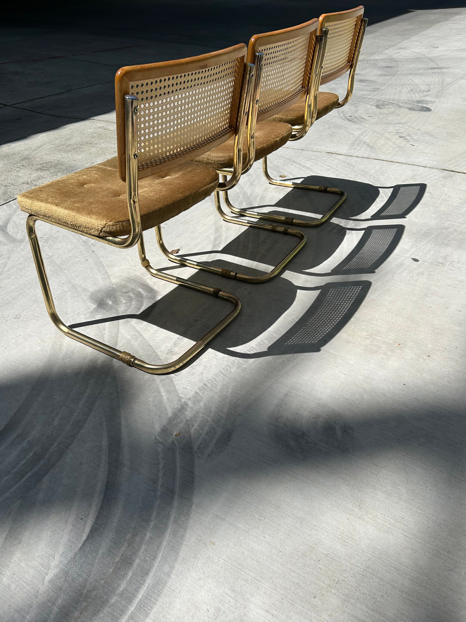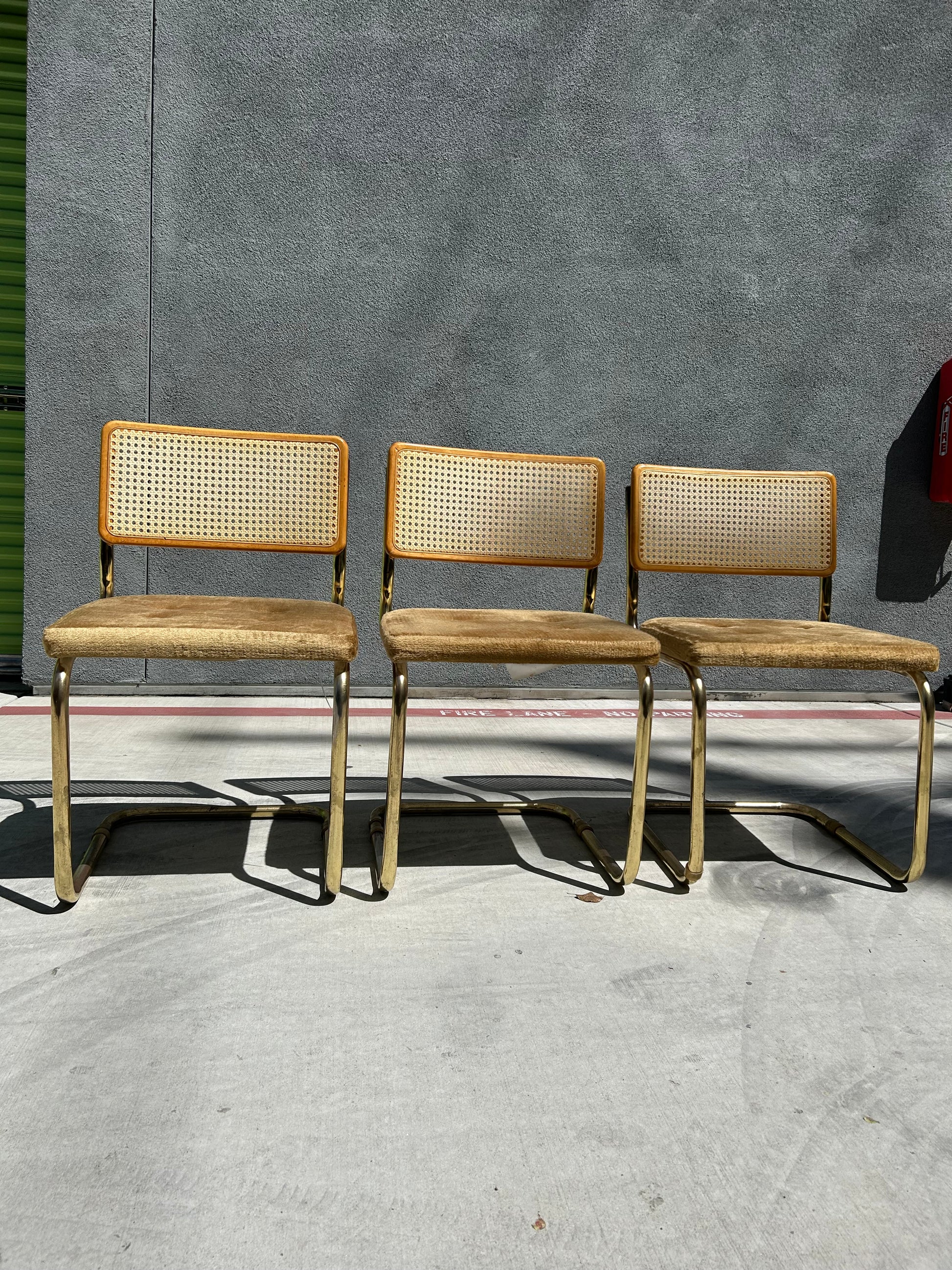 Chairs are in fair condition due to brass patina imperfections. Moderate signs of wear at bottoms as well as some scuffs around the backs. Cane is in immaculate condition.