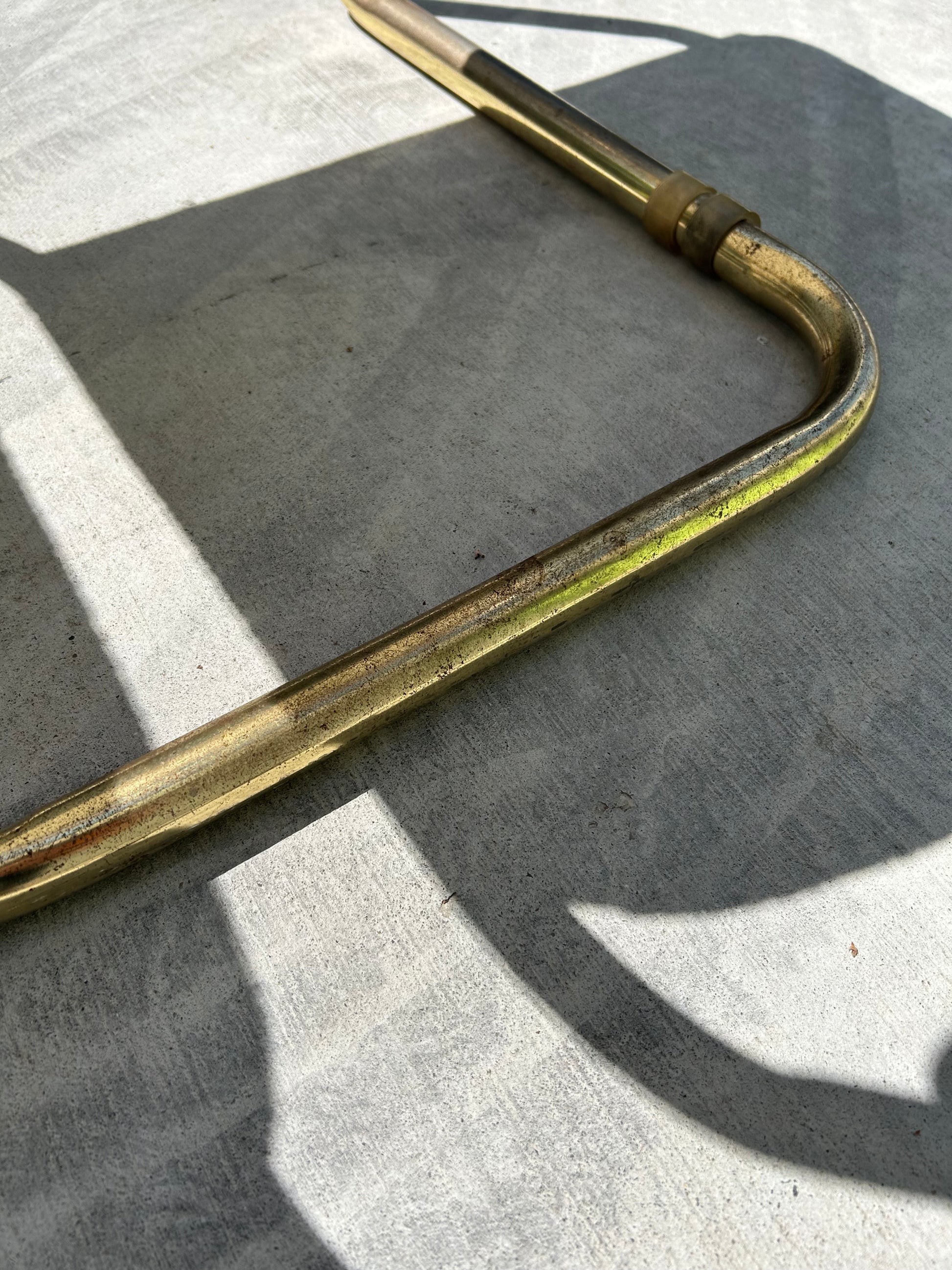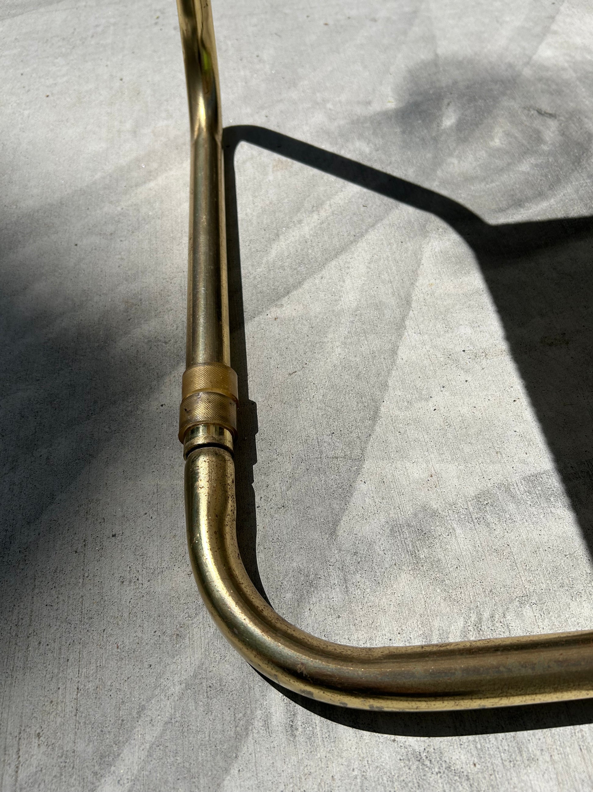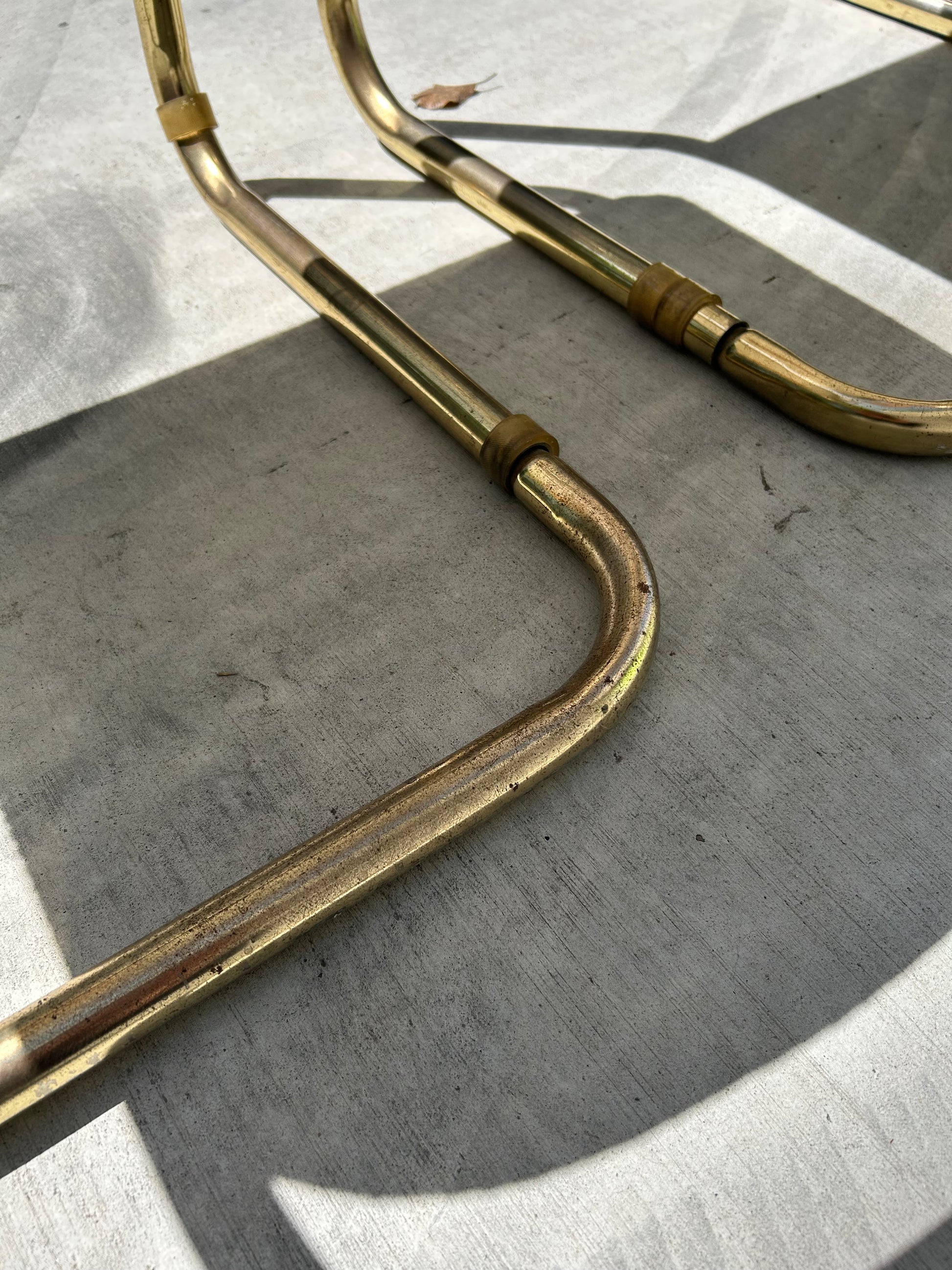 Chairs are in fair condition due to brass patina imperfections. Moderate signs of wear at bottoms as well as some scuffs around the backs. Cane is in immaculate condition.