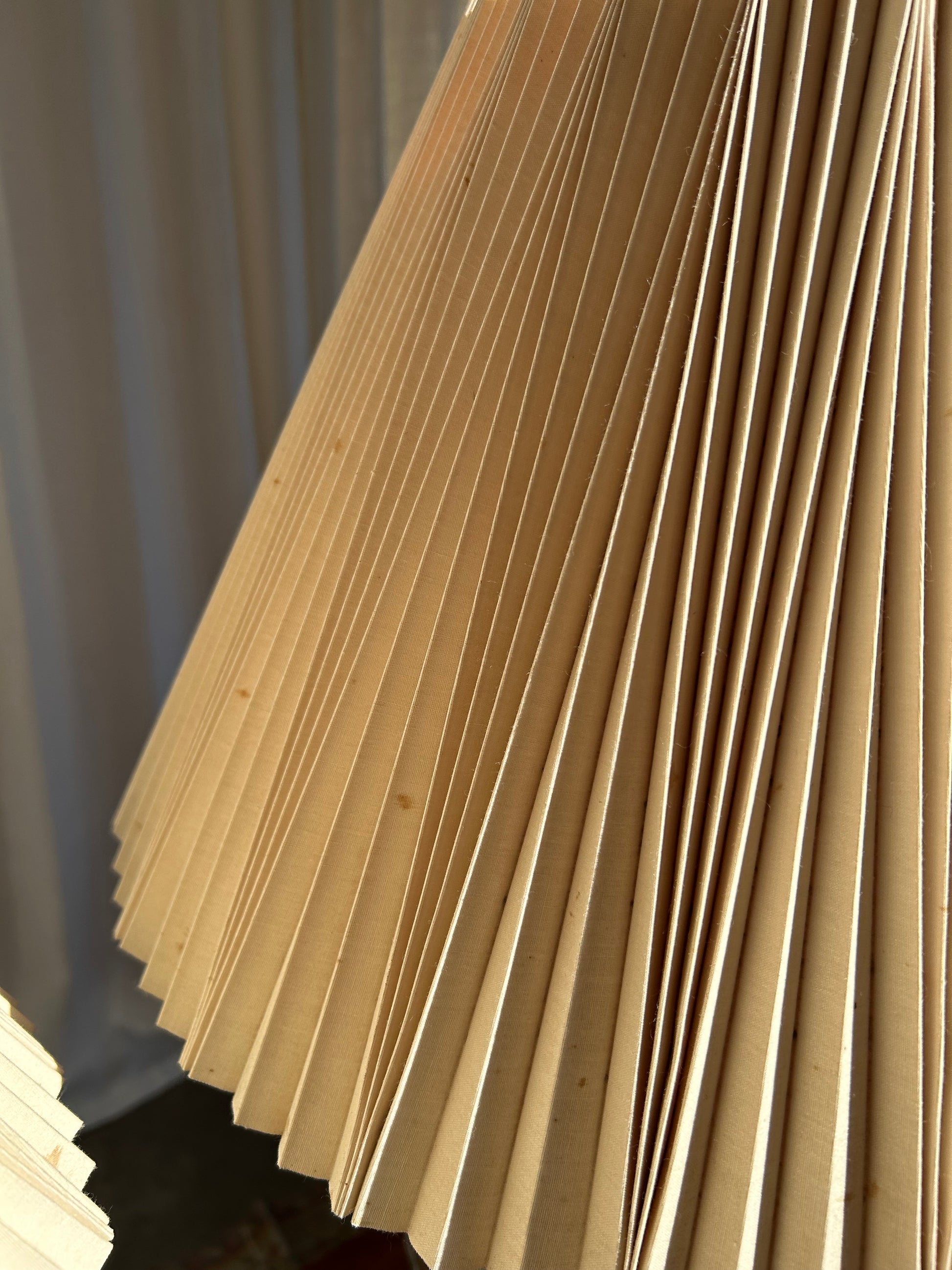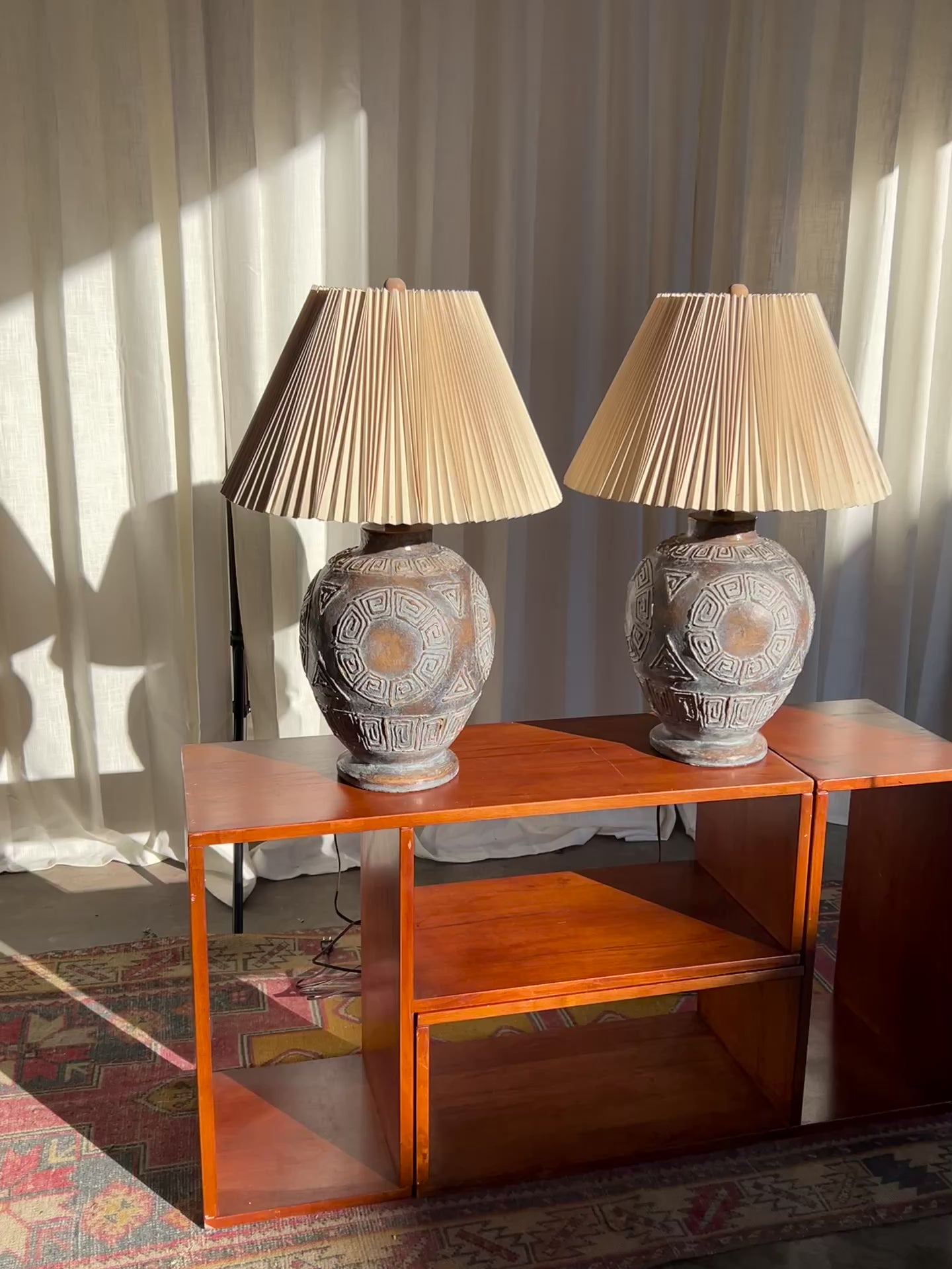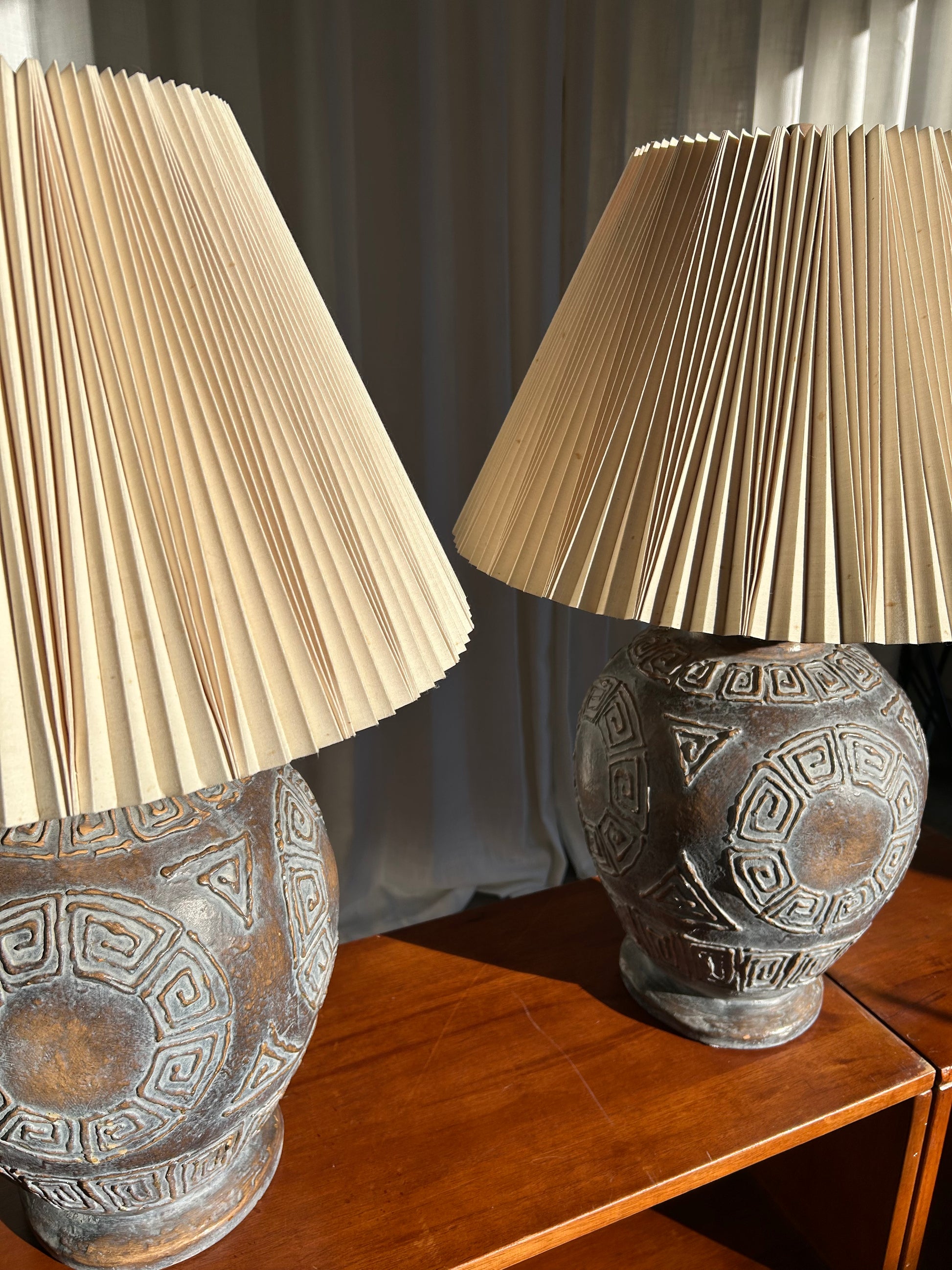 Good working condition, one has been professionally re-wired. Shades have some spots and dents on pleats. See photos.