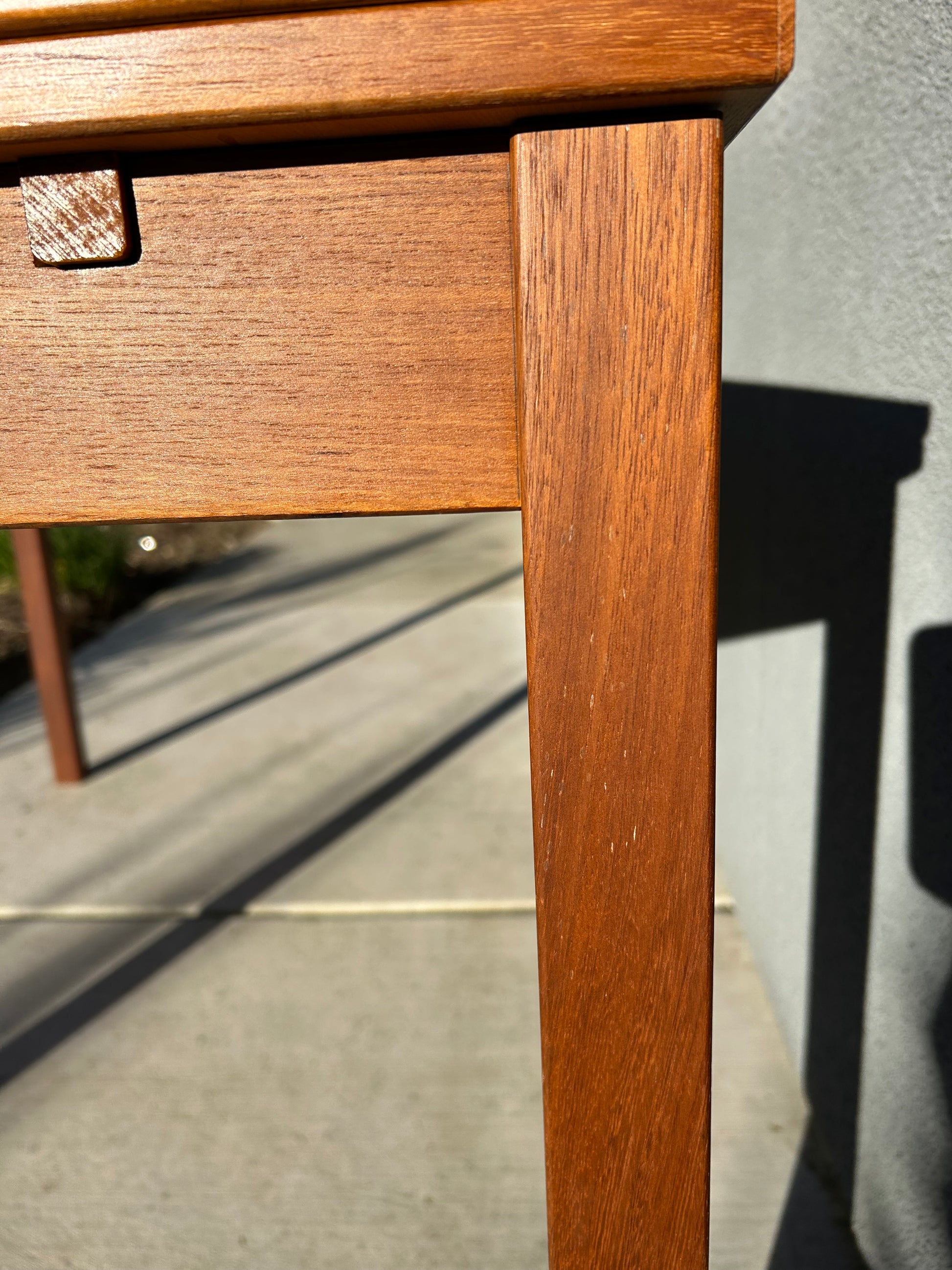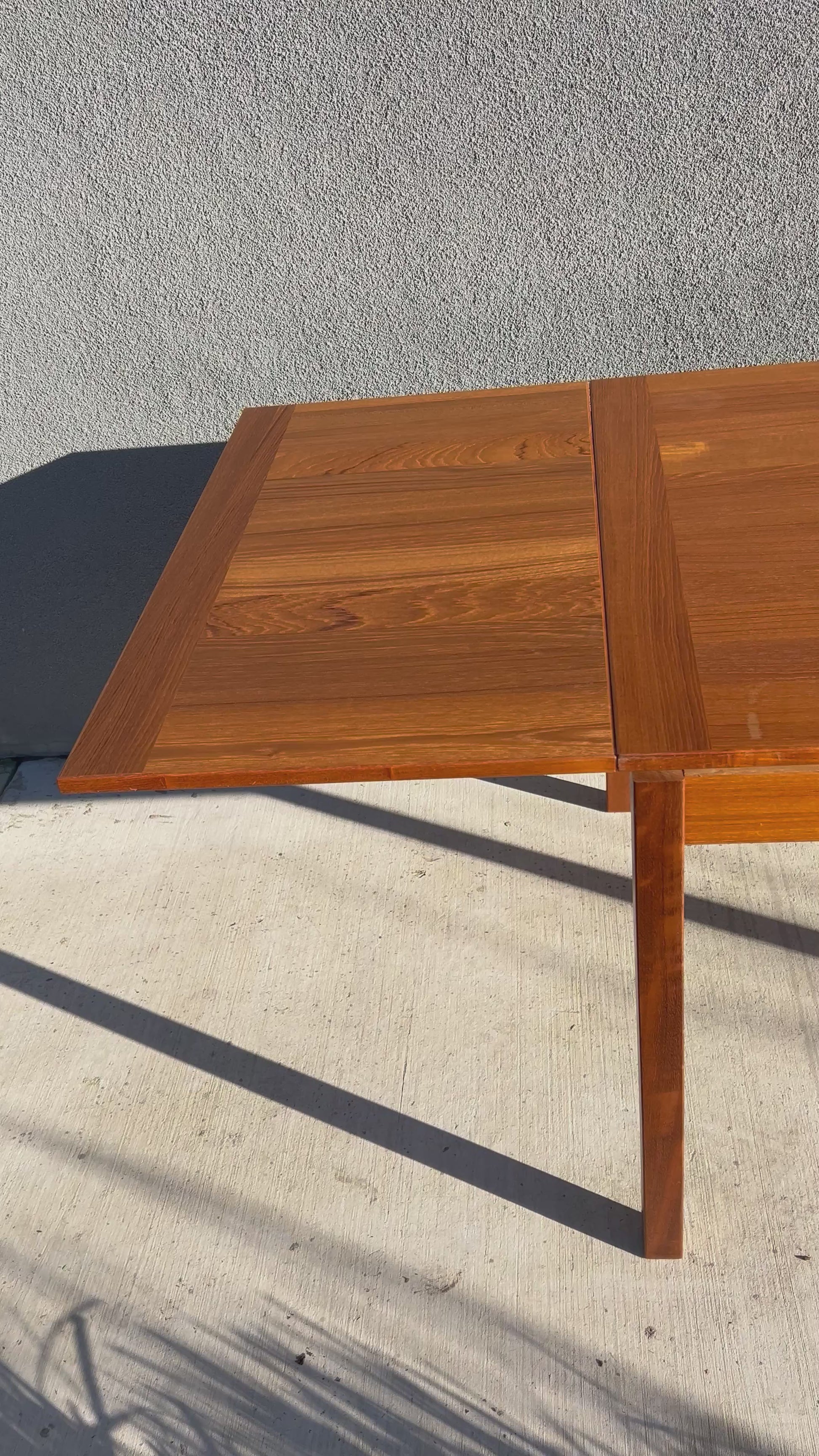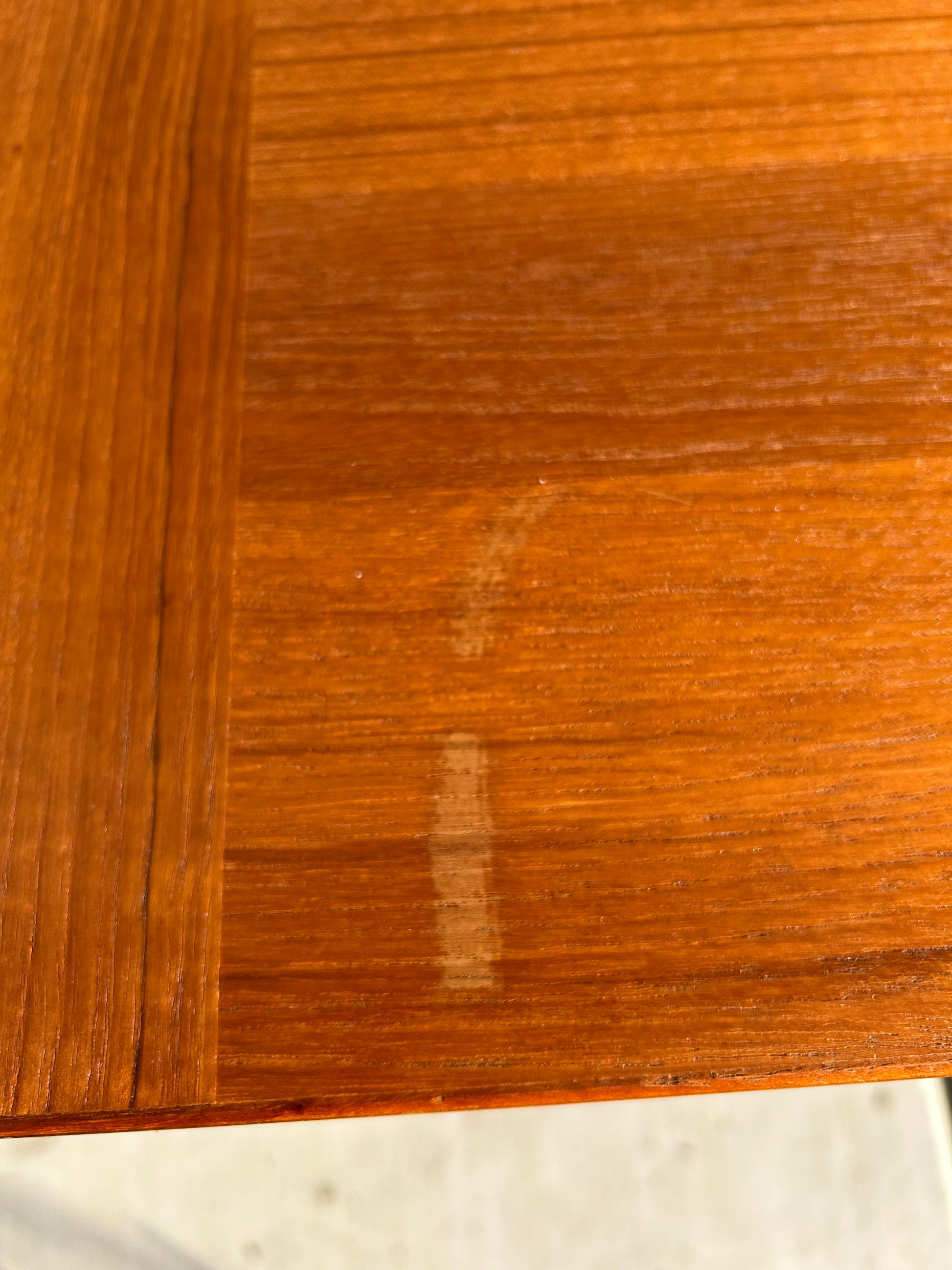 Wear and tear on the legs and on the ends of the main portion of the table consistent with age and use, see photos. The legs can be unscrewed and removed and are solid teak.