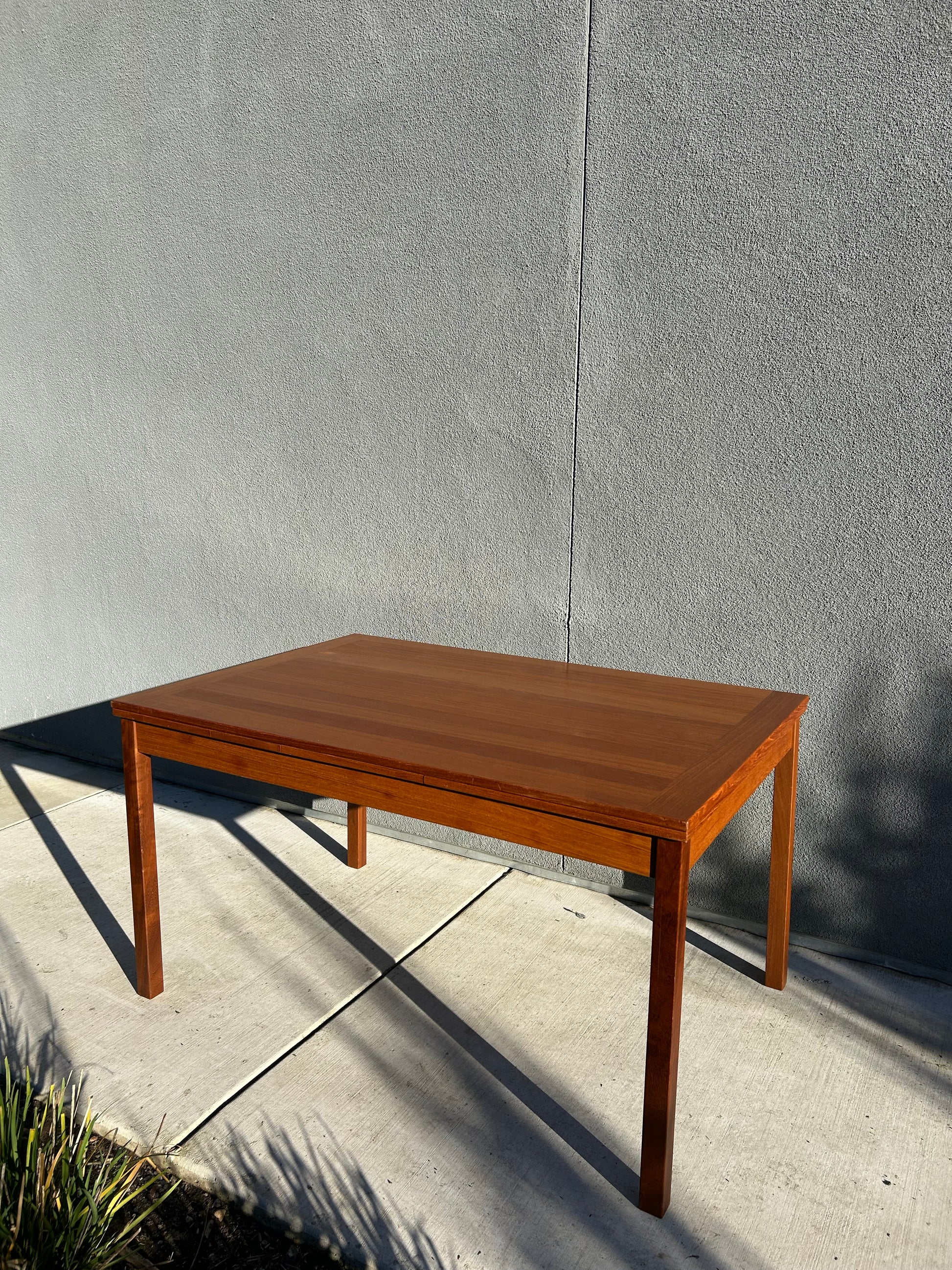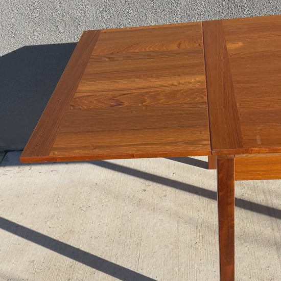 Danish Modern Teak Veneer Expandable Dining Table with 2 leaves. 2 leaves slide in and pull out from the narrower ends.