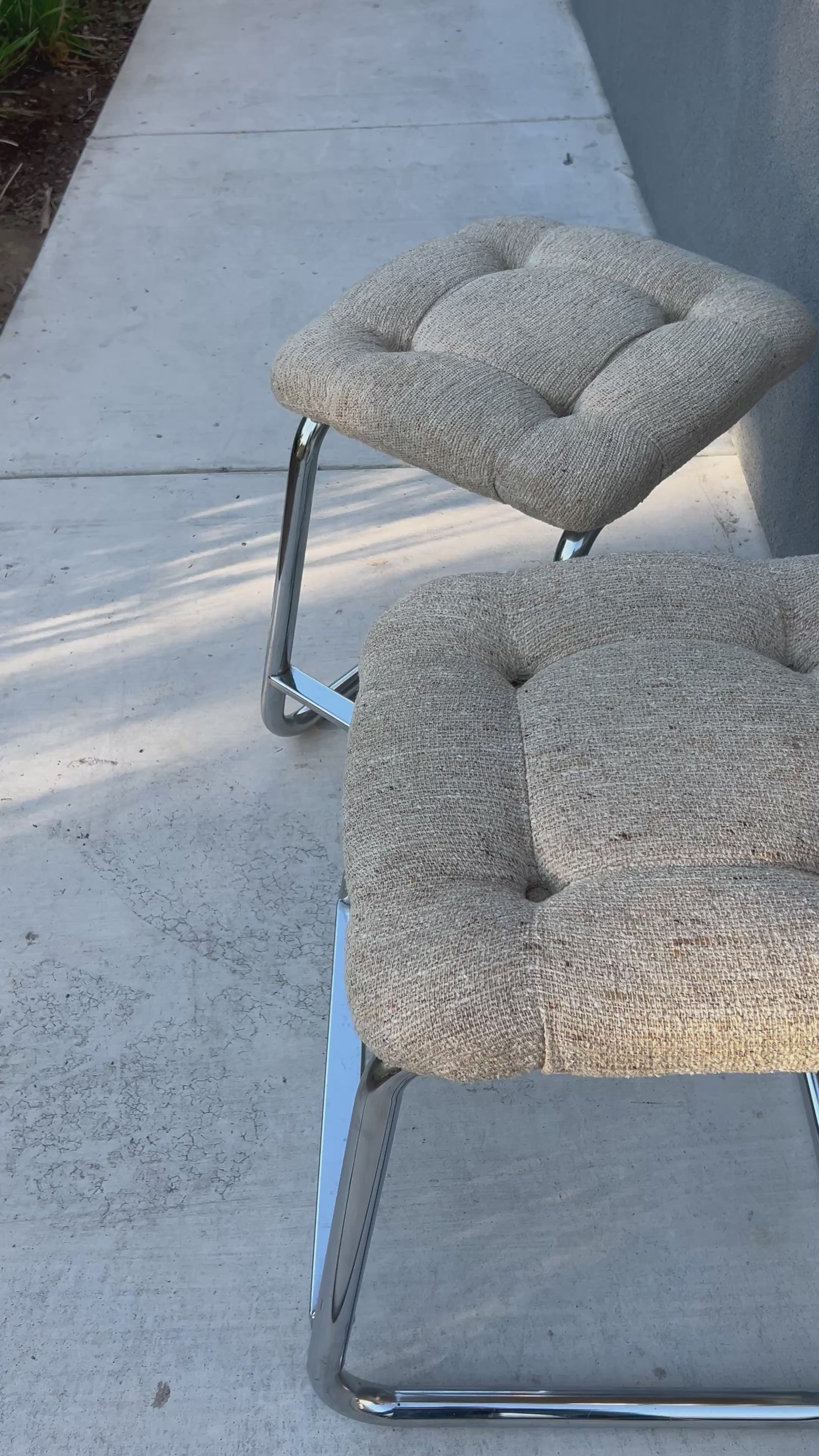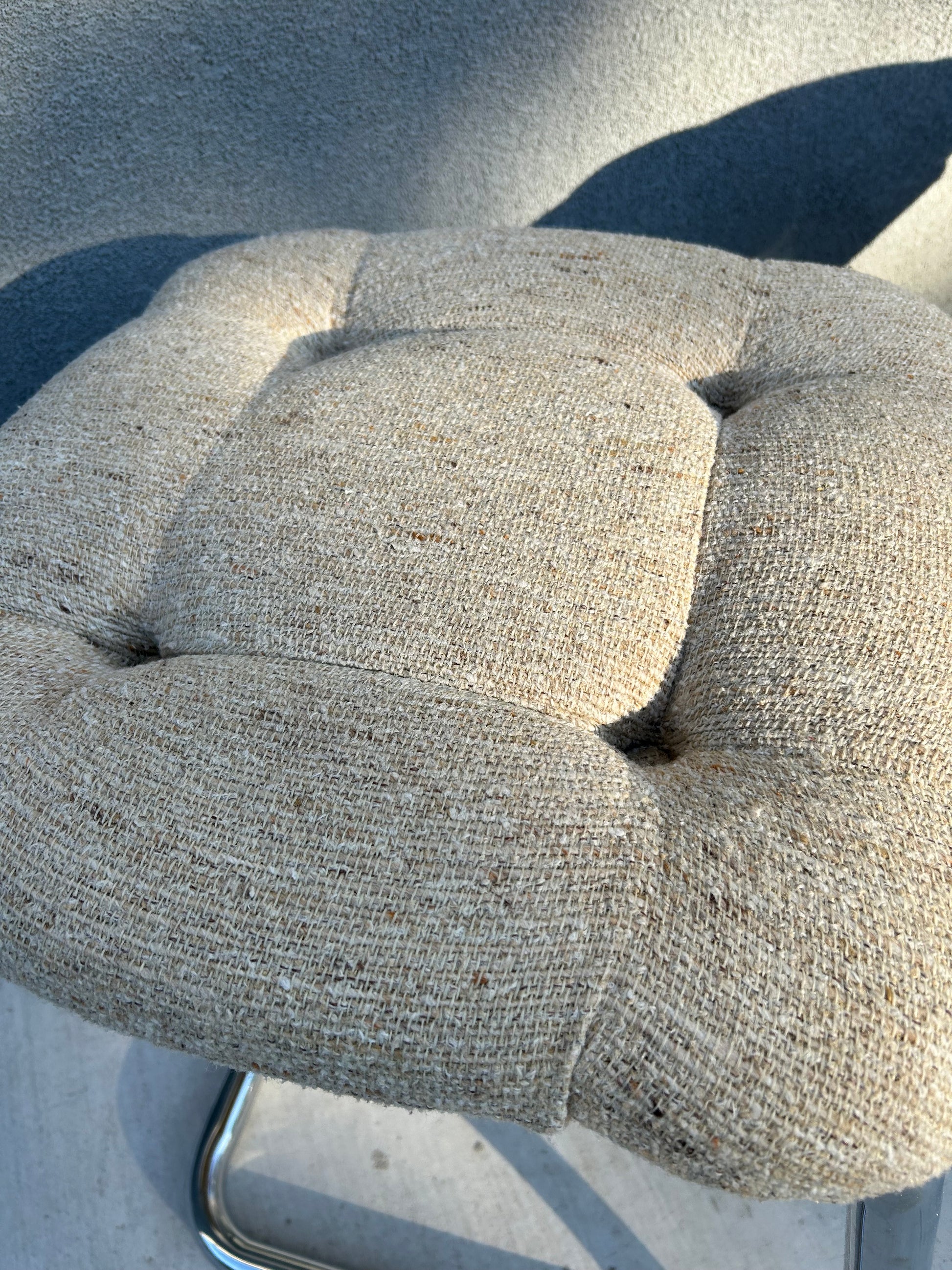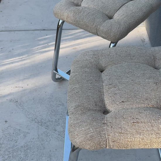 Sold as a pair. Original tufted fabric in excellent condition with no rips or stains. Chrome has slight scuffs consistent with age and use.