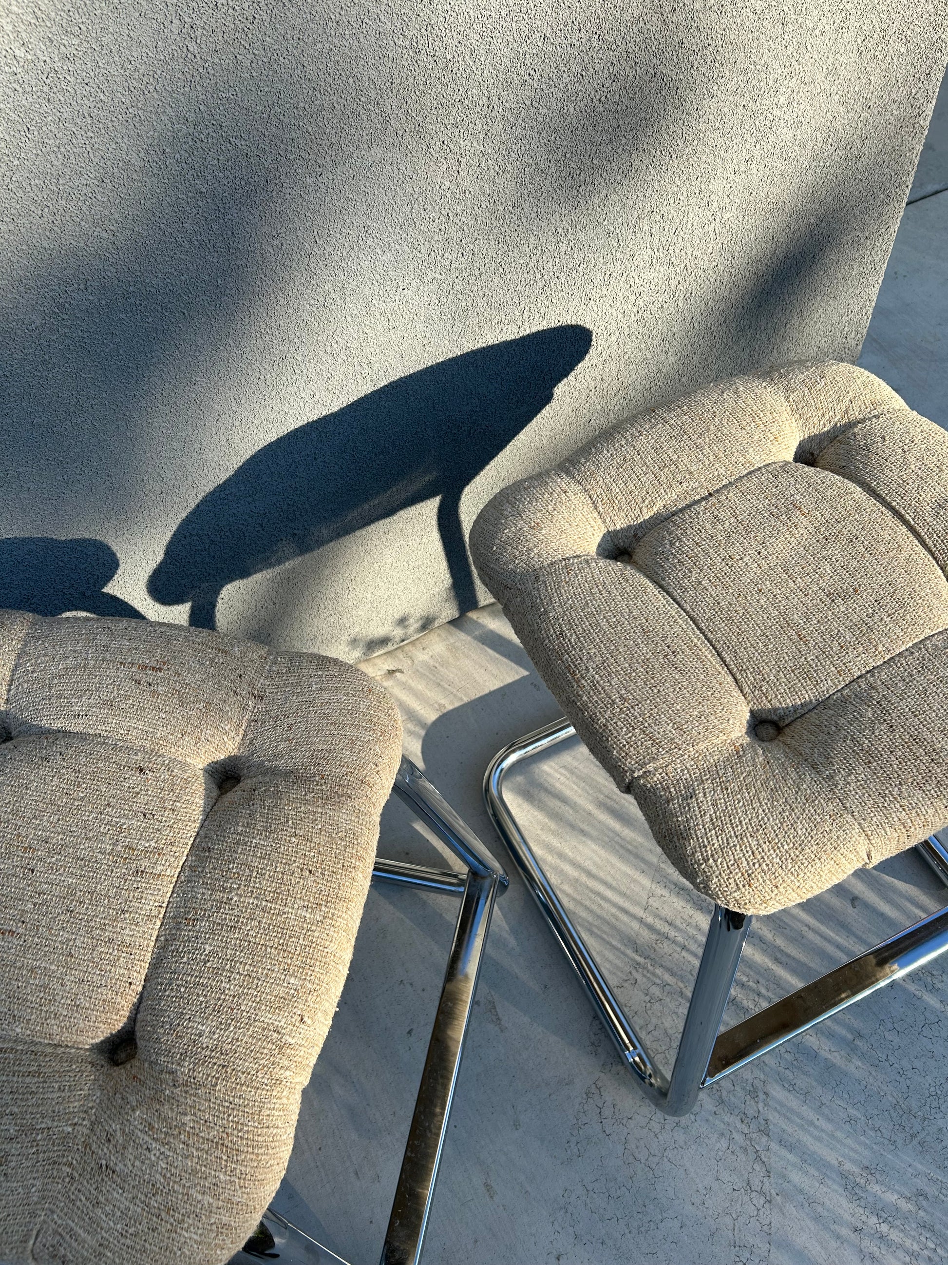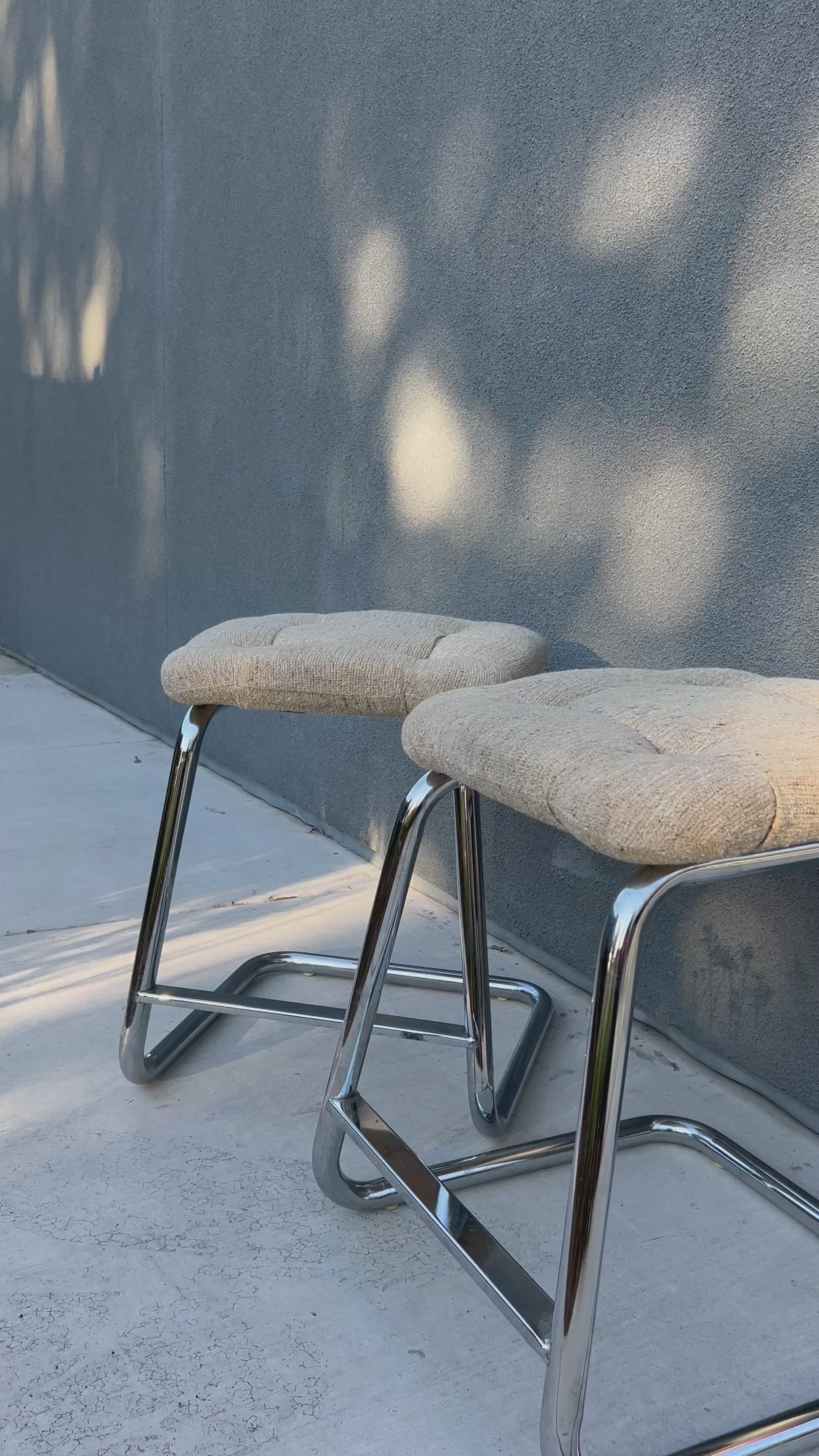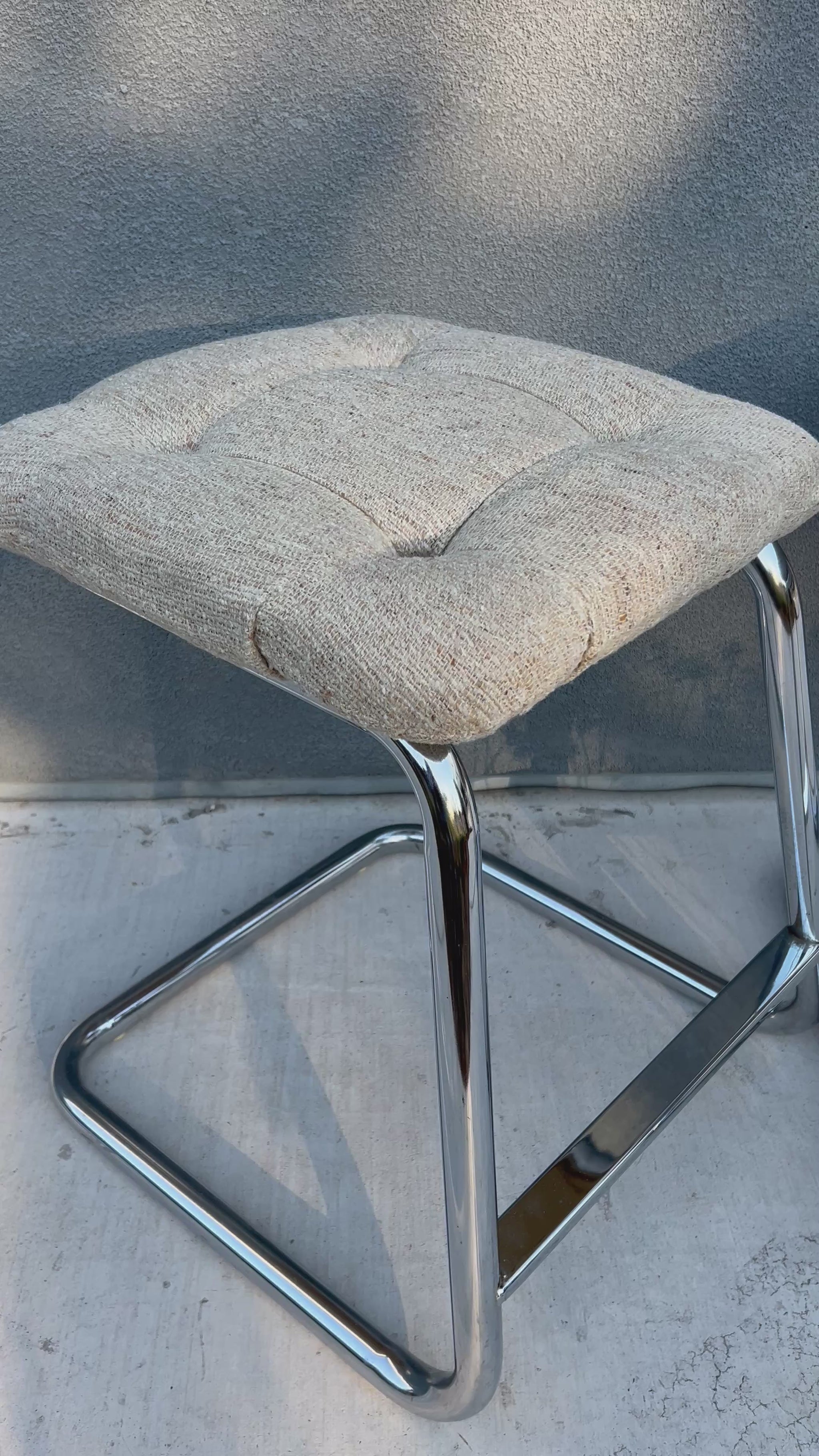 Sold as a pair. Original tufted fabric in excellent condition with no rips or stains. Chrome has slight scuffs consistent with age and use.