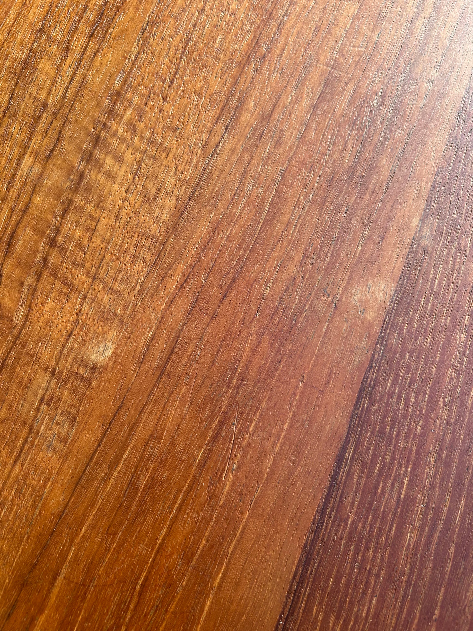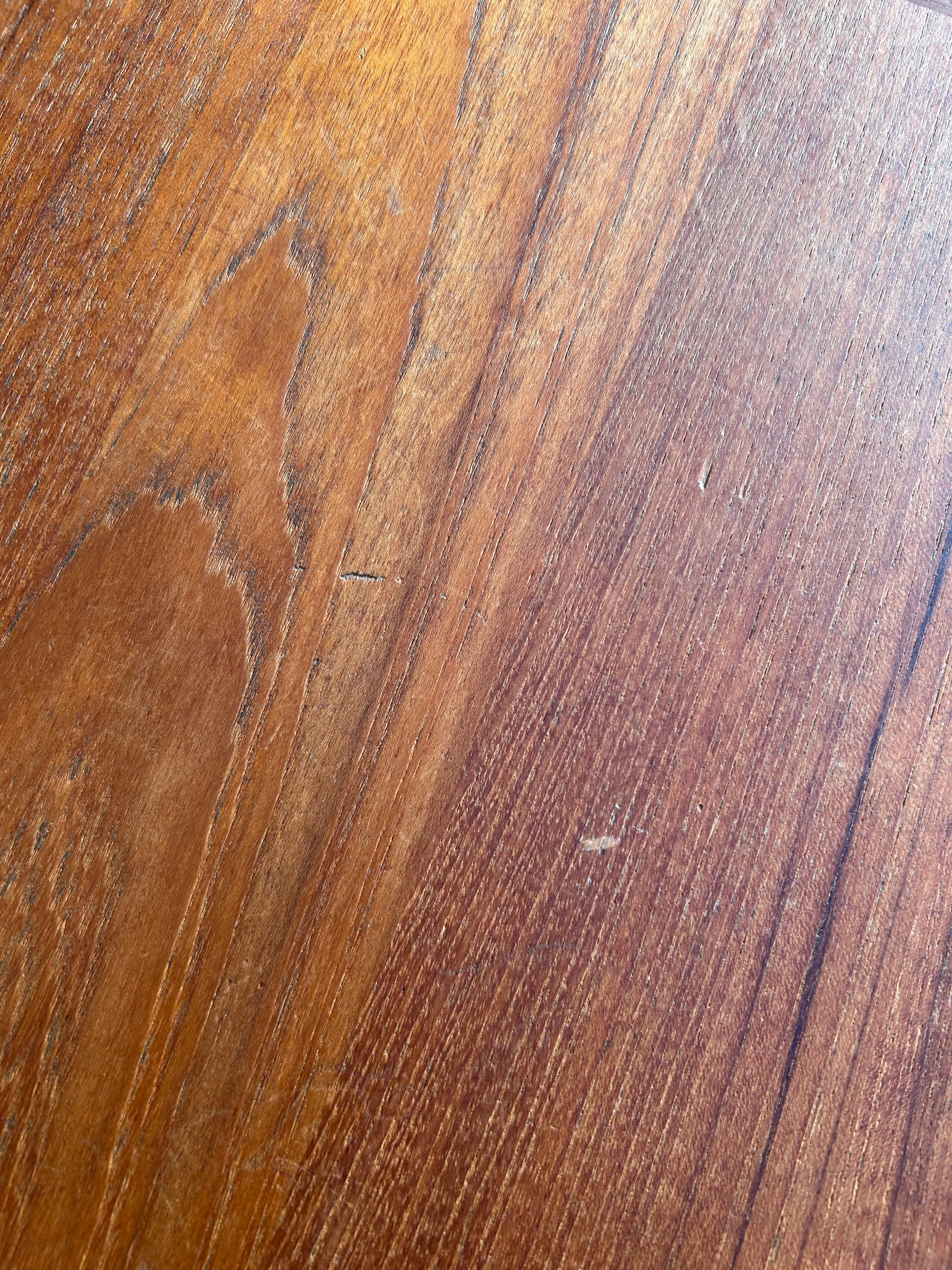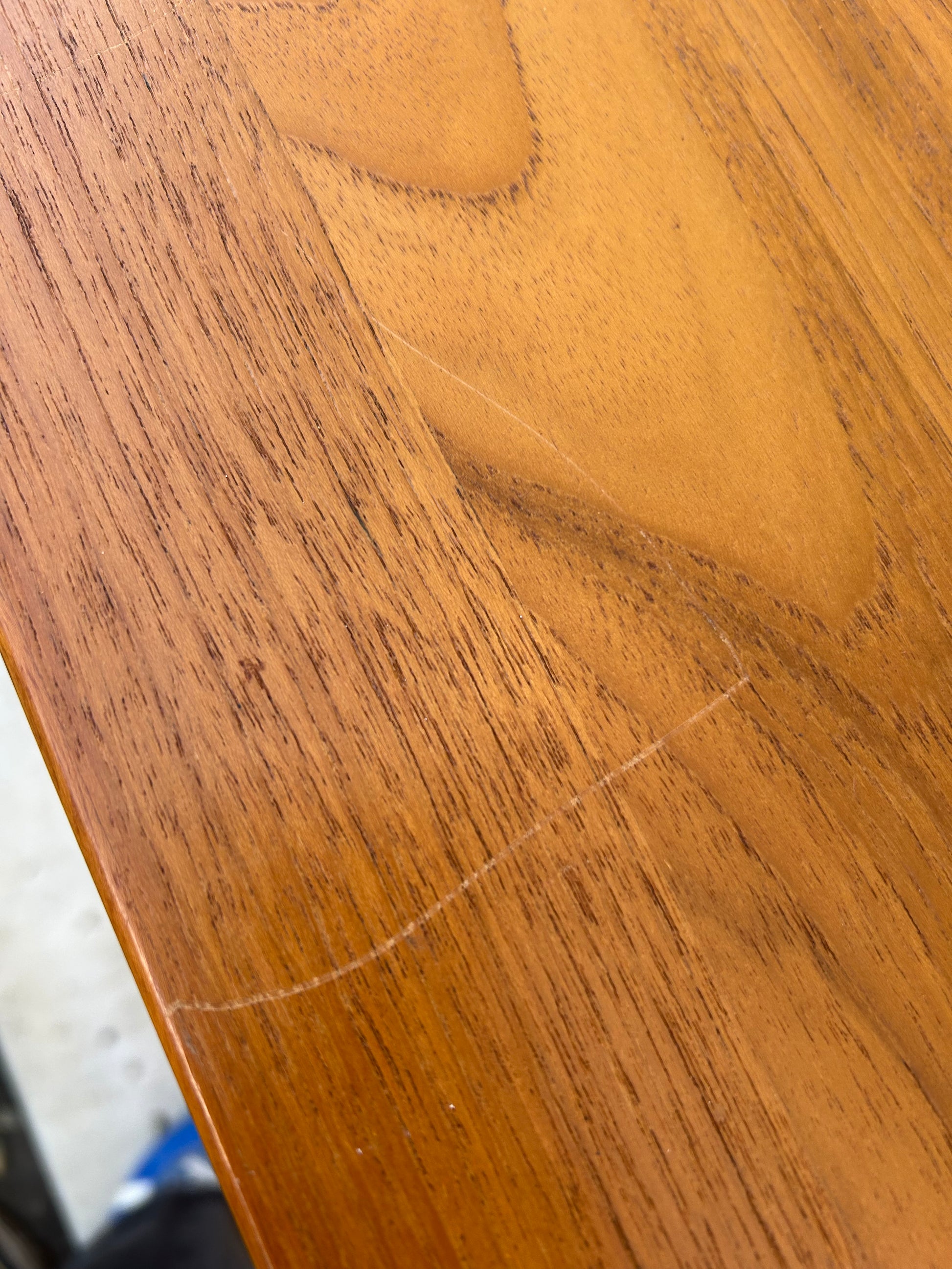 Wear and tear on the top, legs and on the ends of the main portion of the table consistent with age and use, see photos. The legs can be unscrewed and removed.