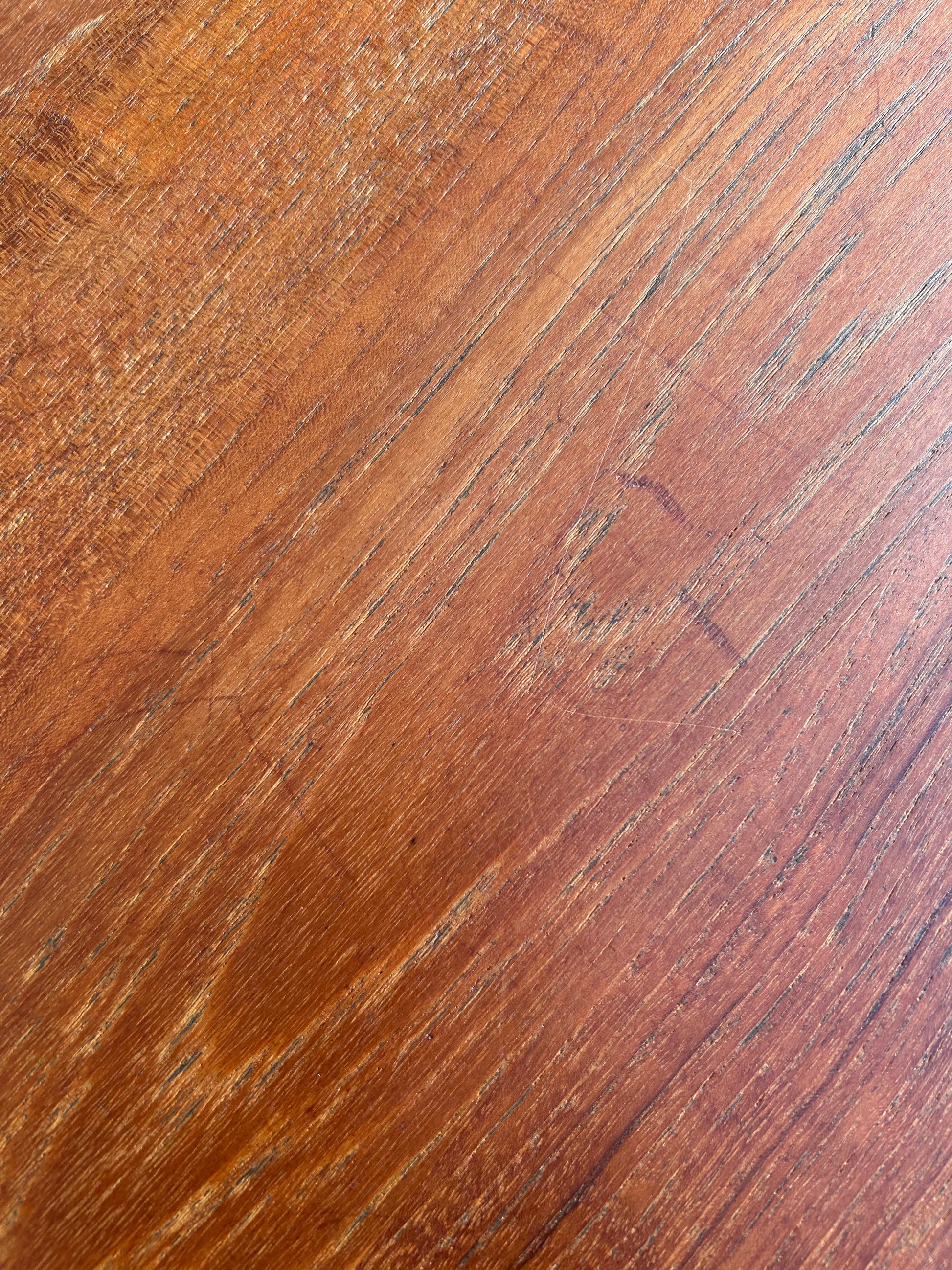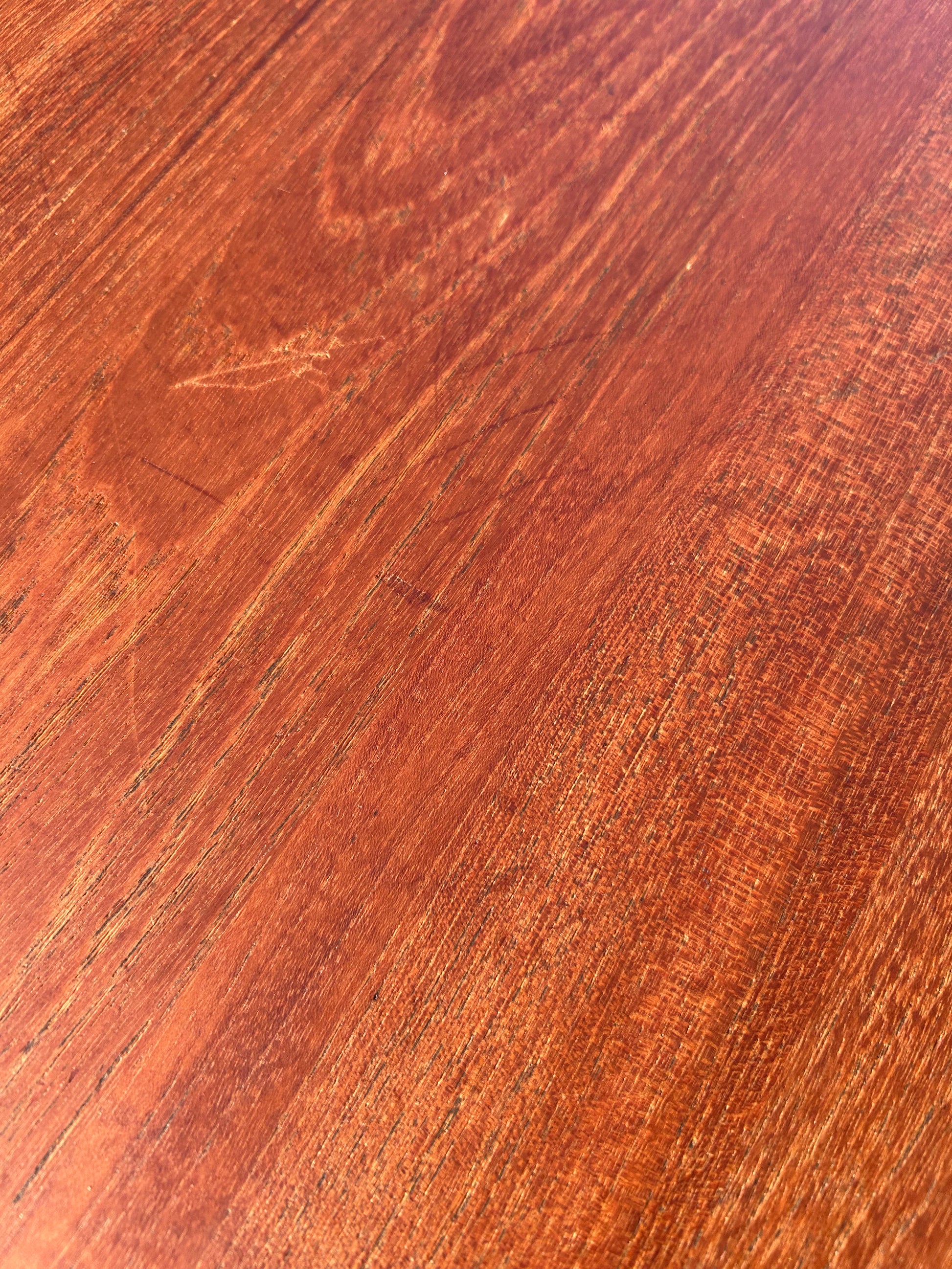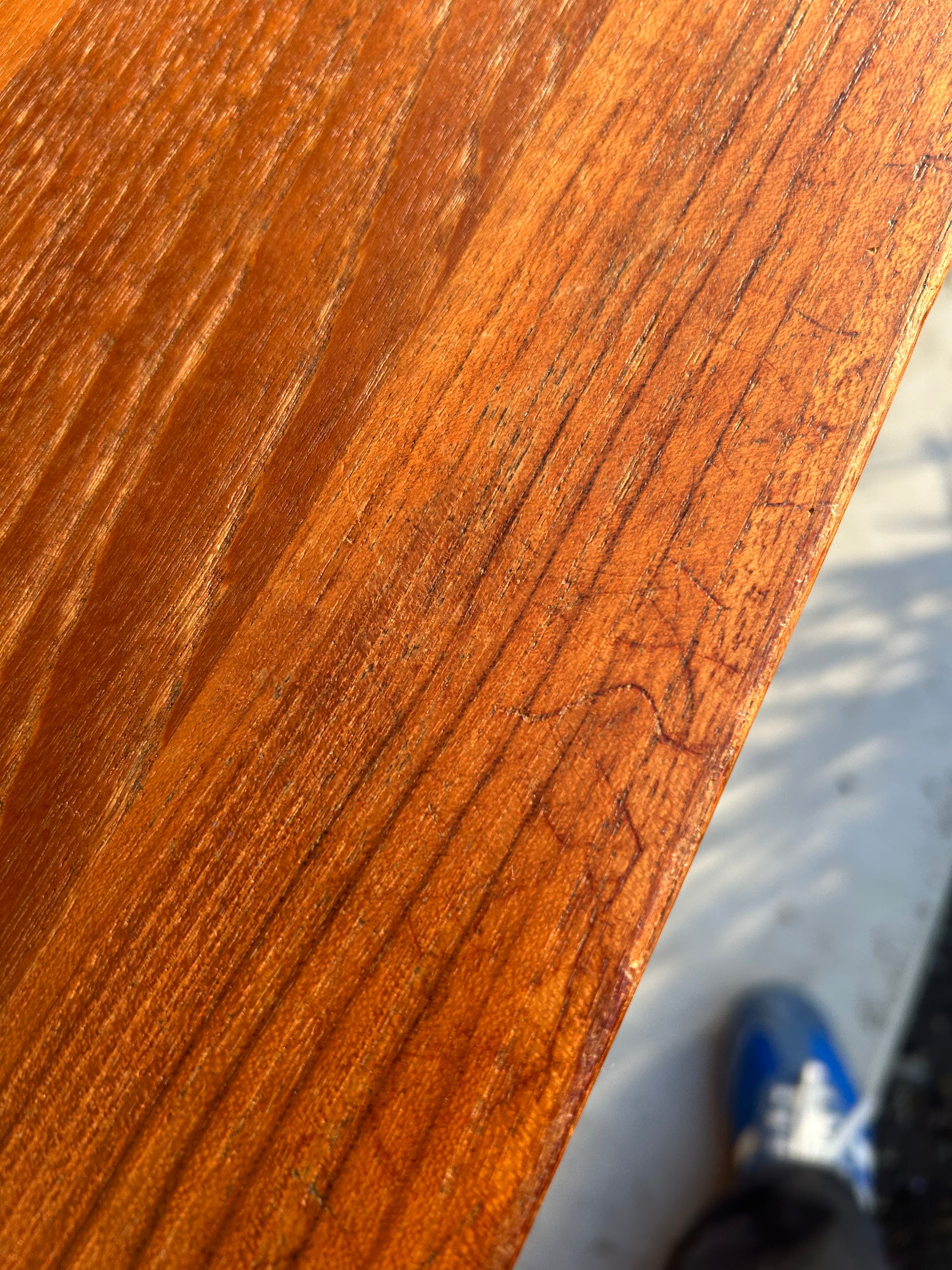 Wear and tear on the top, legs and on the ends of the main portion of the table consistent with age and use, see photos. The legs can be unscrewed and removed.