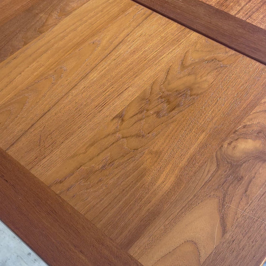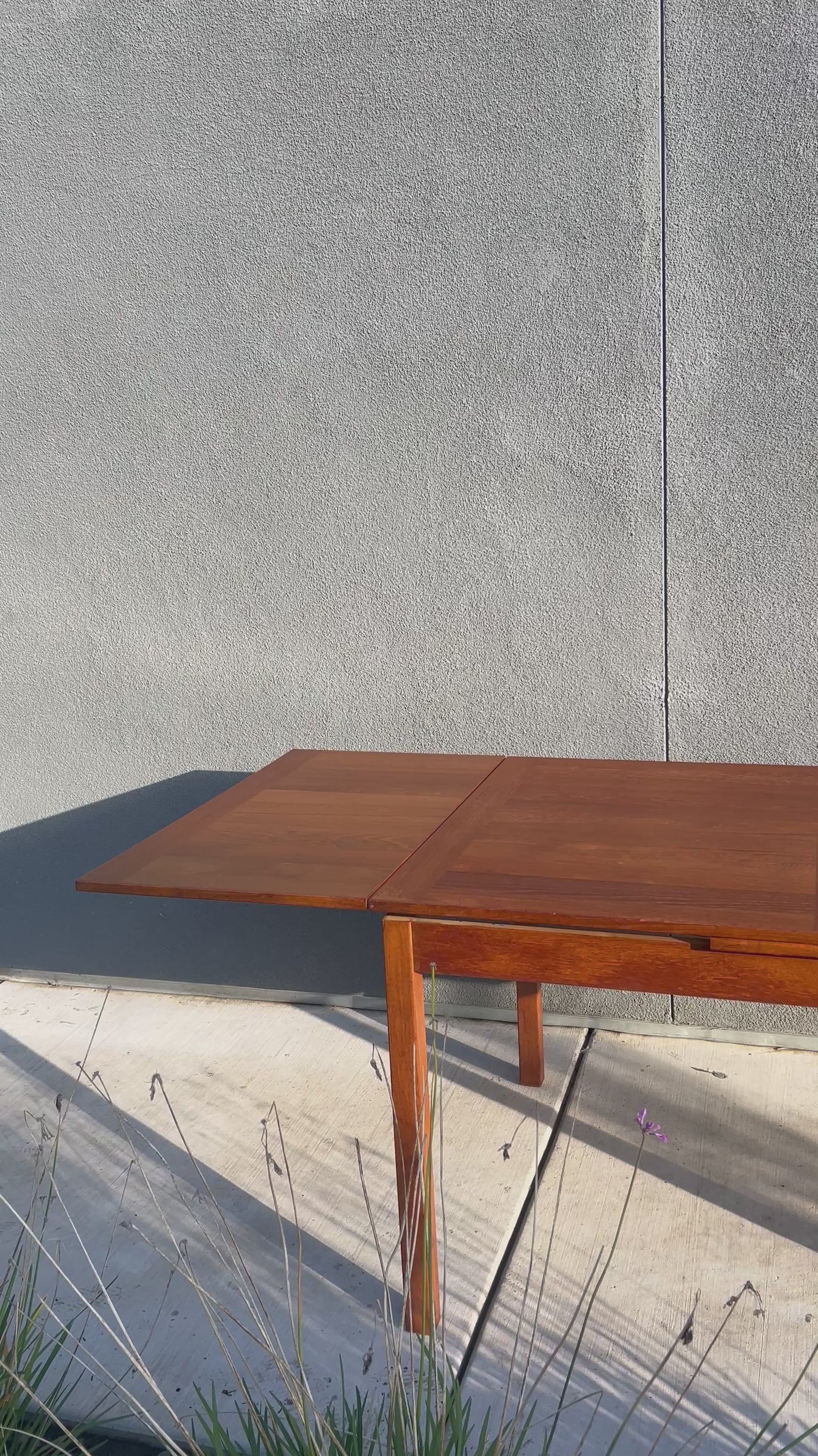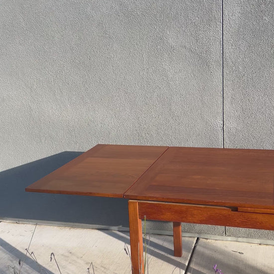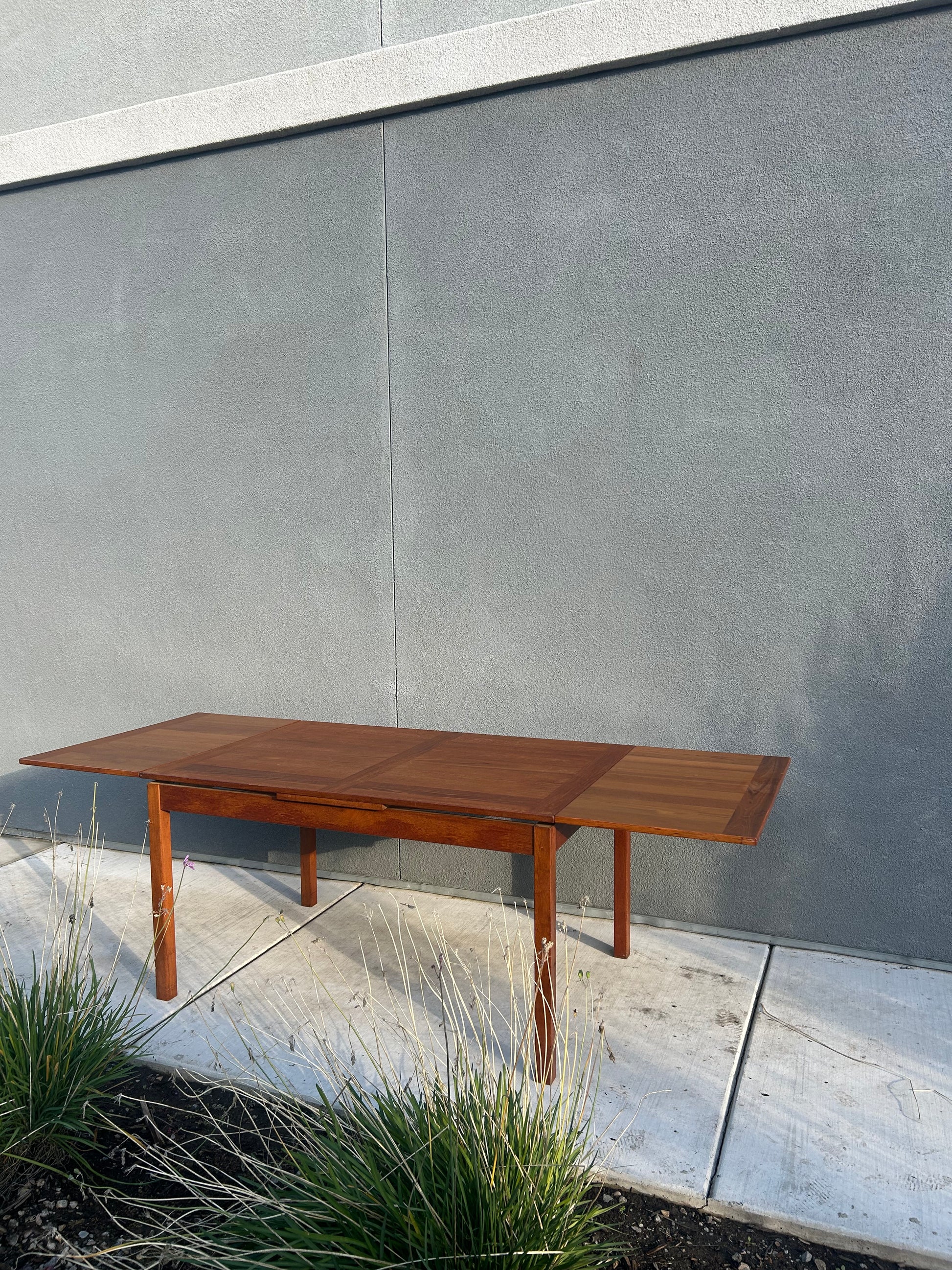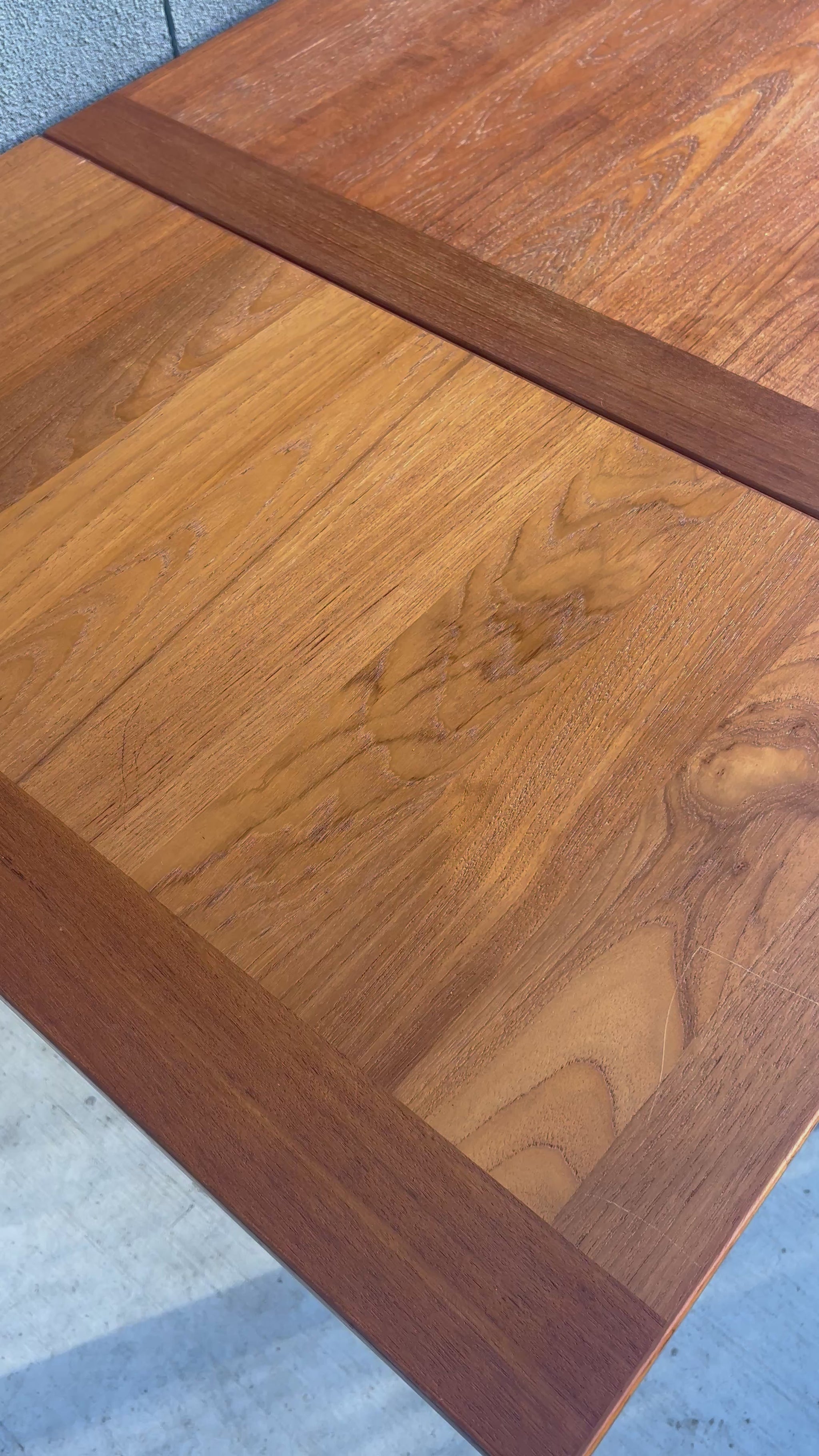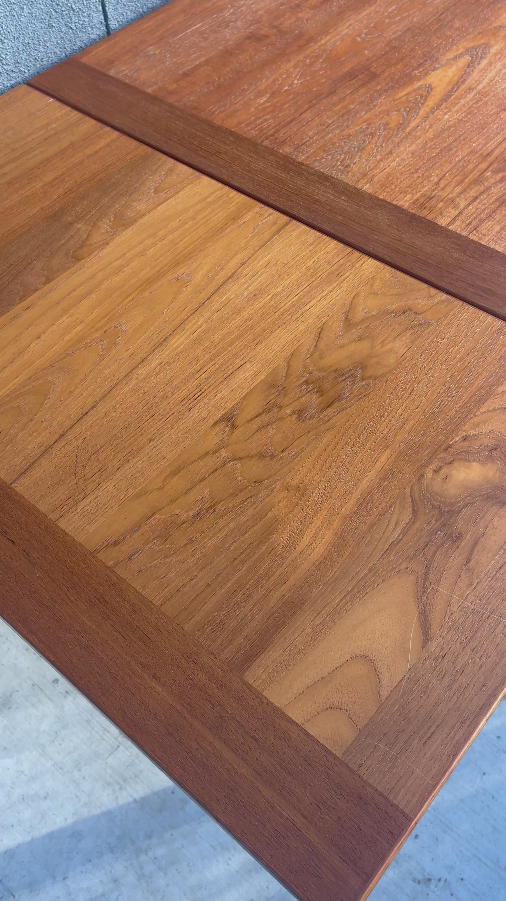 Danish Modern Teak Veneer Expandable Dining Table with 2 draw leaves. Just conditioned and is ready for its new life! 2 leaves slide in and pull out from the narrower ends.