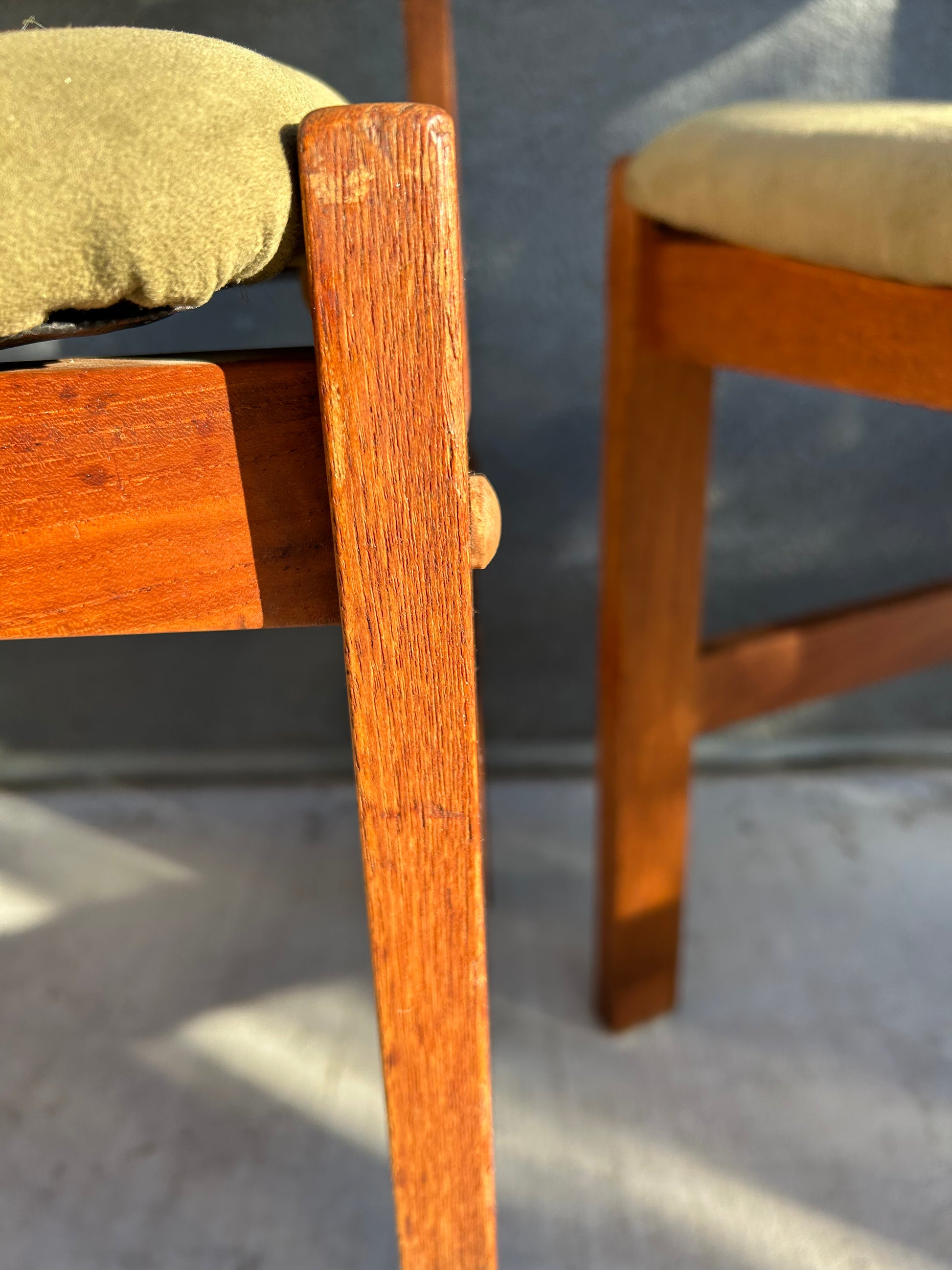 Structurally sound, teak screw covers recently replaced along with brand new faux green suede upholstery. No makers mark visible. Frames show some signs of wear as pictured.