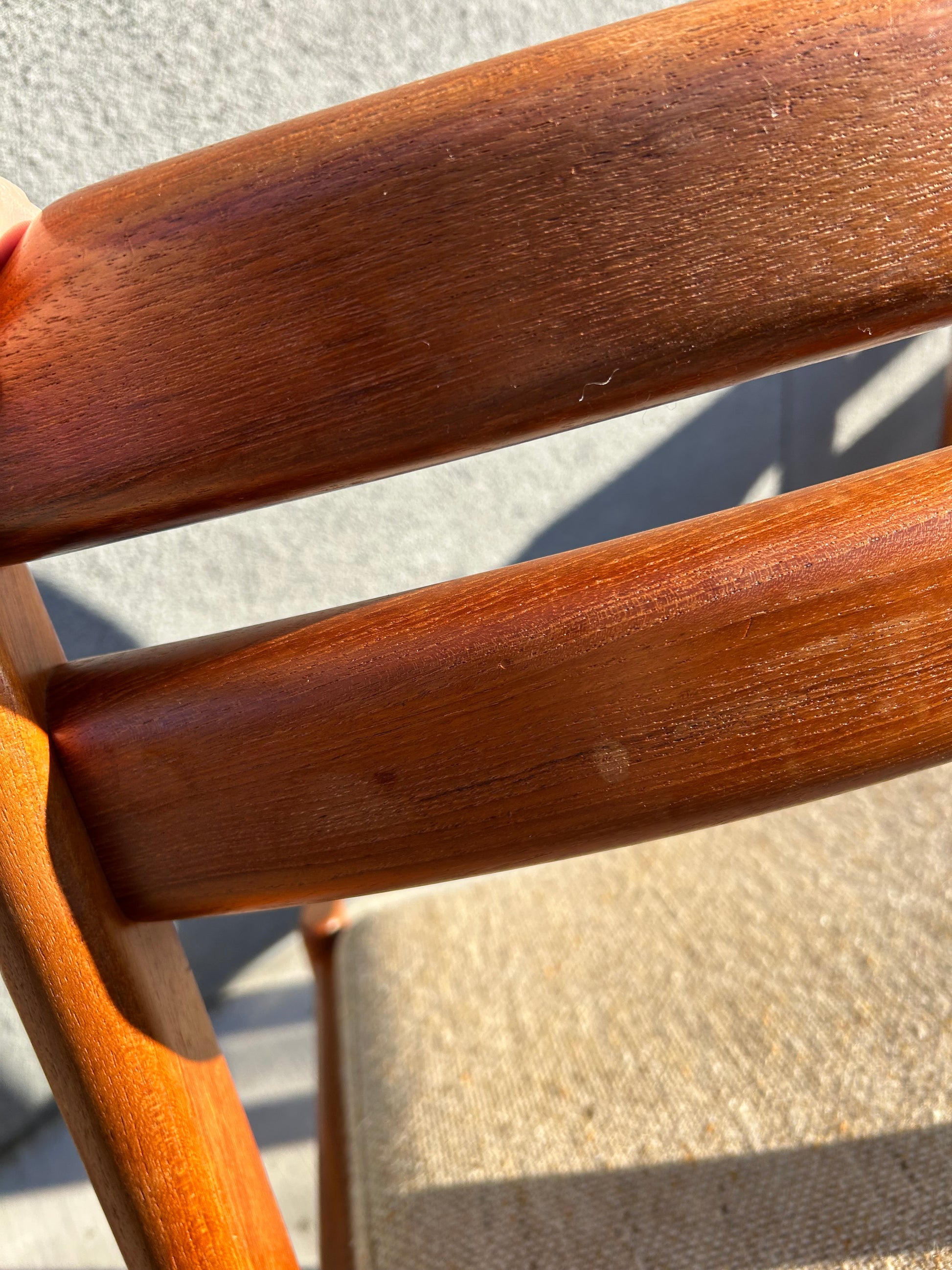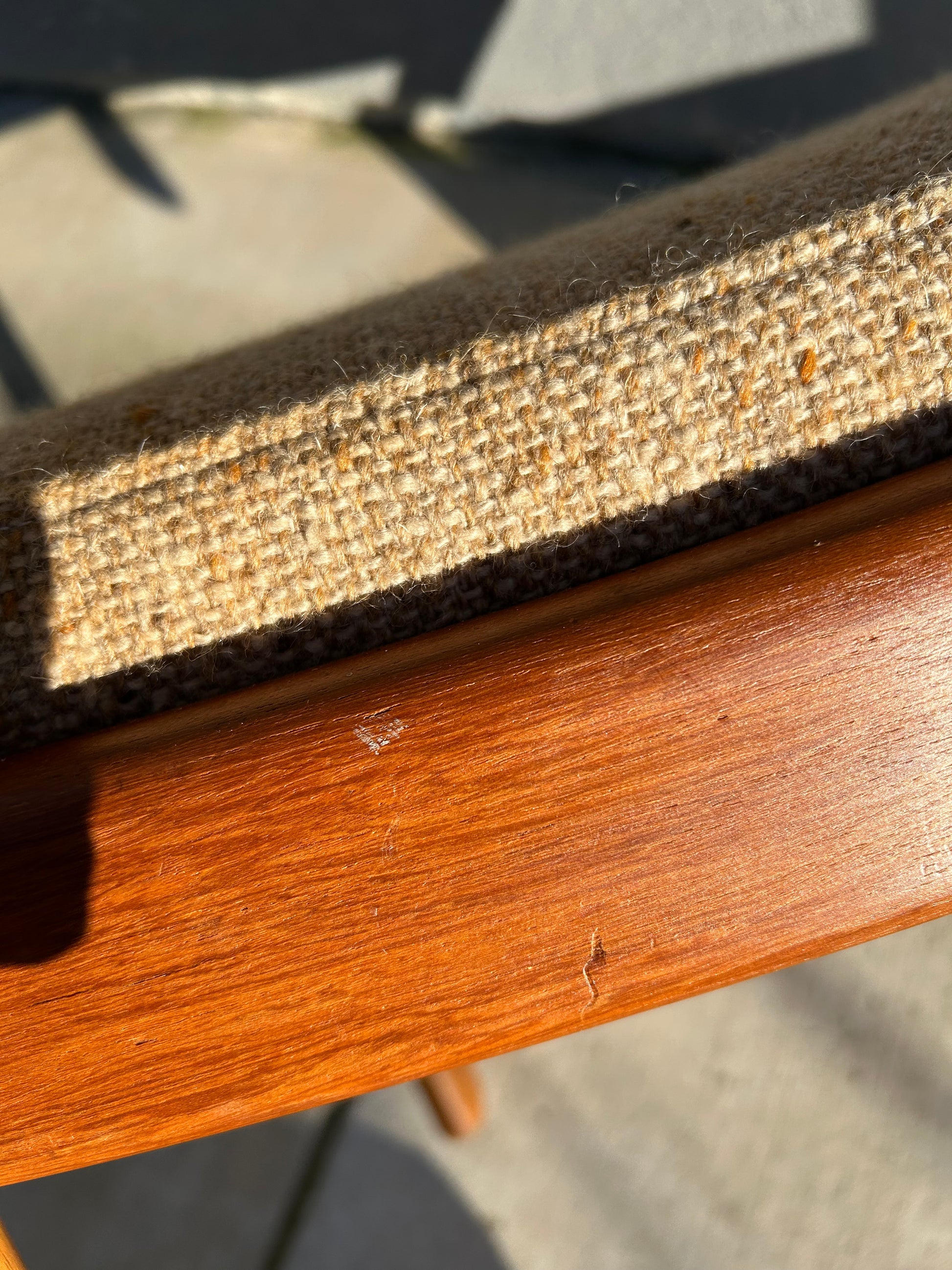 Excellent structural condition with some minor wear and tear to teak finish as pictured. Wear and tear is consistent with age and use. Original upholstery in excellent condition with no stains or tears. Makers mark located under chair seat.