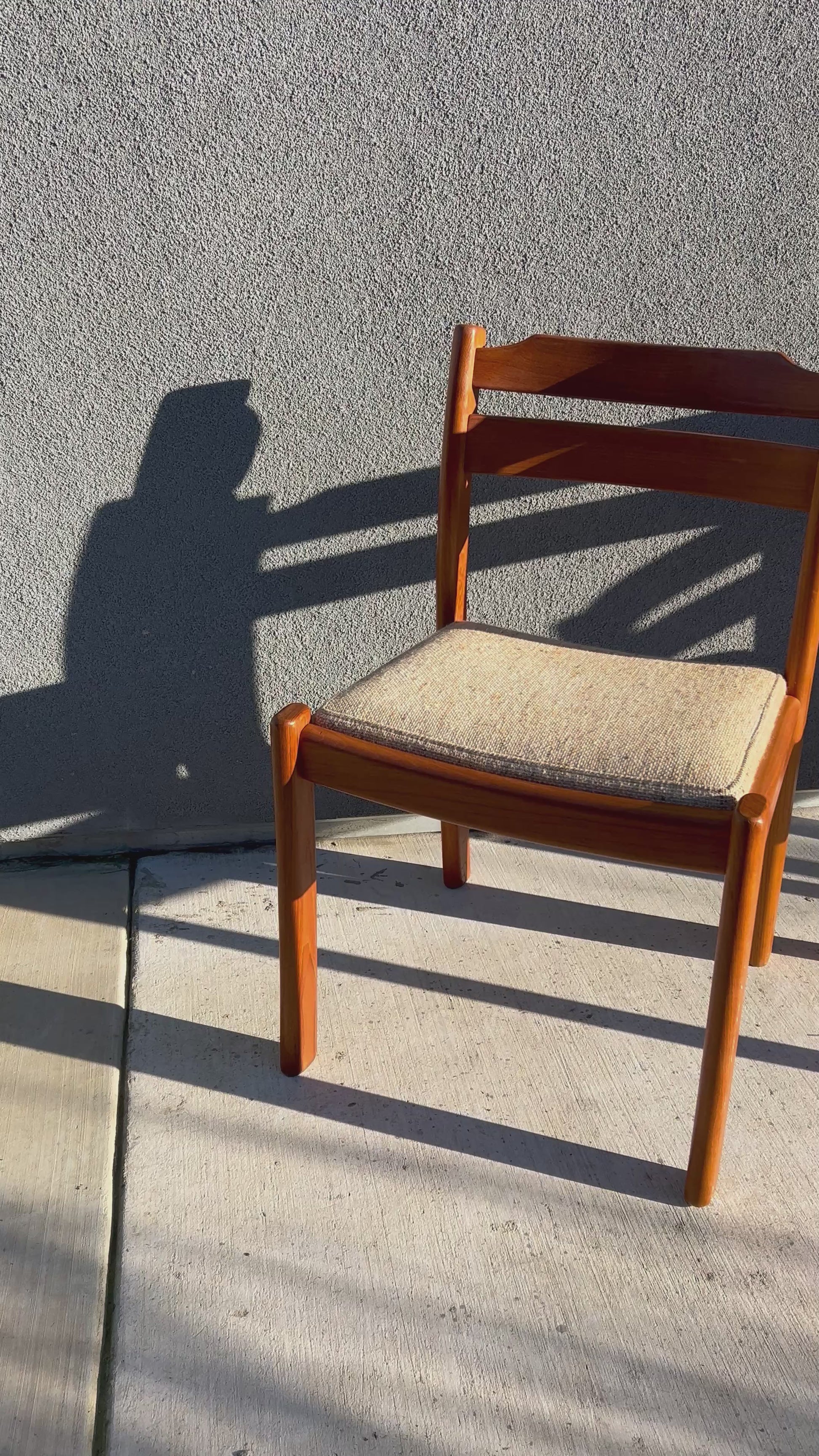 Up for sale is a beautiful Set Of 4 Dyrlund Danish Mid Century Modern Solid Teak Chairs. They feature modern MCM lines, solid teak construction, original upholstery, and would accent any décor with tasteful elegance.