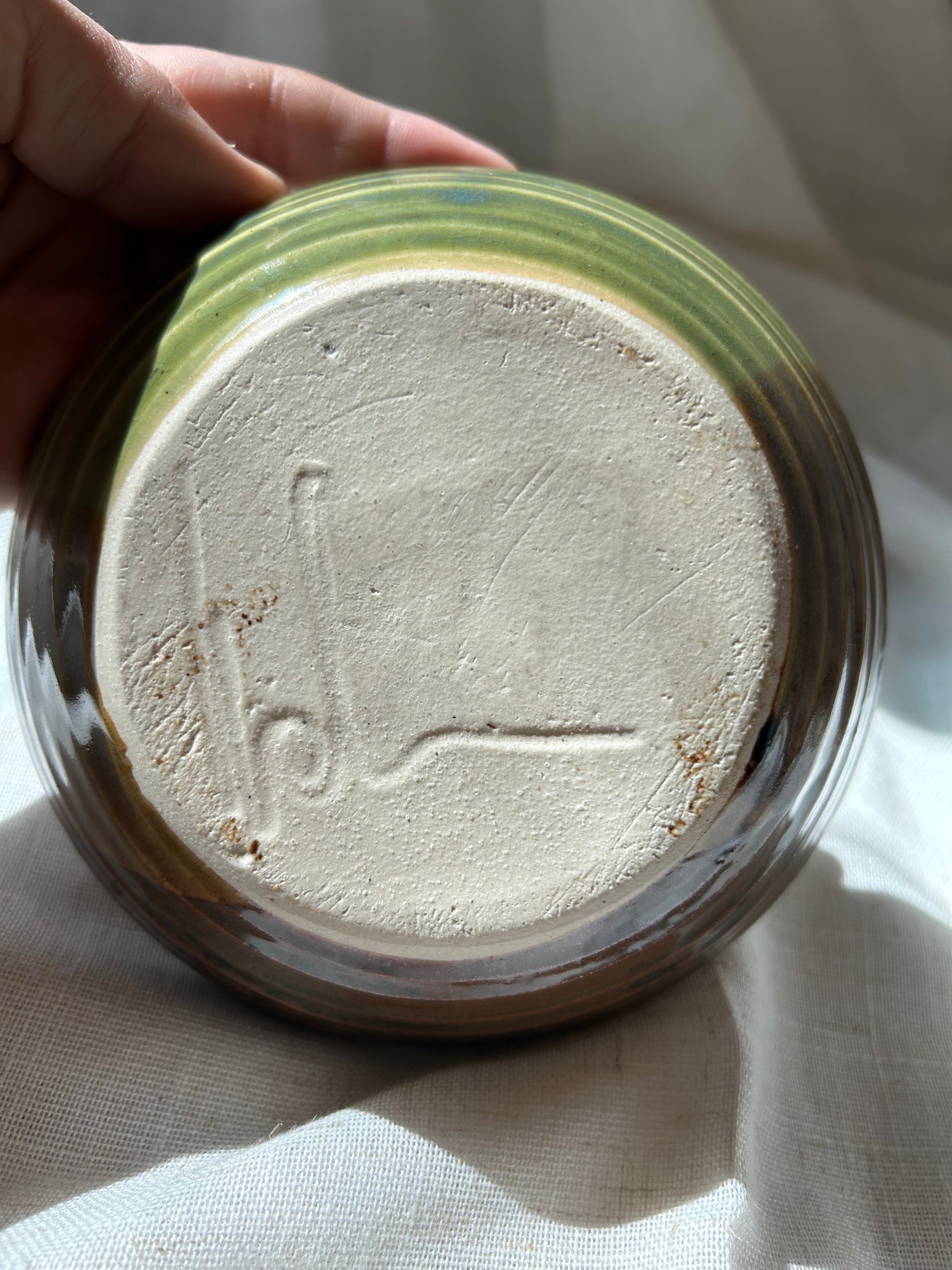 Colors include brown, green, chocolate. Signed by maker on bottom.