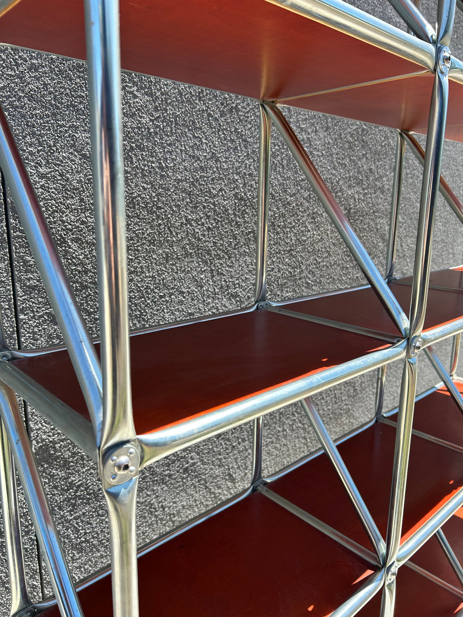 System 180 furniture shelving construction system. Great for books, record storage, and your favorite trinkets and collectables. Steel chrome tube frame and coated MDF surfaces. Circa early 1990s. Designed by Jürg Steiner, made in Germany.