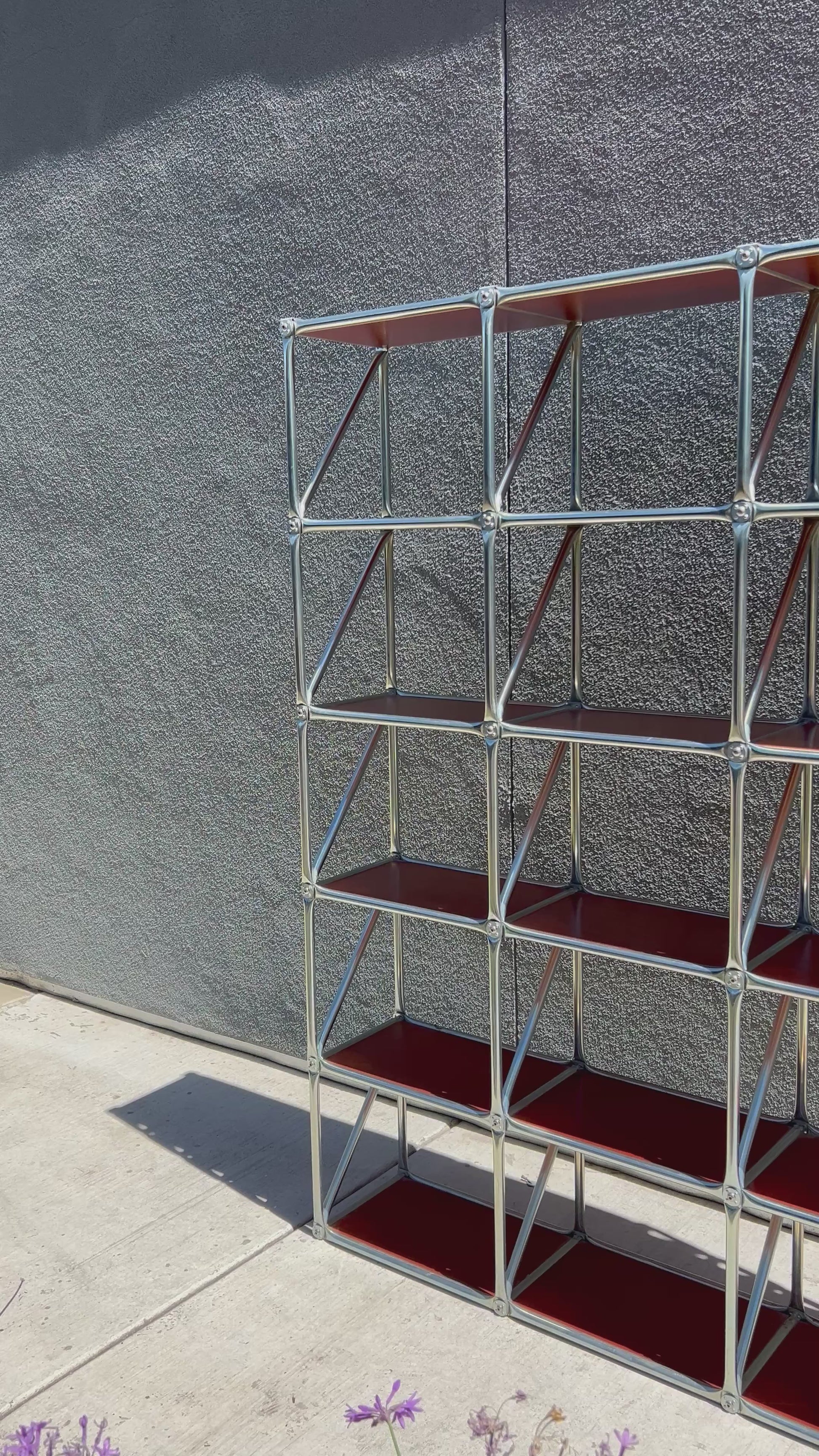 Shelves may appear more red due to the sunlight. They are a warm brown in low light.