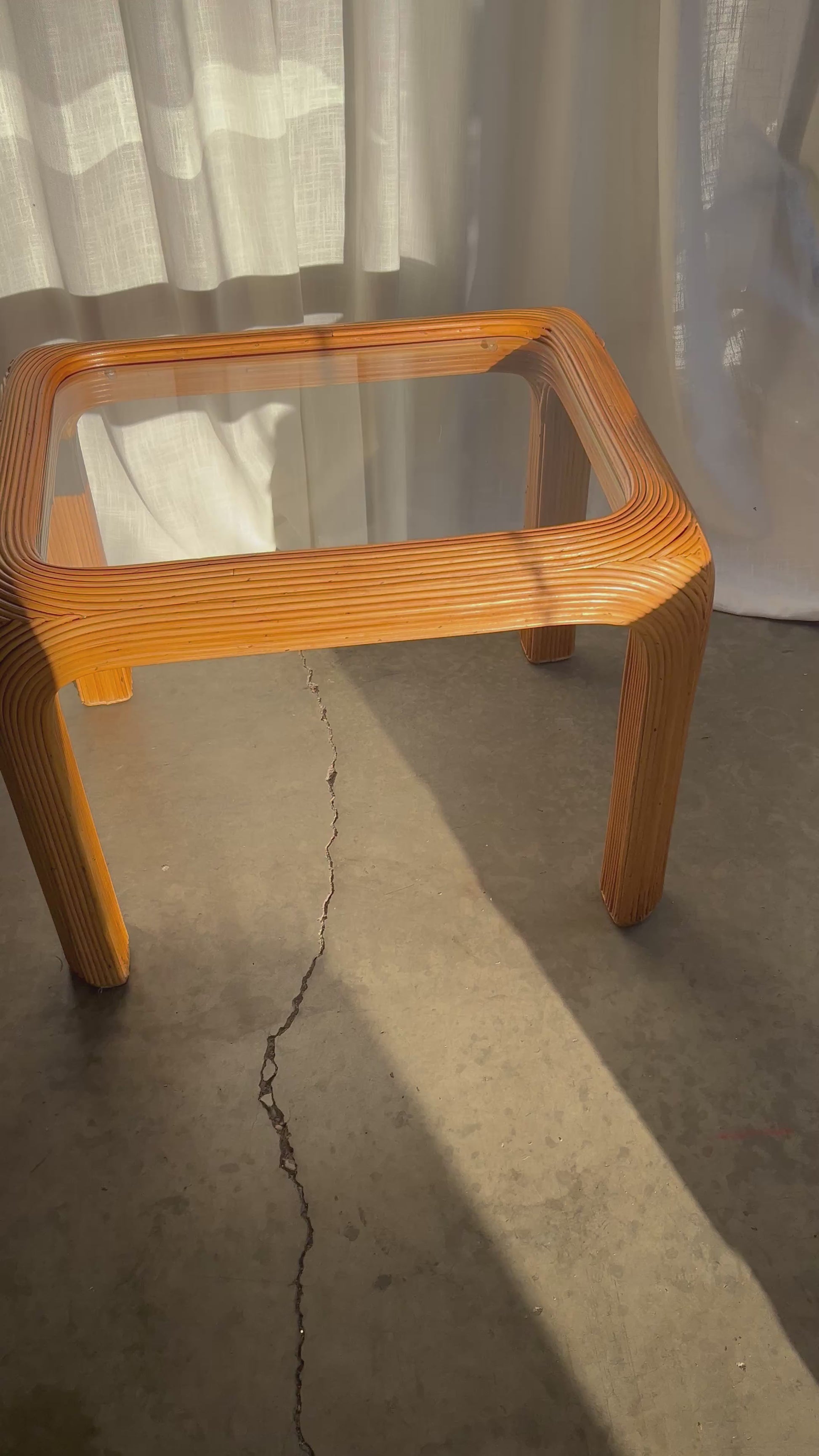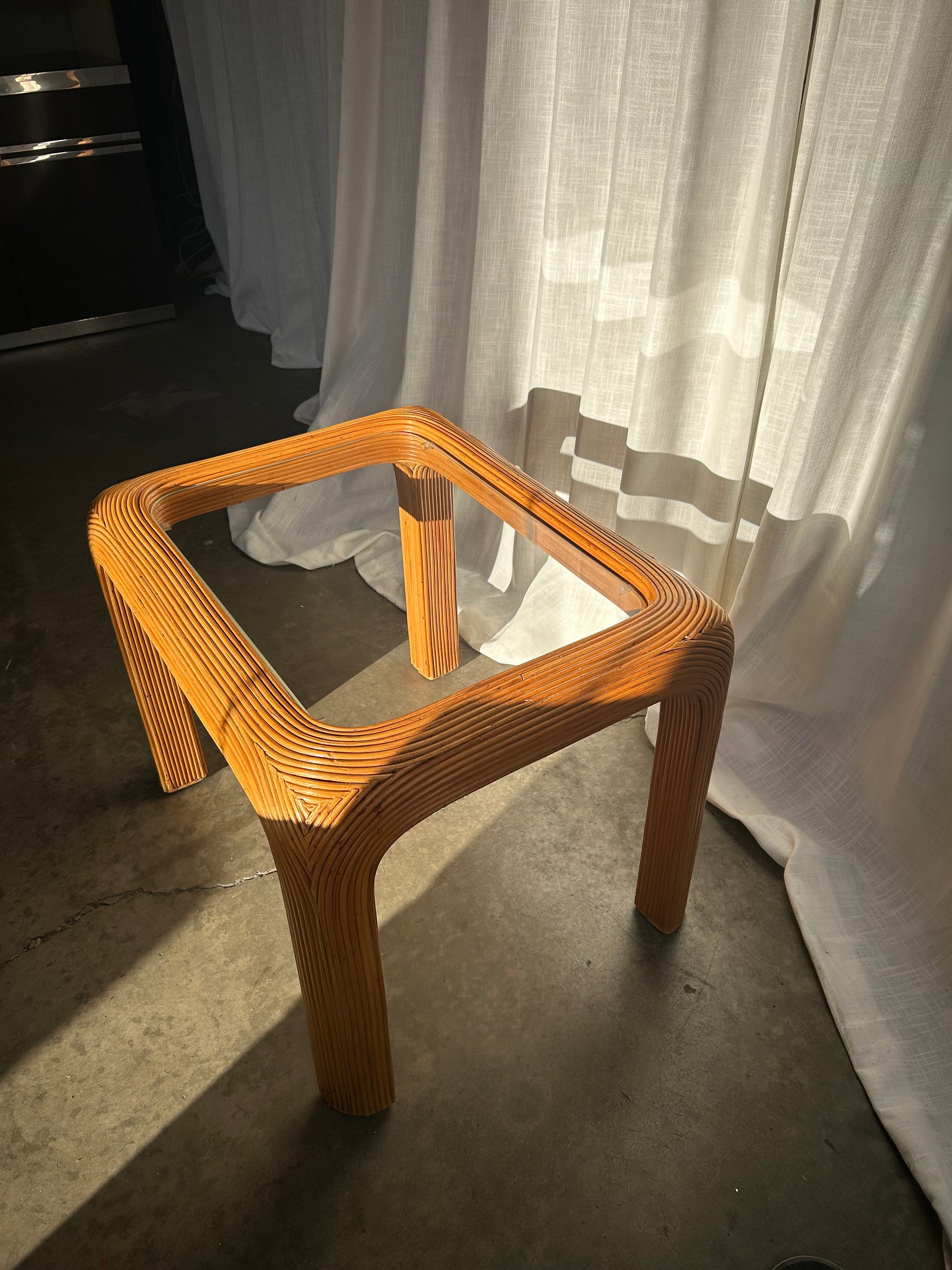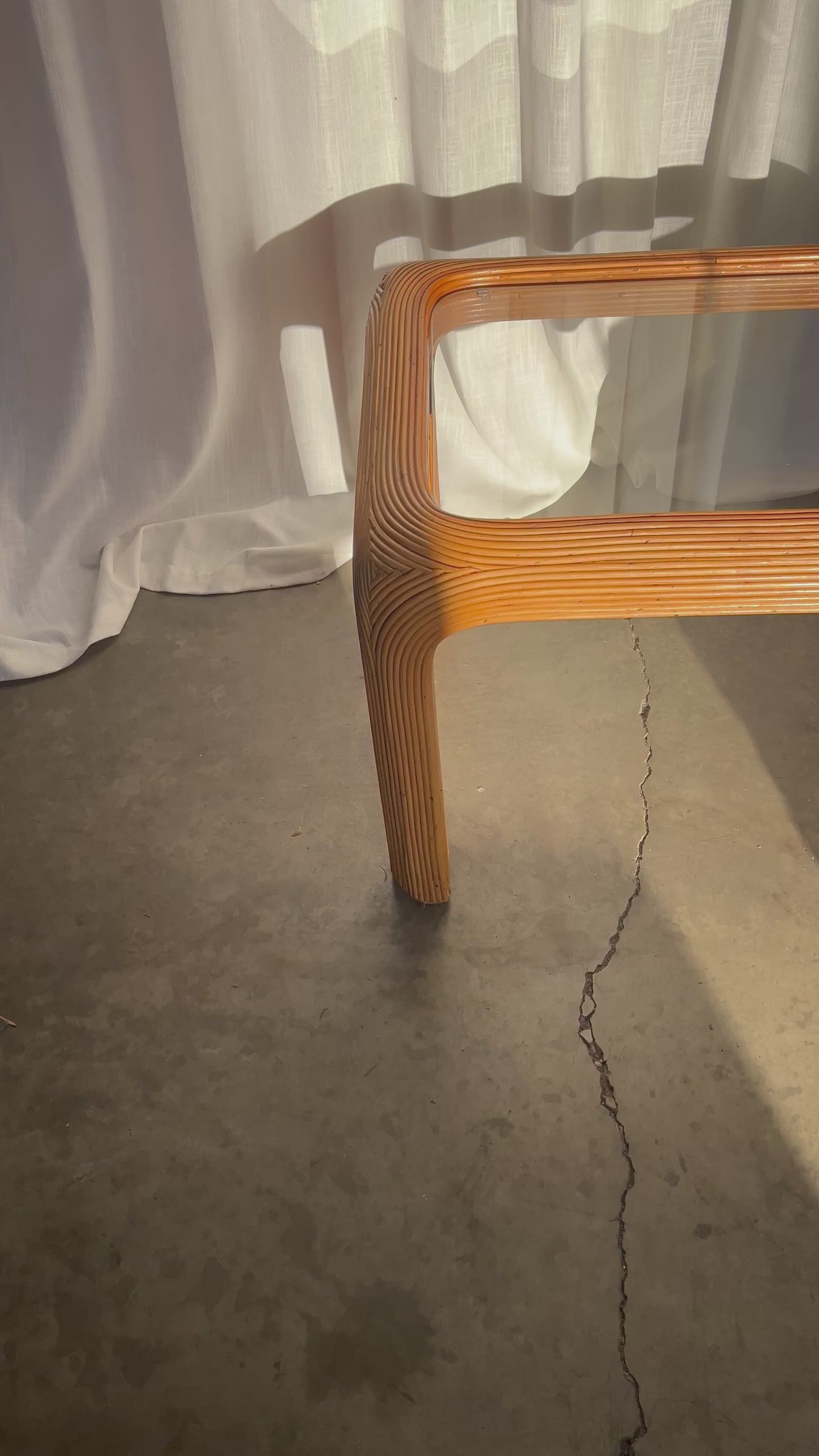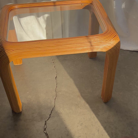 A stylish Mid-20th Century pencil reed rattan side table showcasing bold lines, curved edges, and timeless coastal appeal. The table features a handcrafted waterfall silhouette with a meticulous pencil reed wrap and an original glass top for a clean, polished look. Solid and sturdy with natural imperfections. Ideal as a side table or nightstand in a coastal, bohemian, or tropical-inspired interior