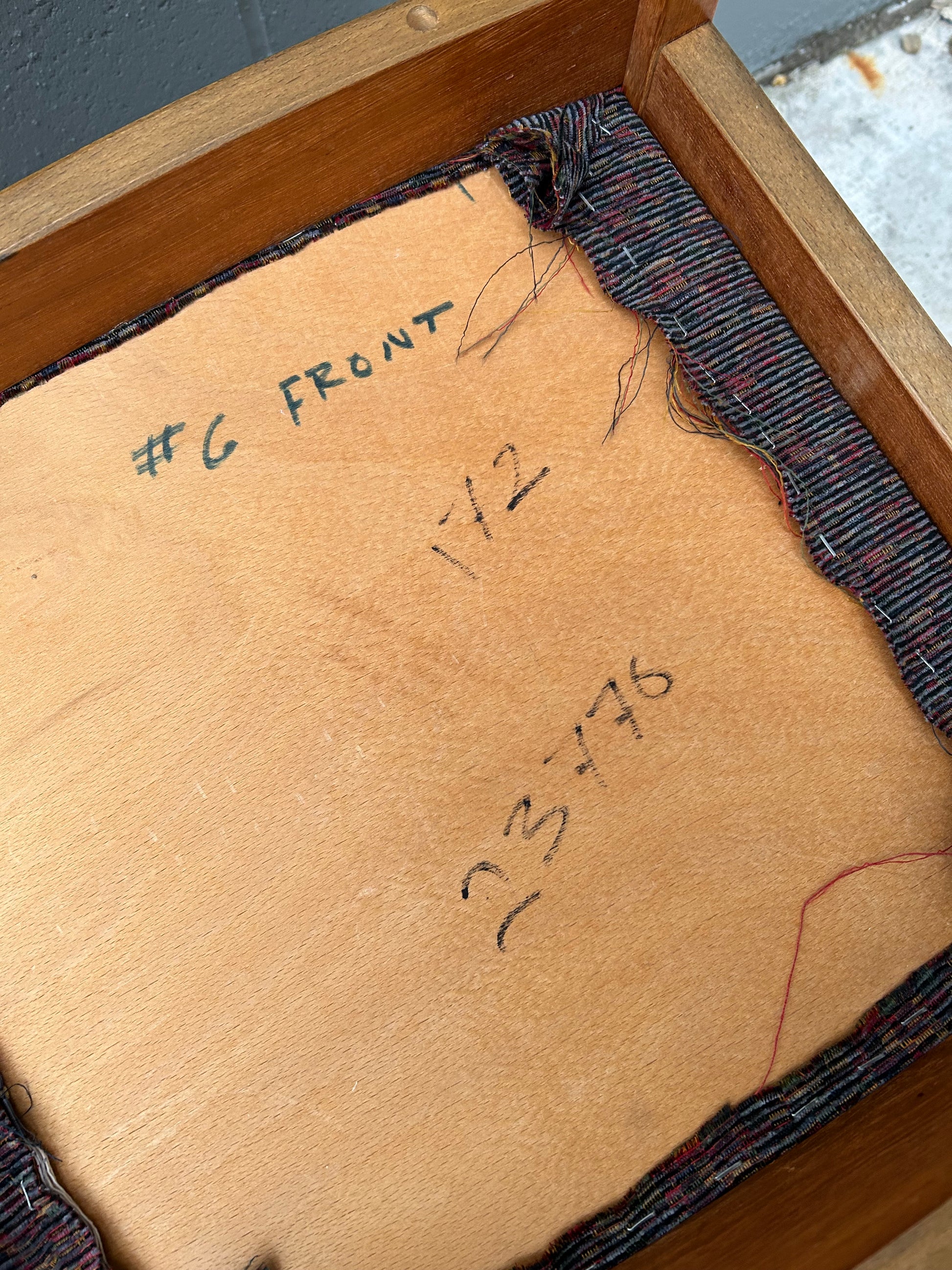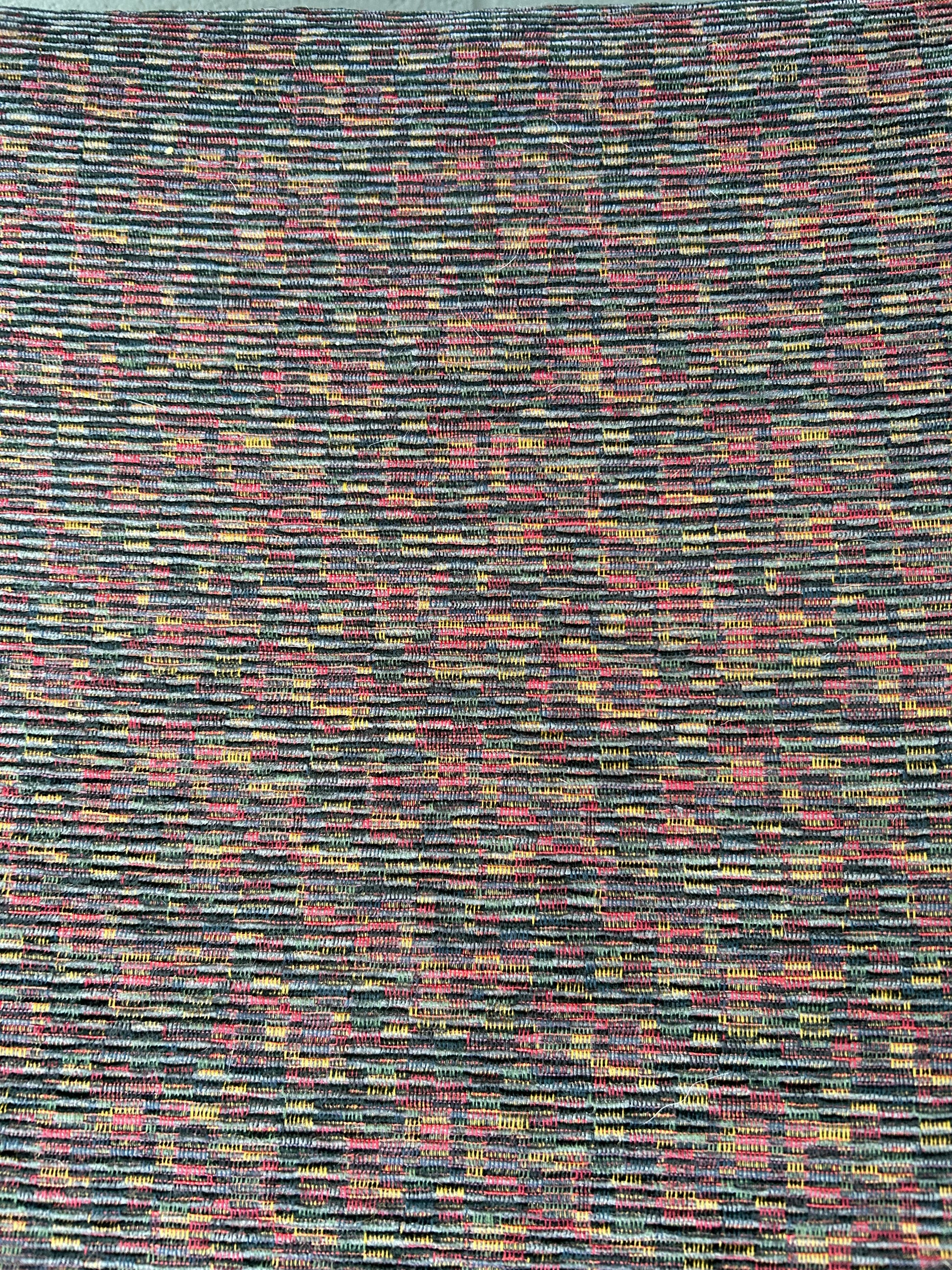 A set of six Danish Midcentury teak dining chairs with non- original fabric upholstery. Very solid original condition. Fabric has hints of blue, red, green, purple and yellow.