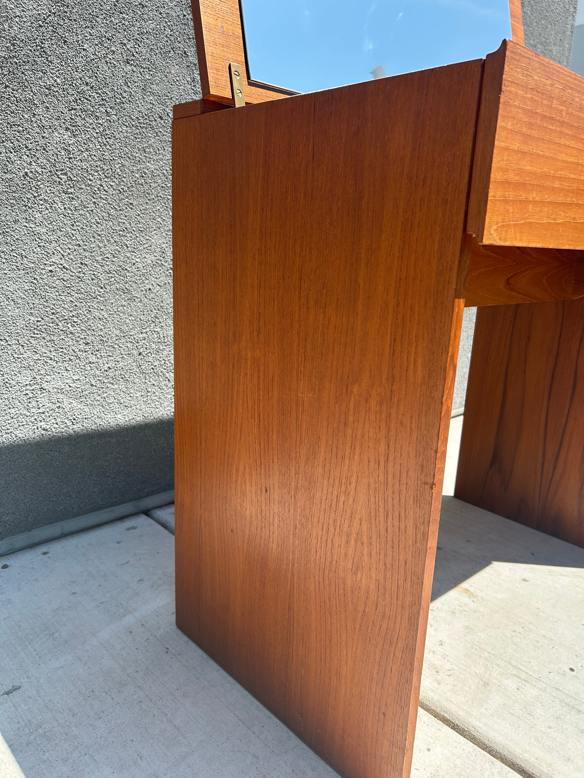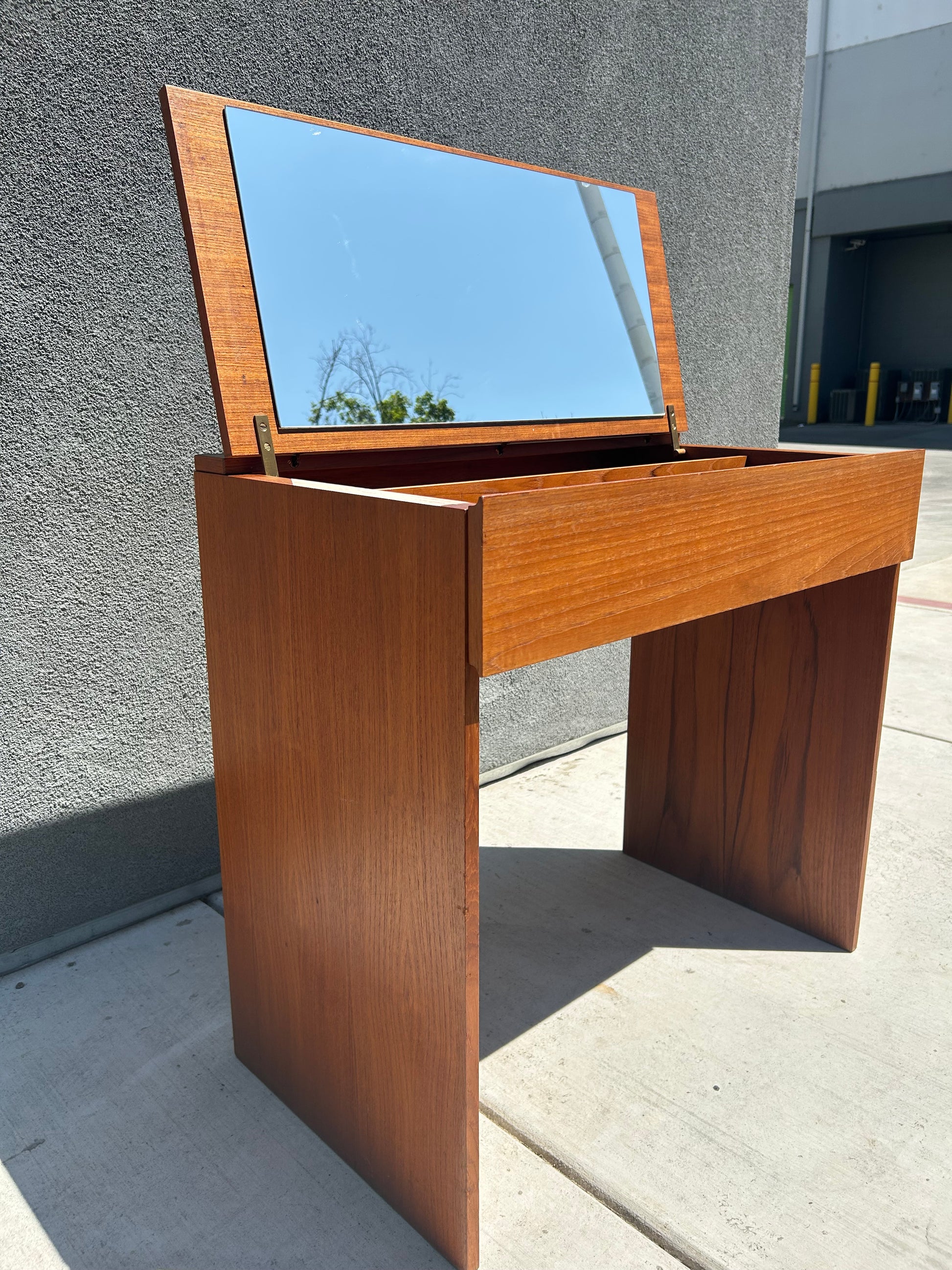 Mid century Danish Modern teak make up vanity or desk. Beautiful light teak color with a nice recently conditioned teak veneer grain. Flip top mirror with brass ring pull opens to a sliding felt lined jewelry box with two lower sections for make up storage. Simple symmetric design - good lines. Shows very little use.