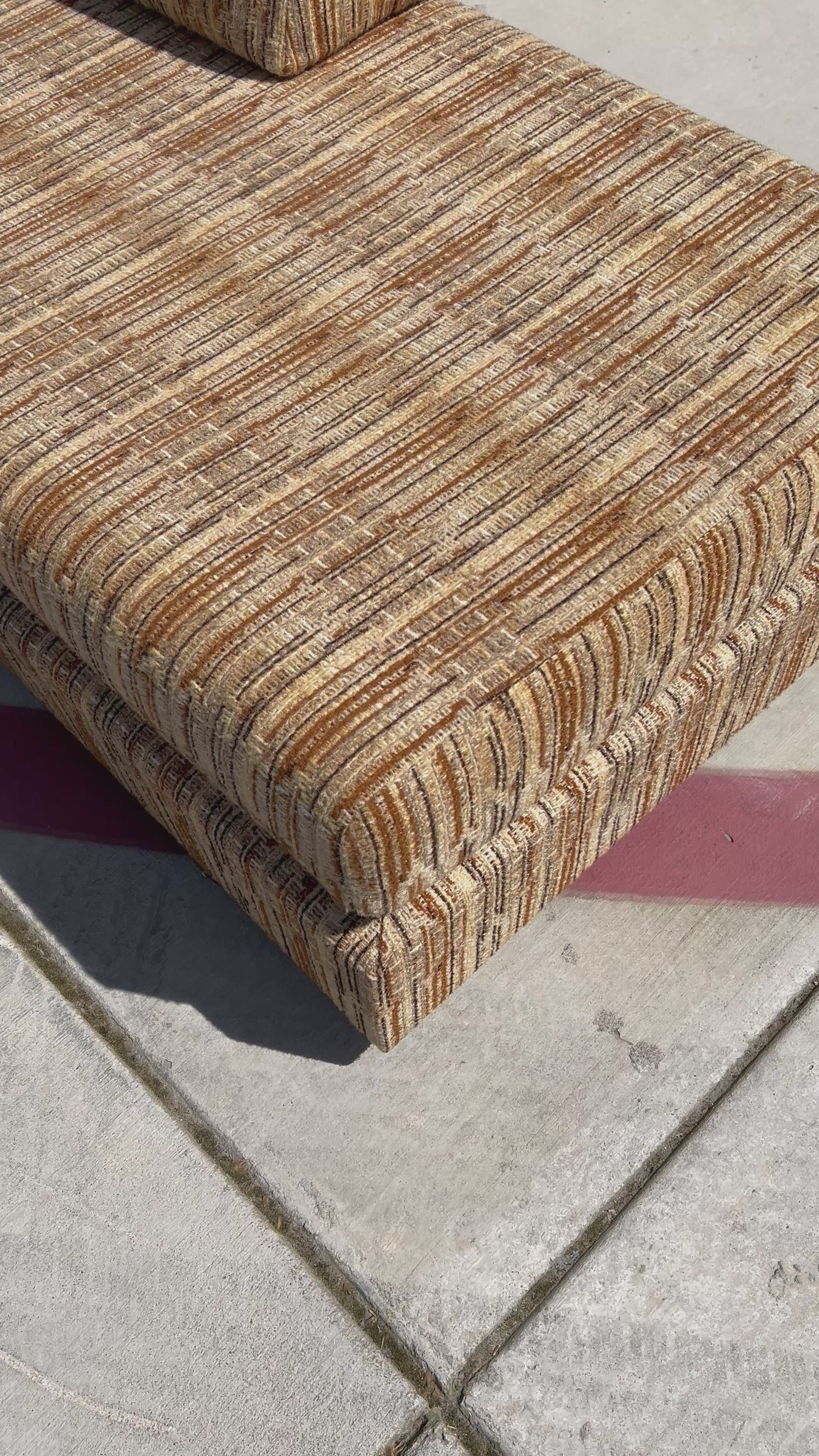 This Modular Sofa set includes 2 twin size daybeds with matching backrest pillows. Both rest on castor wheels for easy mobility. Enjoy them in your groovy living room, den or in a flex office/guest space where they can be joined to make a temporary king bed. Maker unknown.