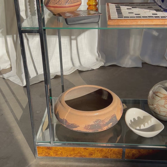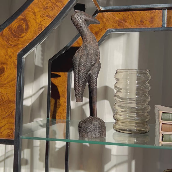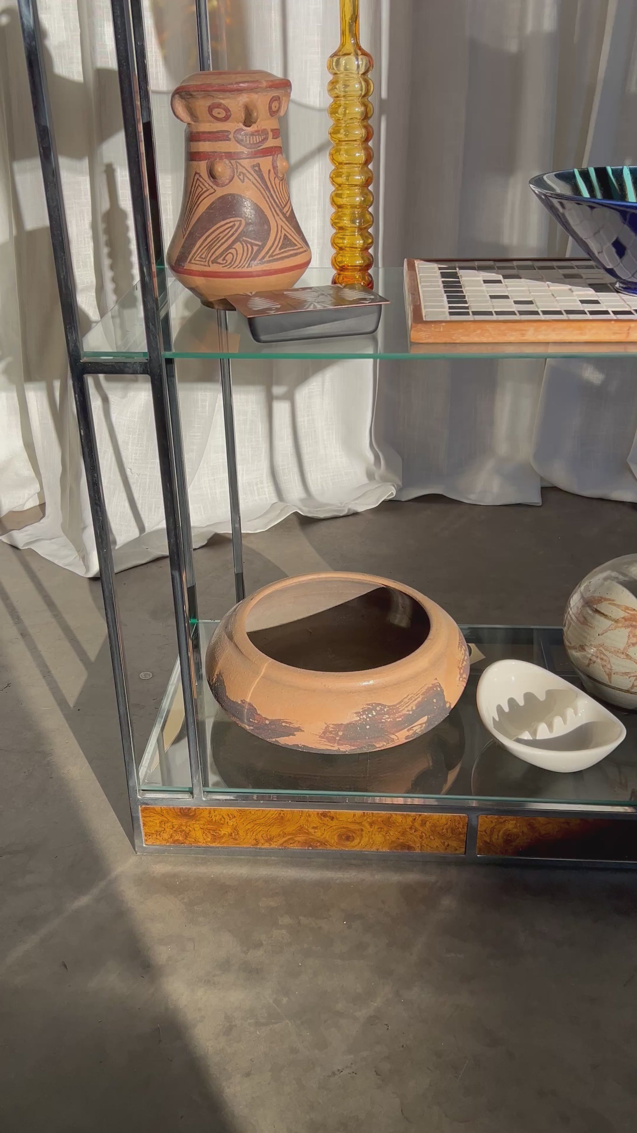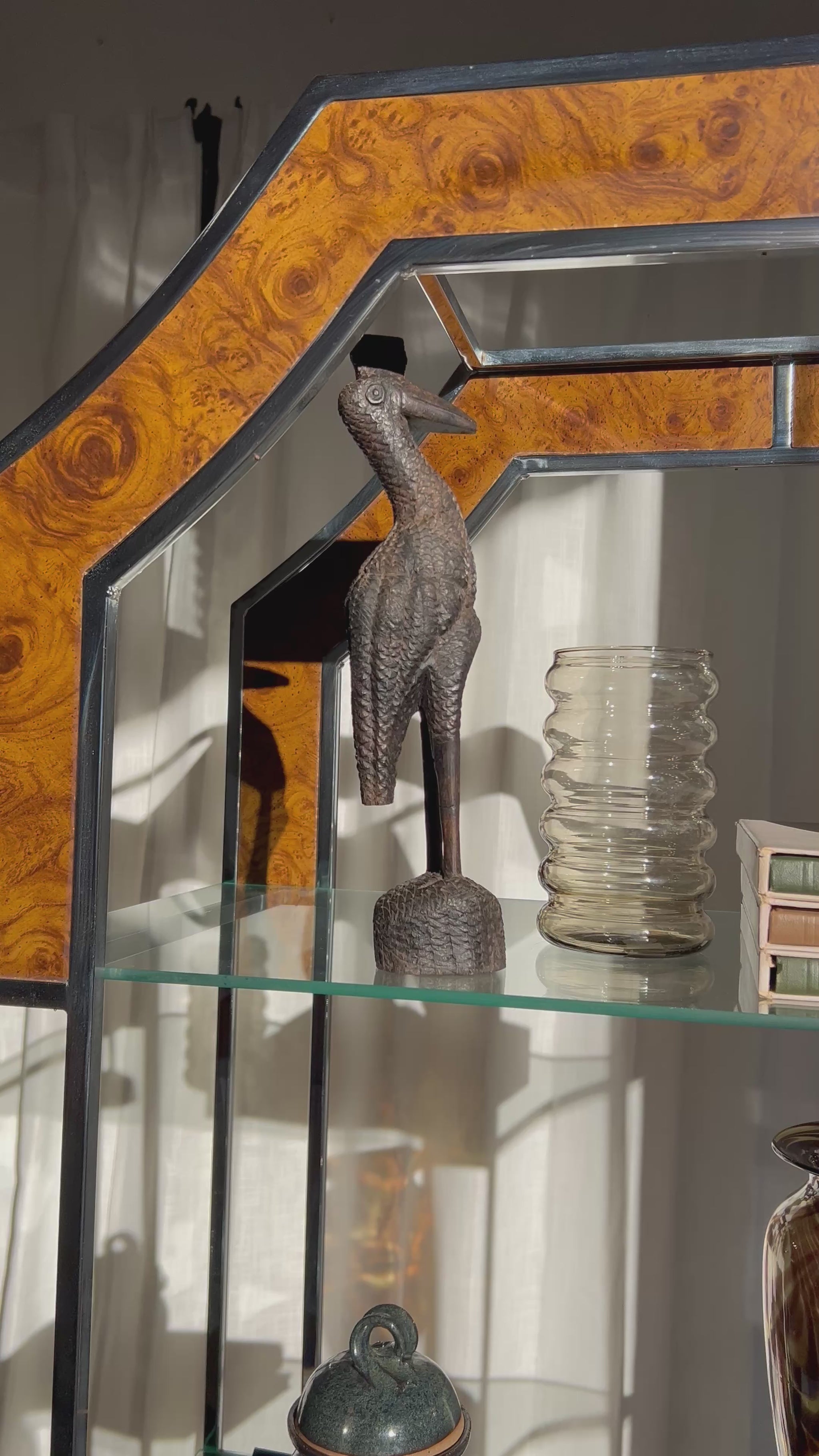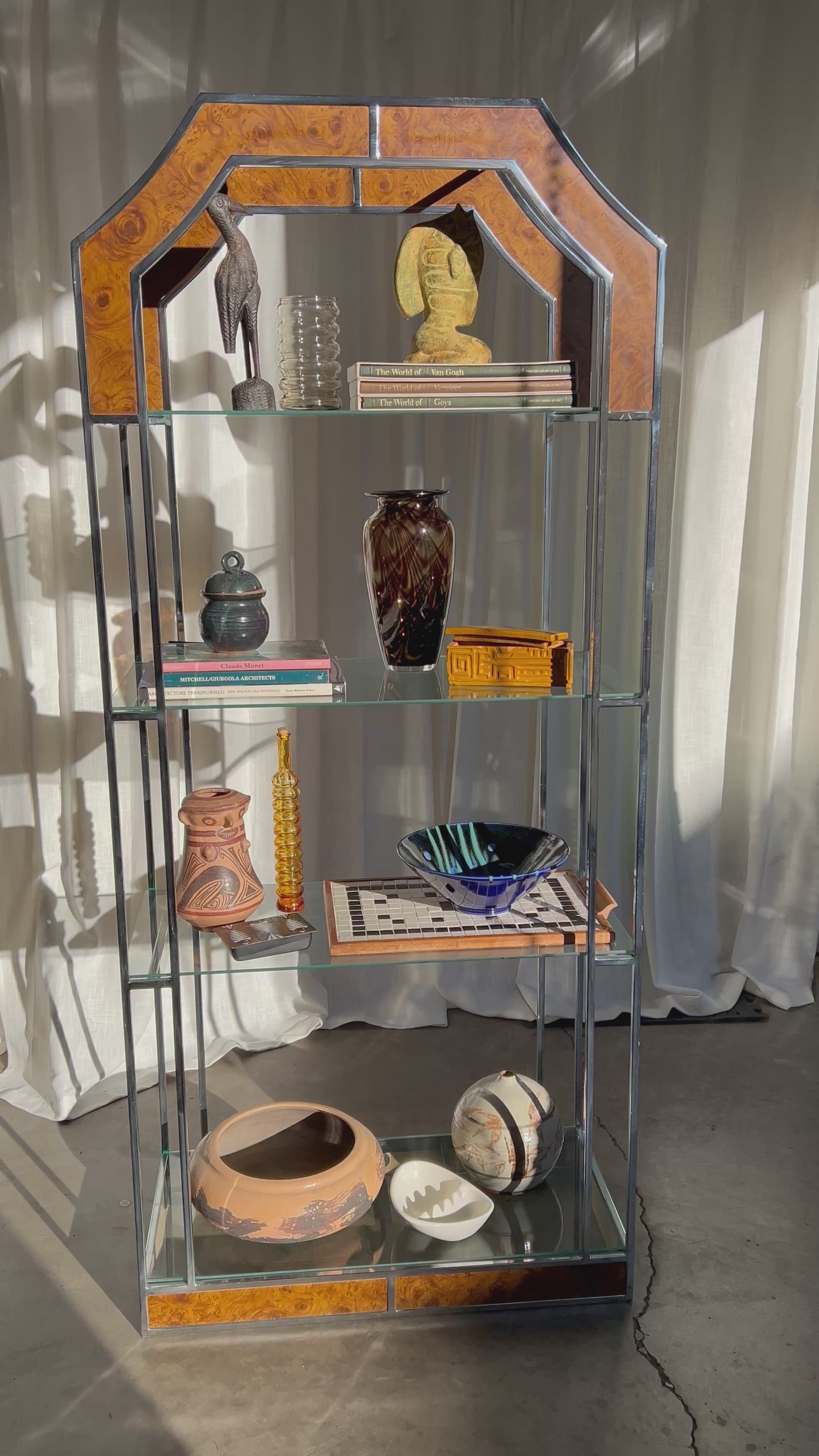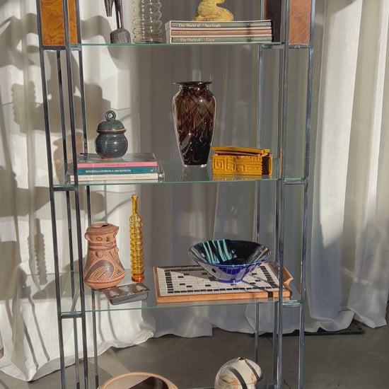 Architectural vintage étagère featuring a polished chrome frame, burl wood inlays, and floating glass shelves. The octagonal arch top adds sculptural interest, while the open design keeps it light and versatile.