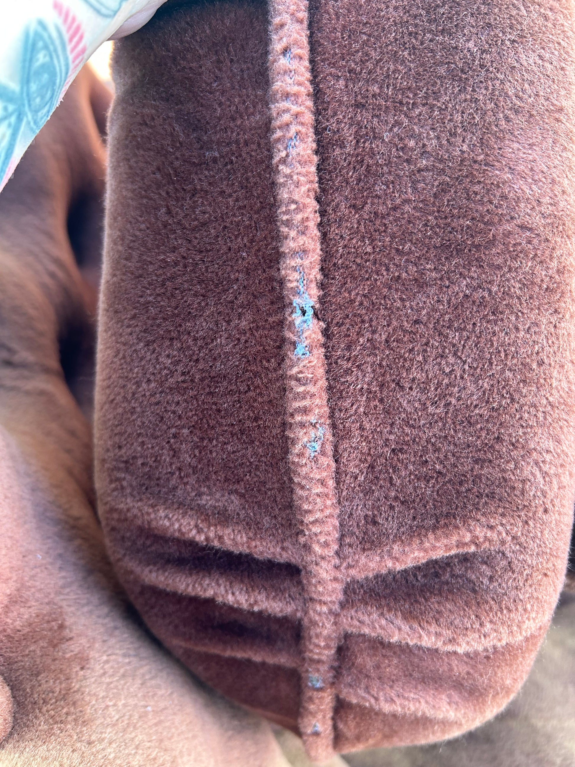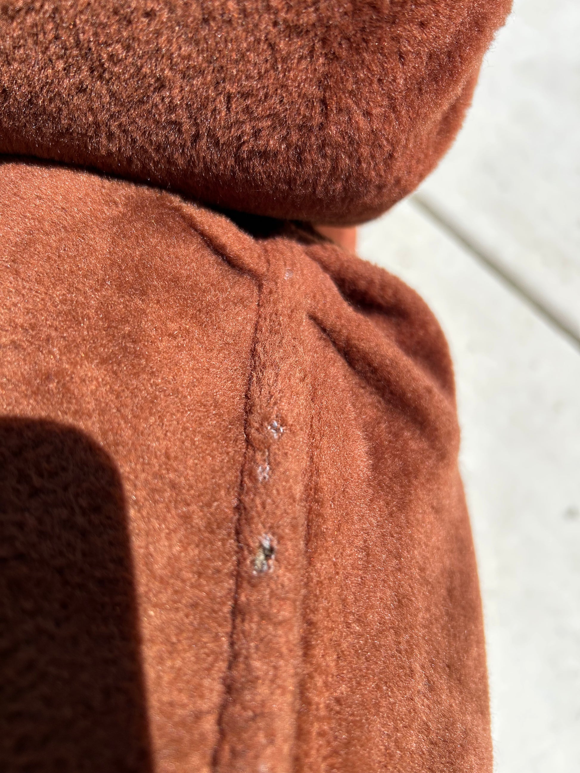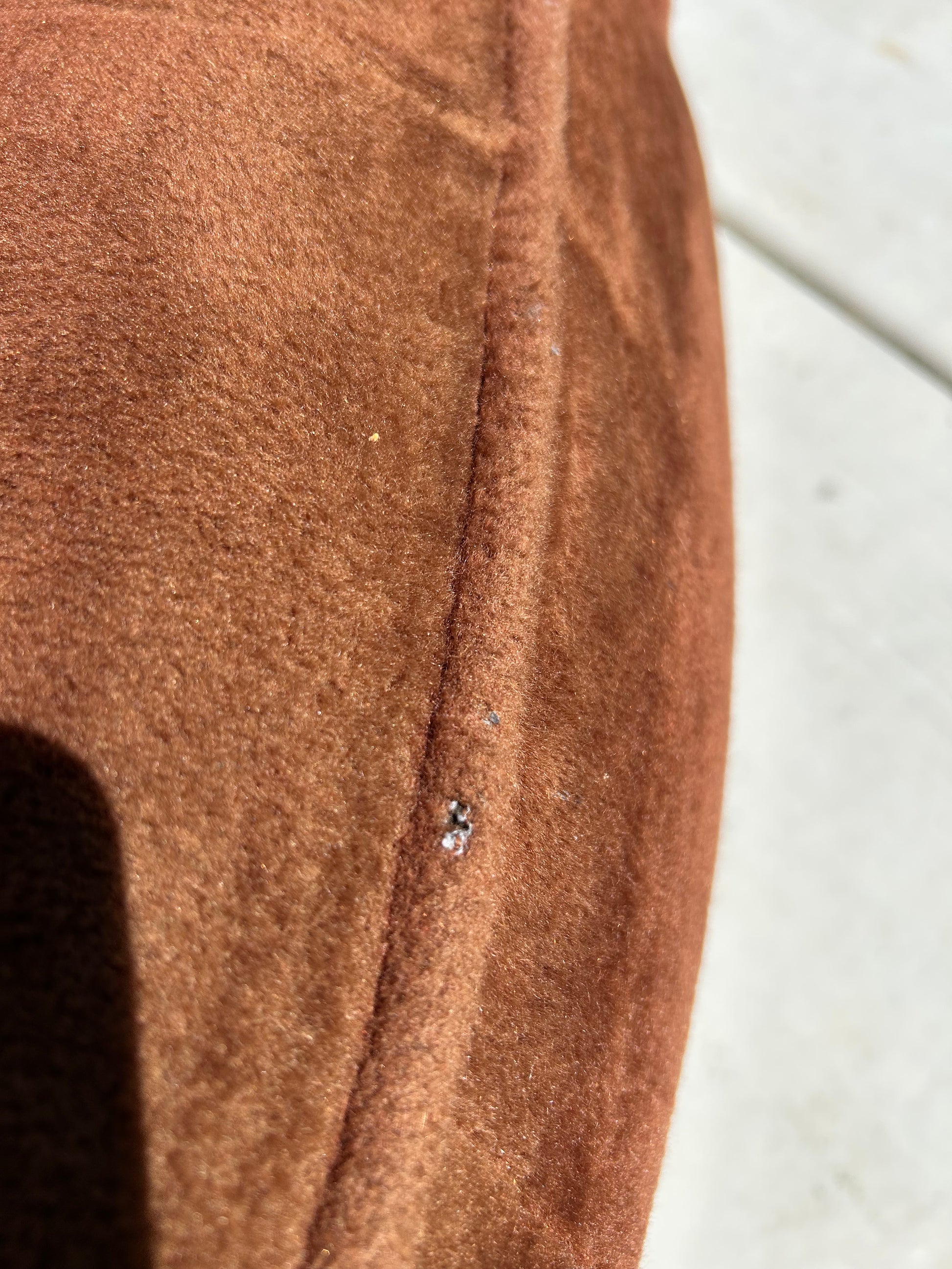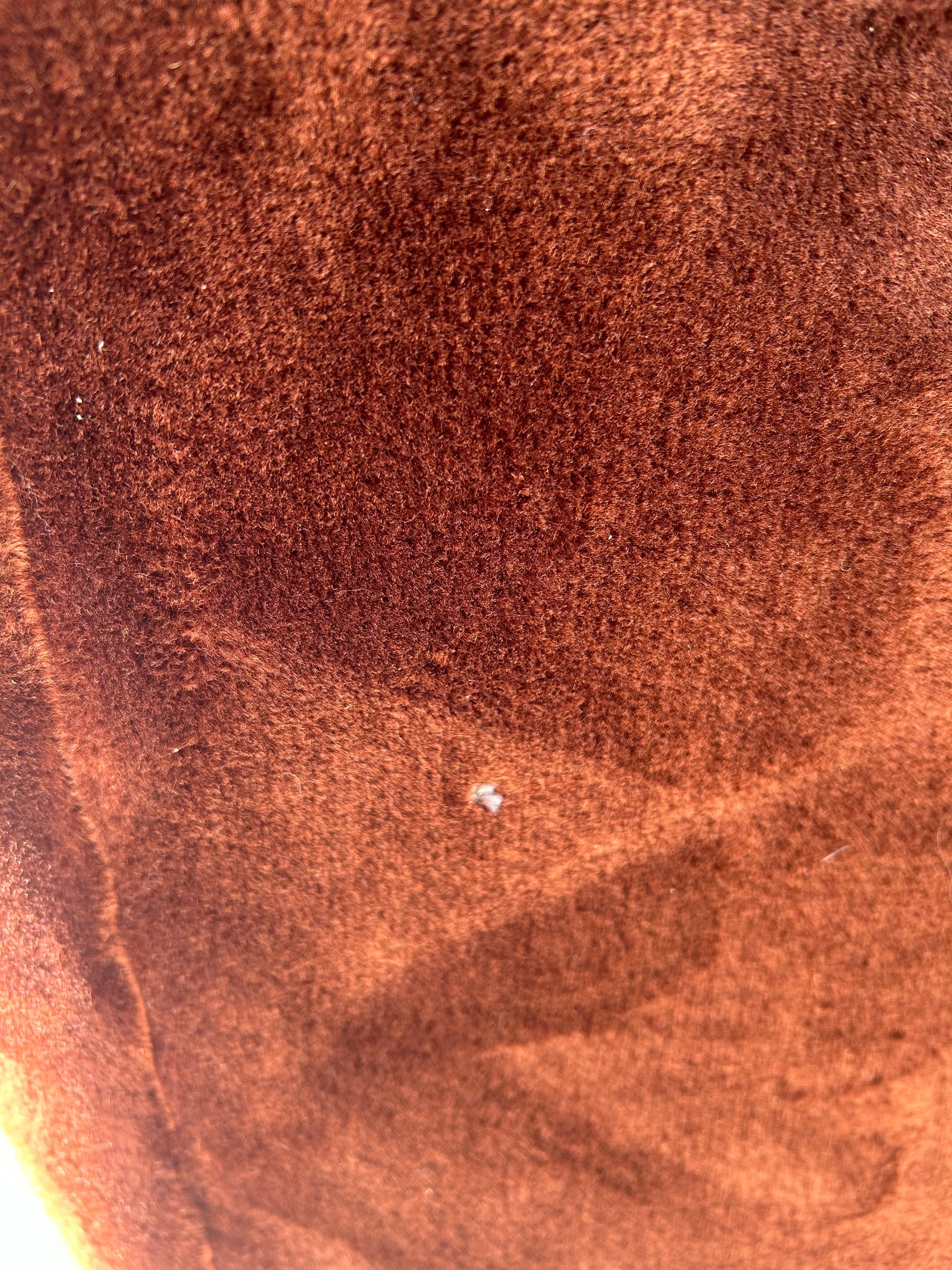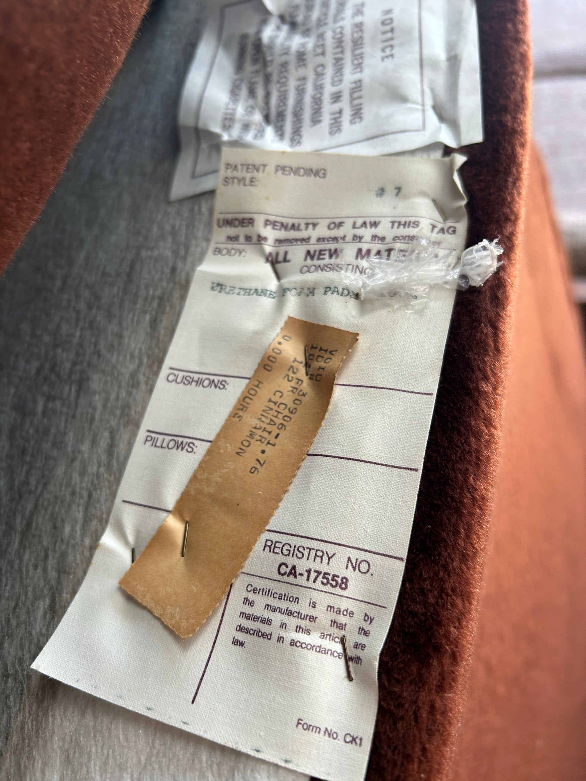 Original 70's reddish chocolate upholstery in very good overall condition. No stains or large tears. Some small imperfections on side piping and one very small hole on back. See photos.