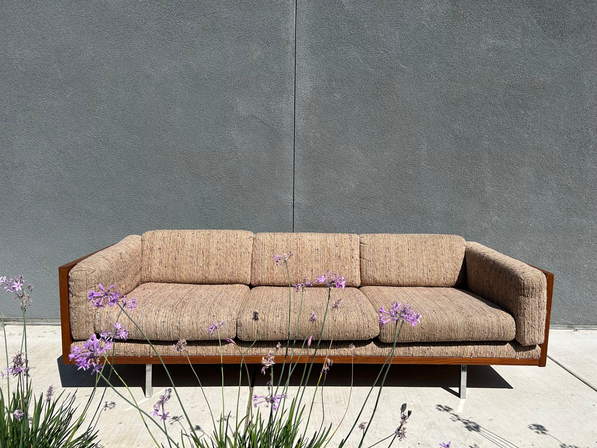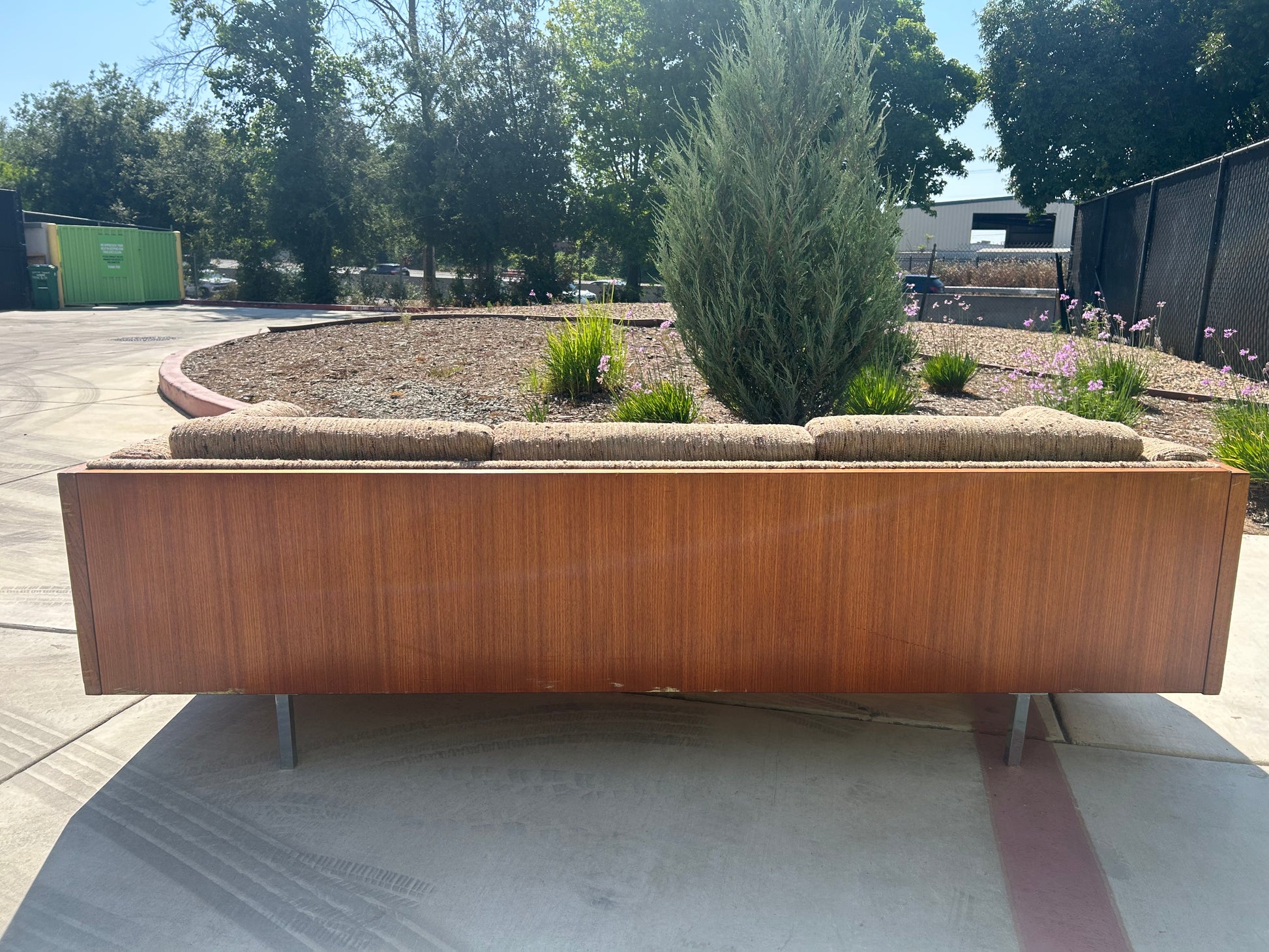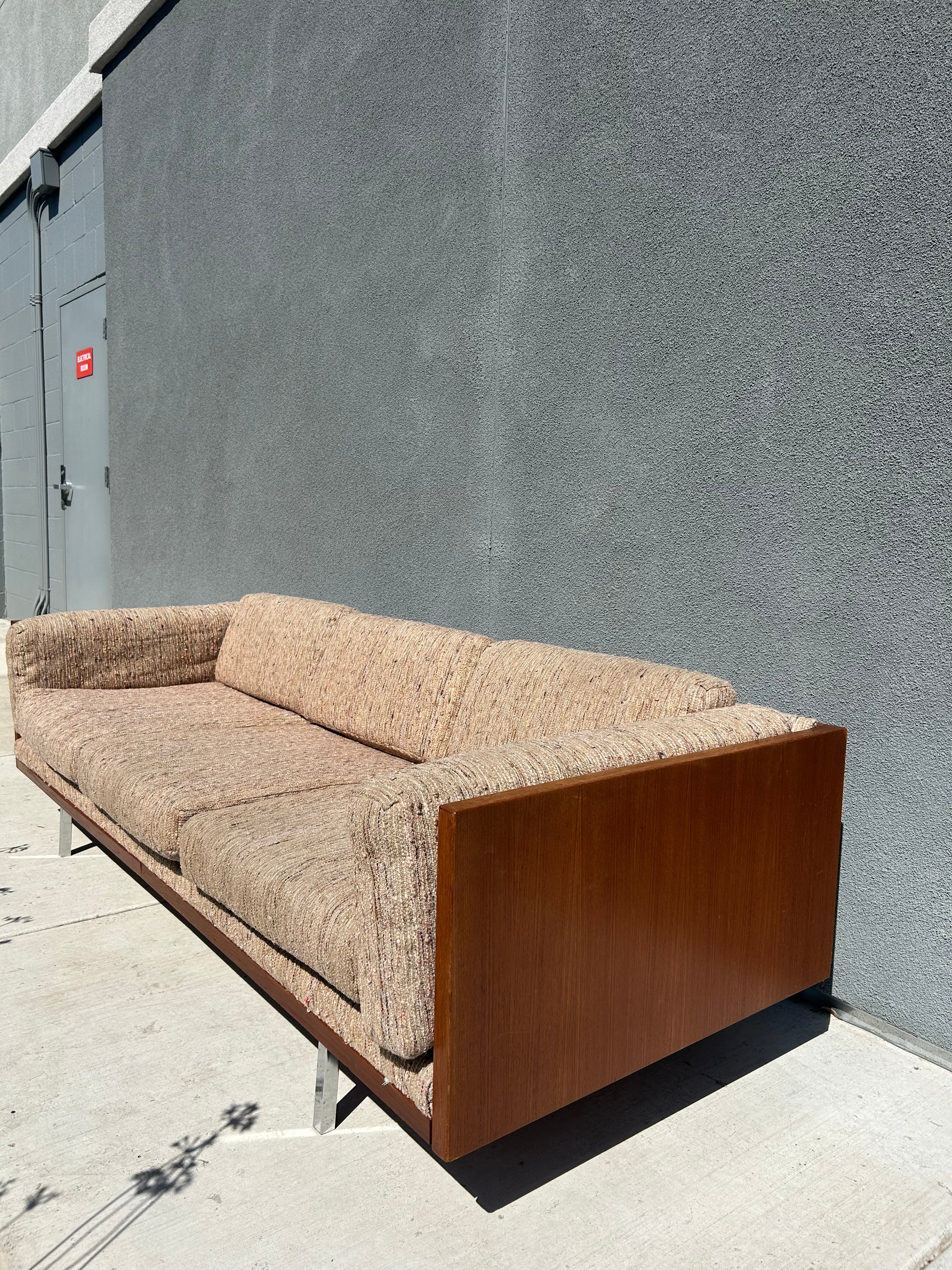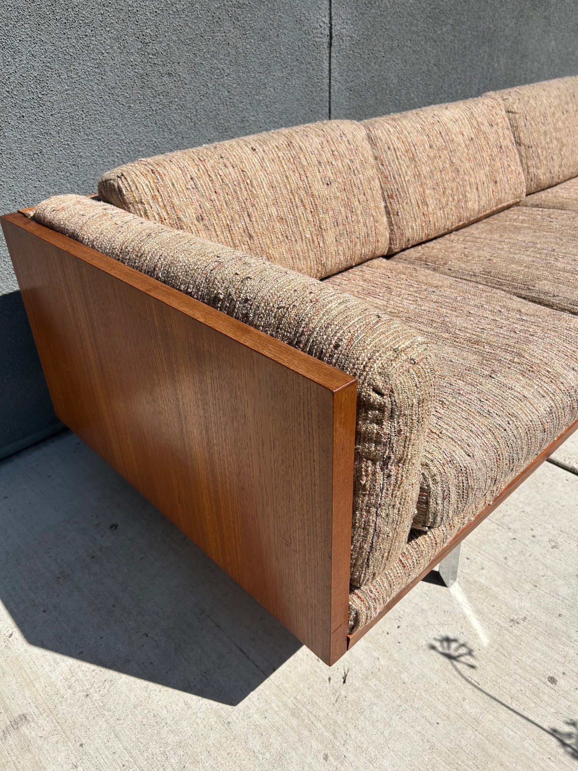 A rare Danish Teak cased sofa by Komfort with original upholstery (also known as a clad box sofa). Three-panel wood frame is finished in a stunning wraparound expanse of bookmatched Teak veneer on the back and both sides of the arms. Teak has been resealed and stained with some remaining wear. Inside of back is upholstered. Sits on polished steel legs.