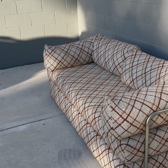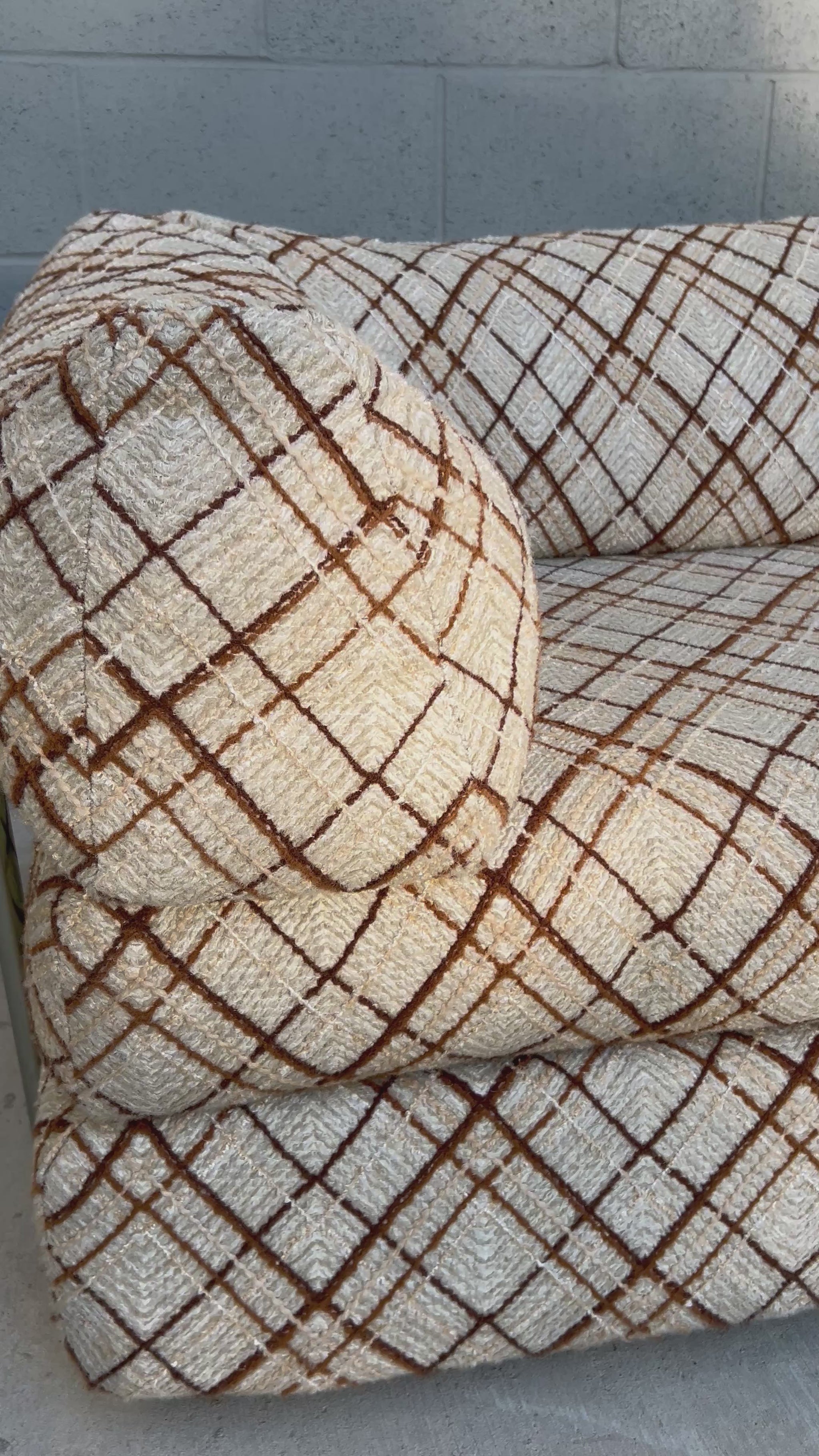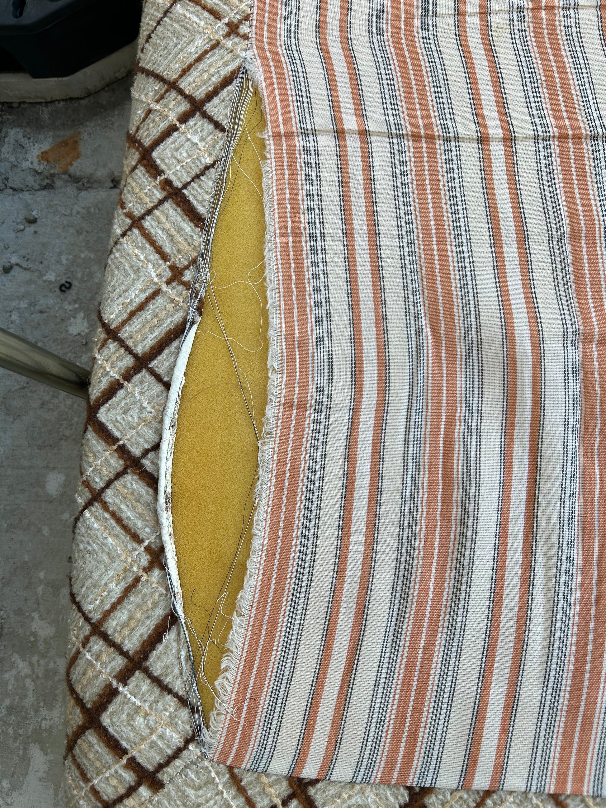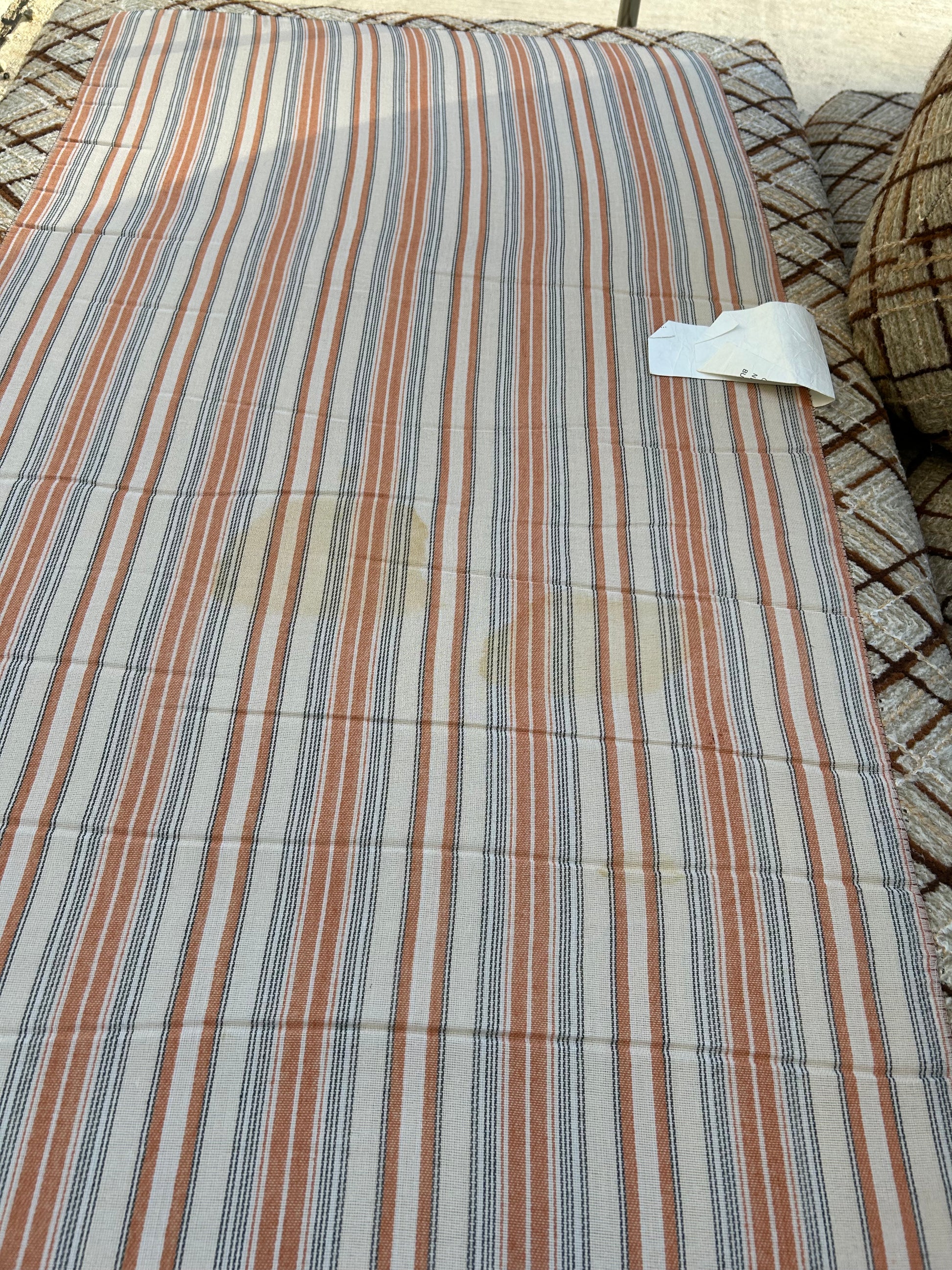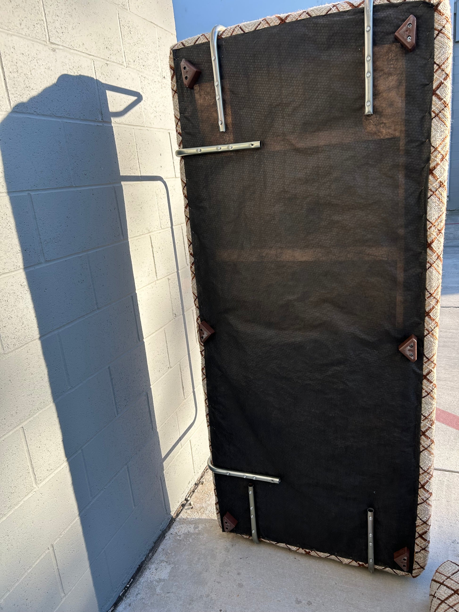 Great vintage condition with one rip and 2 stains on bottom interior cushion. Top cushion is slightly smaller height than base cushion. Would fit two twin sheets for sleeping. Light scuffs on steel frame from age and use. Tag doesn’t have maker but produced in 1982. Non smoking home, no pets.