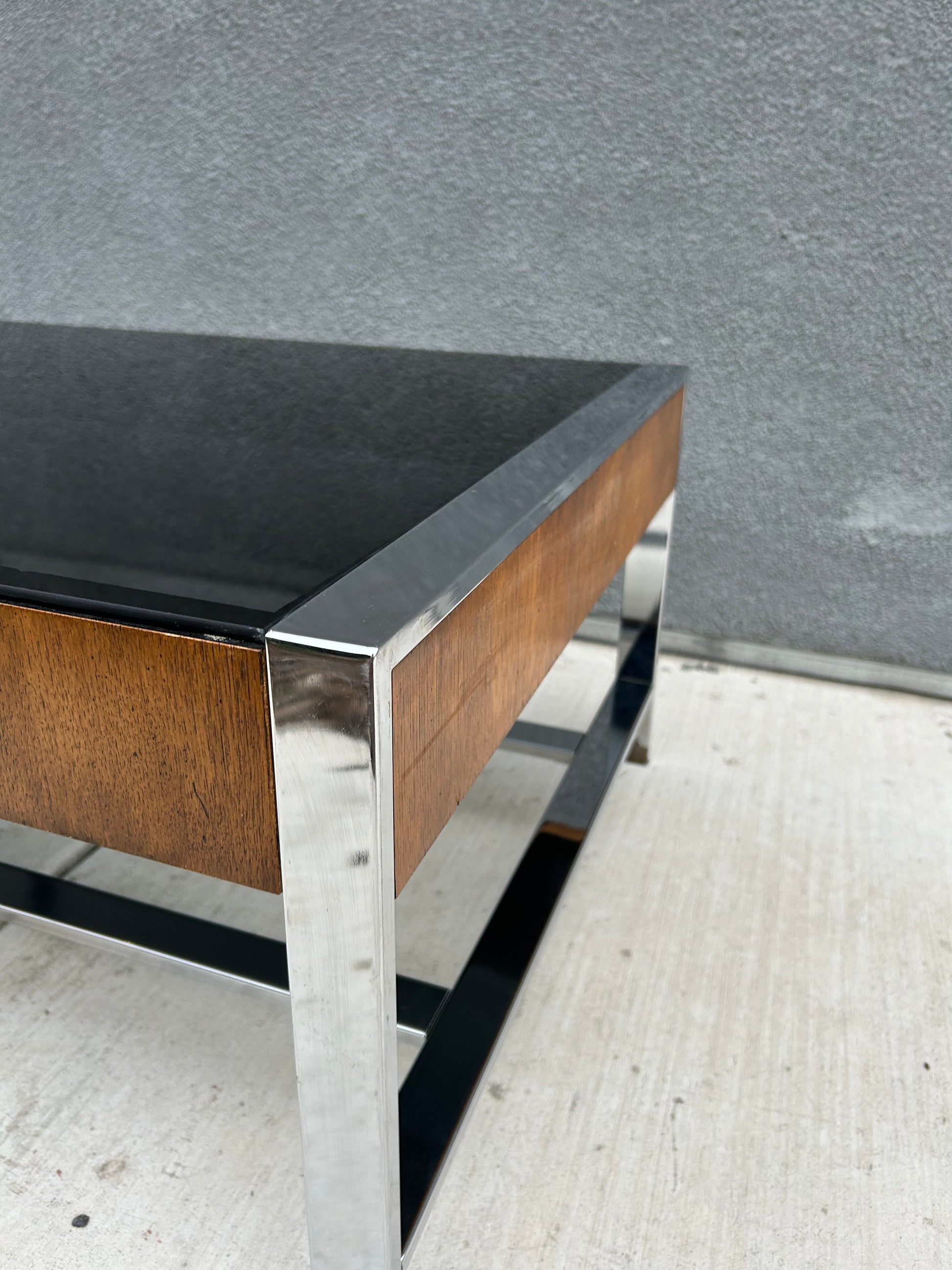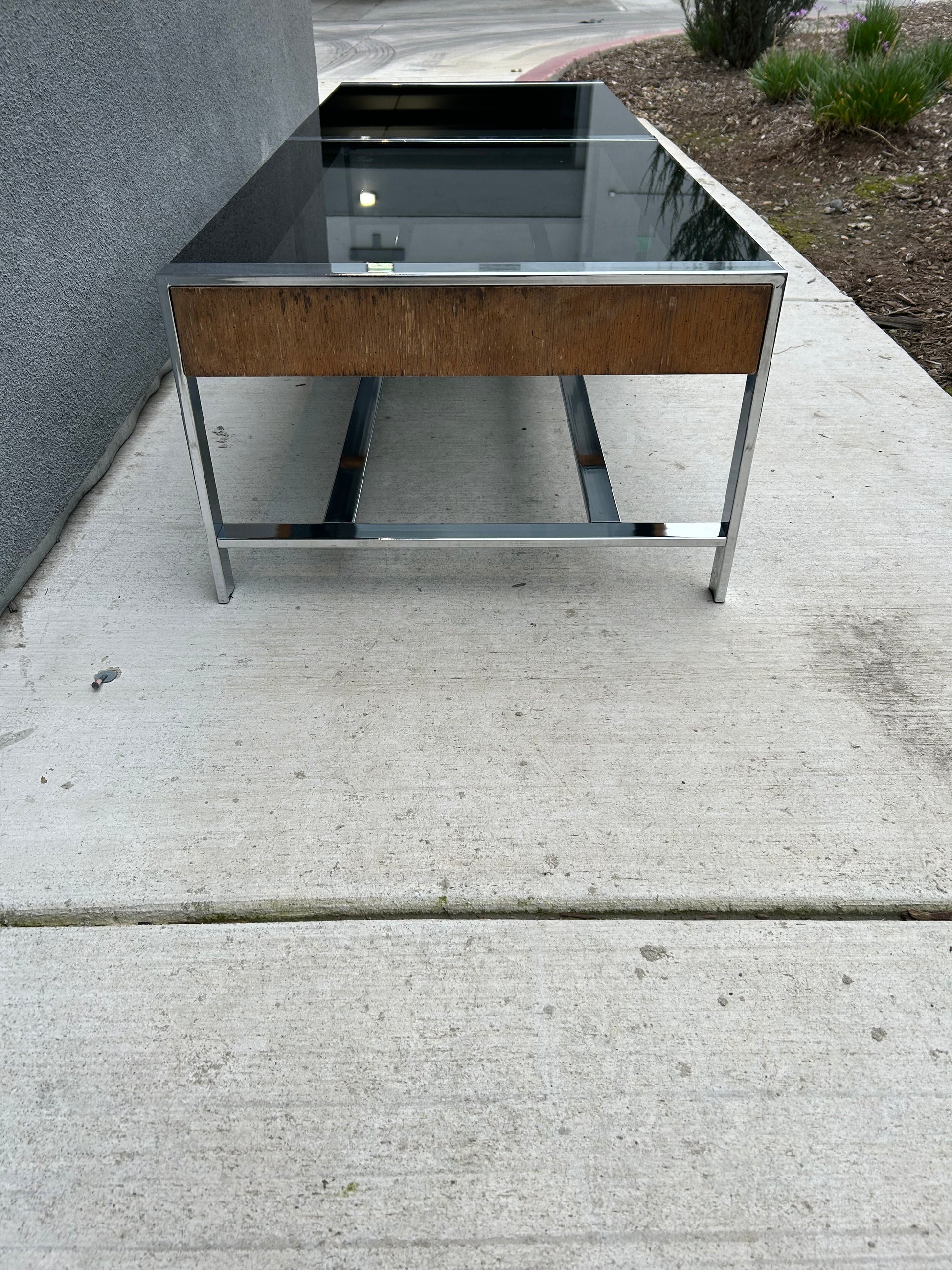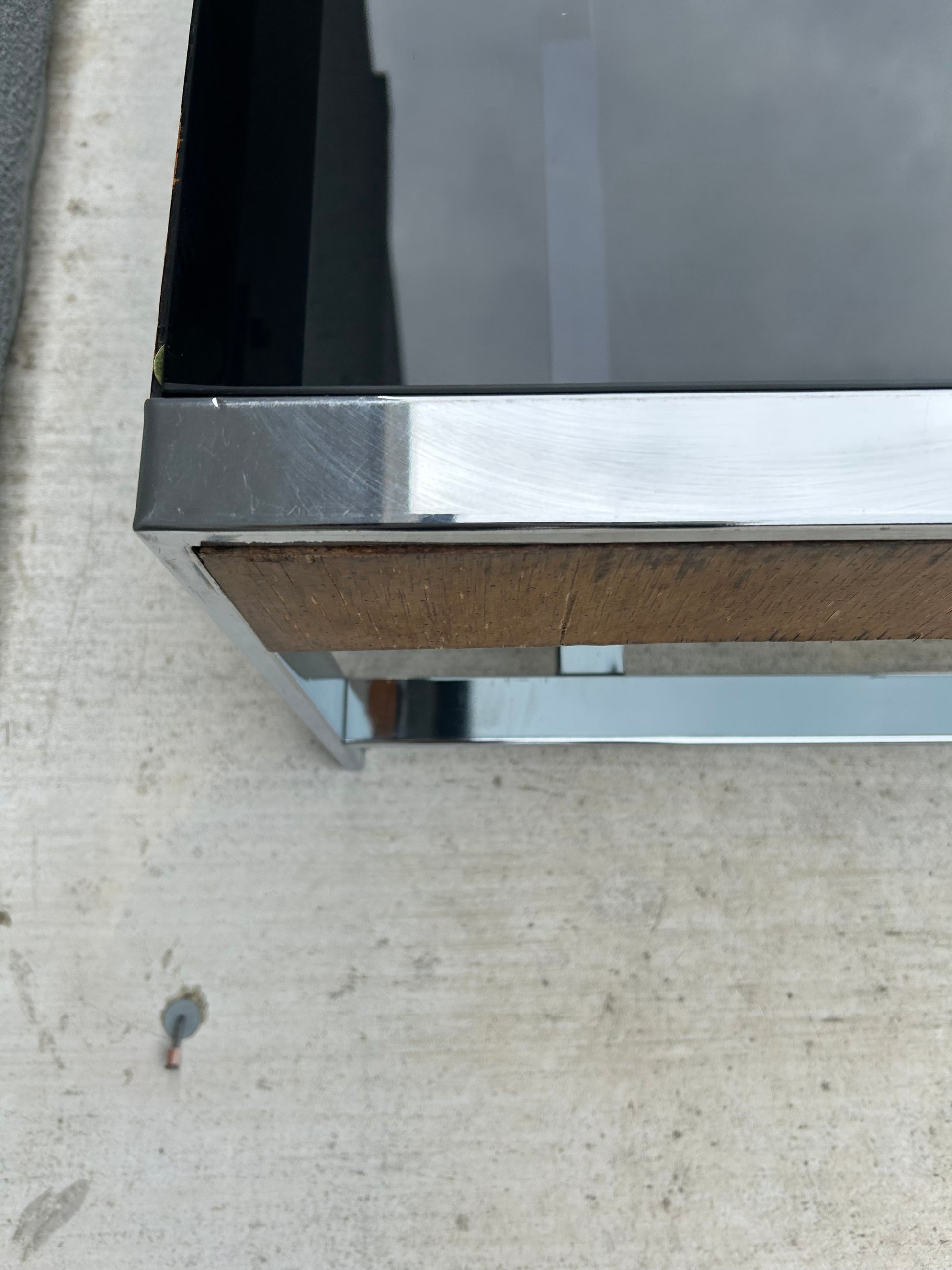 For sale here is a stunner. This minimalist, 1960's modern coffee table in the style of the legendary Milo Baughman would look great in a Modern or Mid-Century decor. It features classic chic chrome framework with a beautiful walnut grain with fitted with a dark, smoked glass top. Have matching end cabinets for sale in another listing.