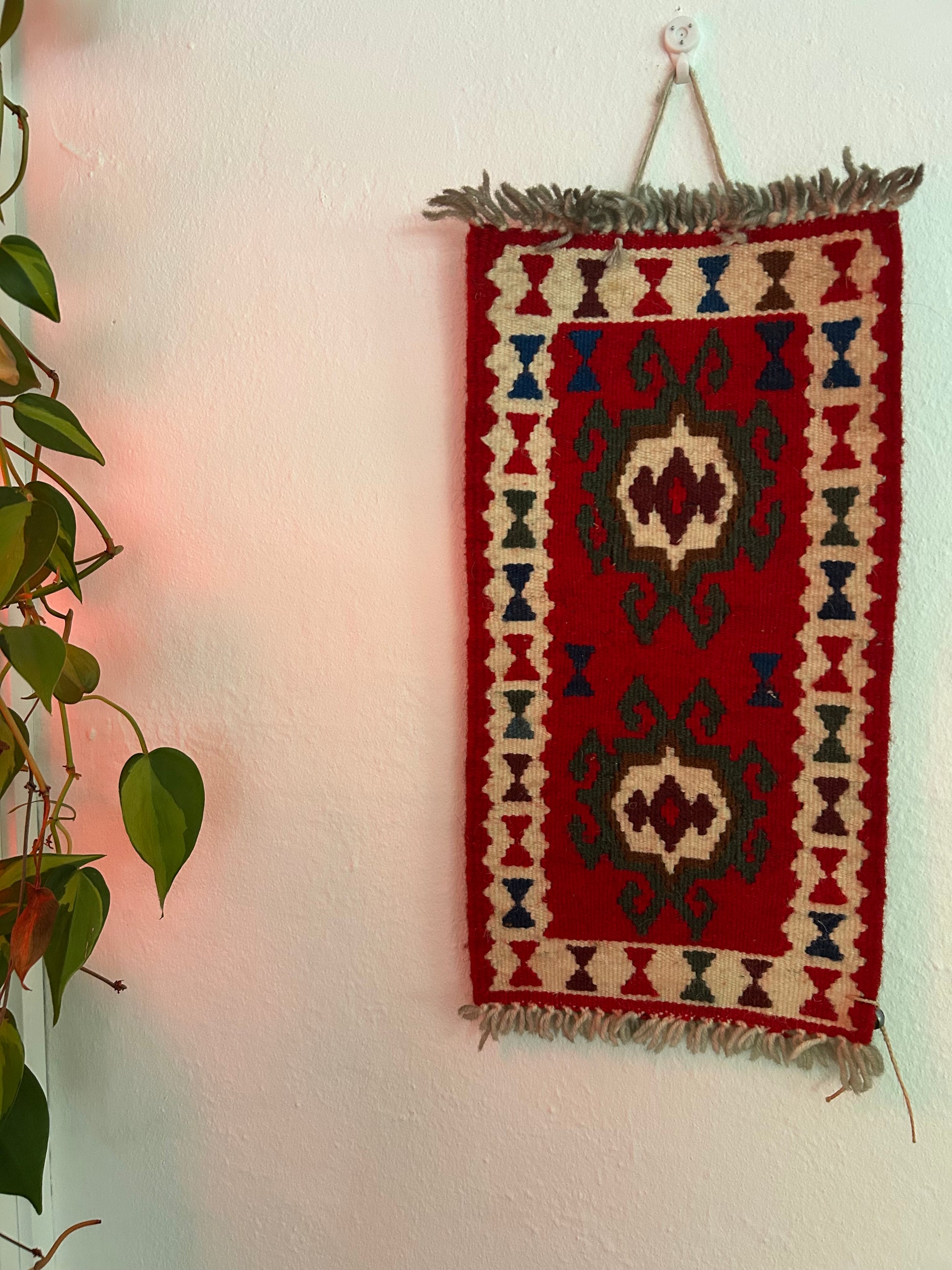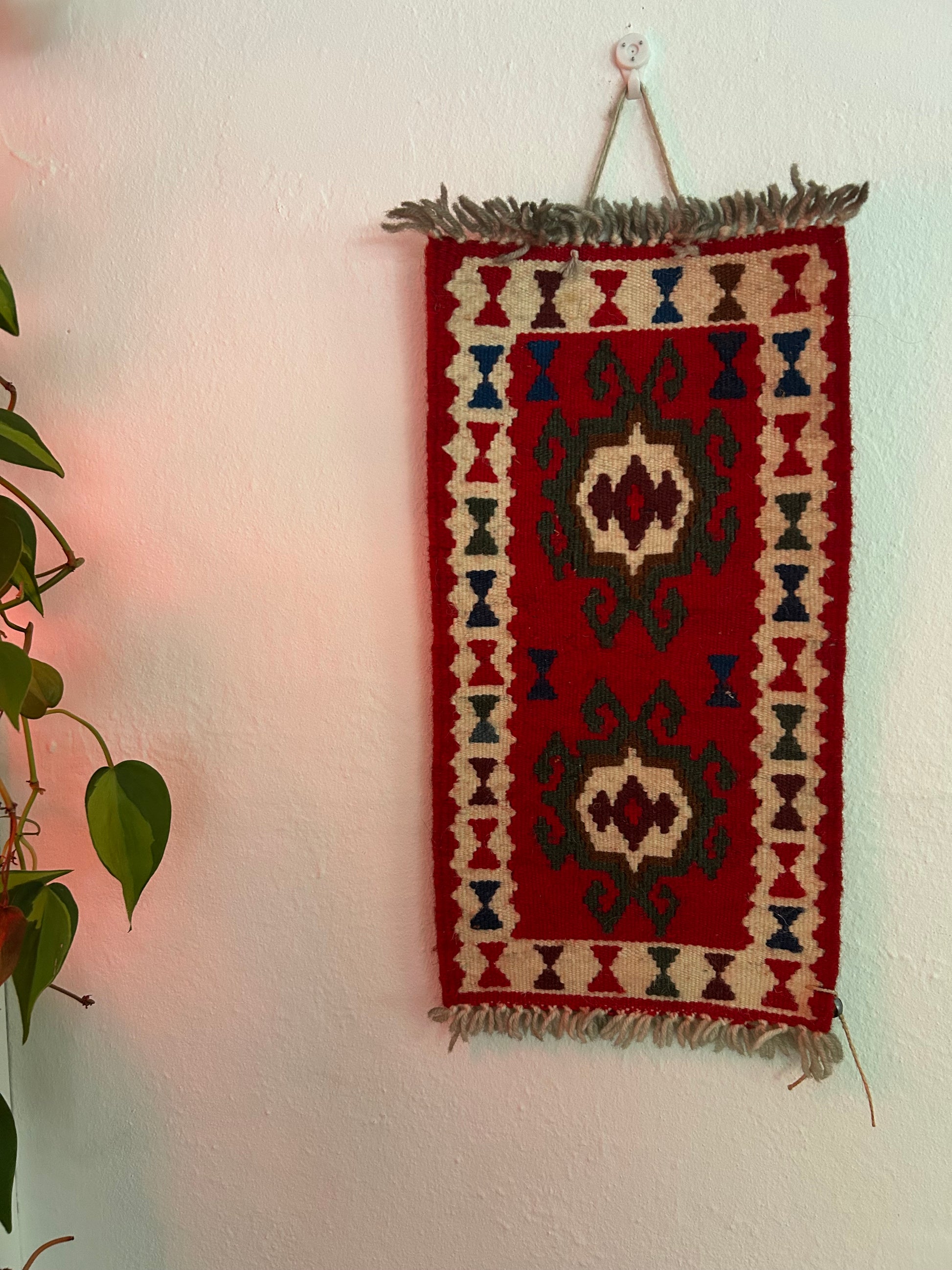 Wonderful detail and pattern. Some sun fading on one side. Fringe detail. 100% wool.