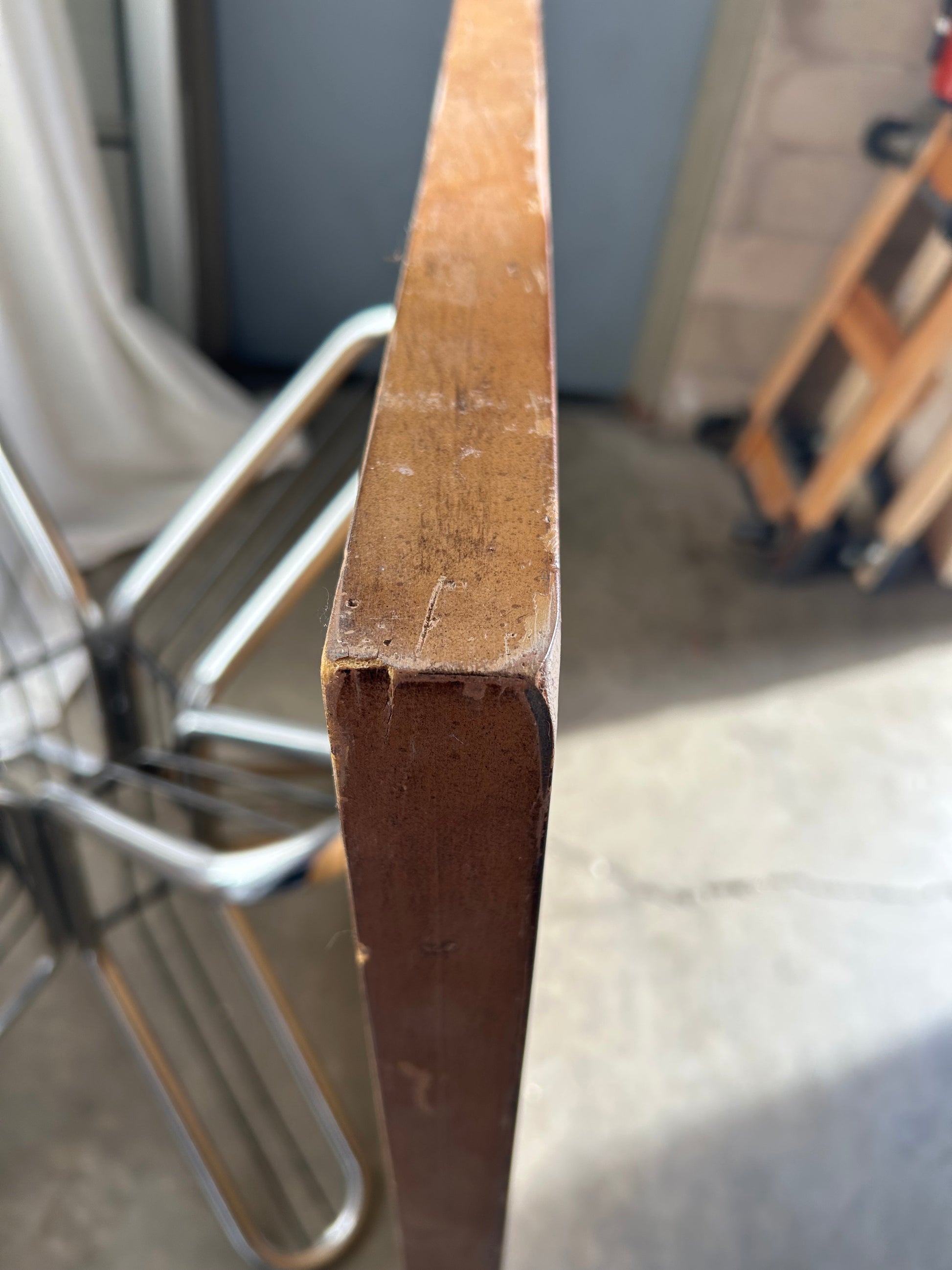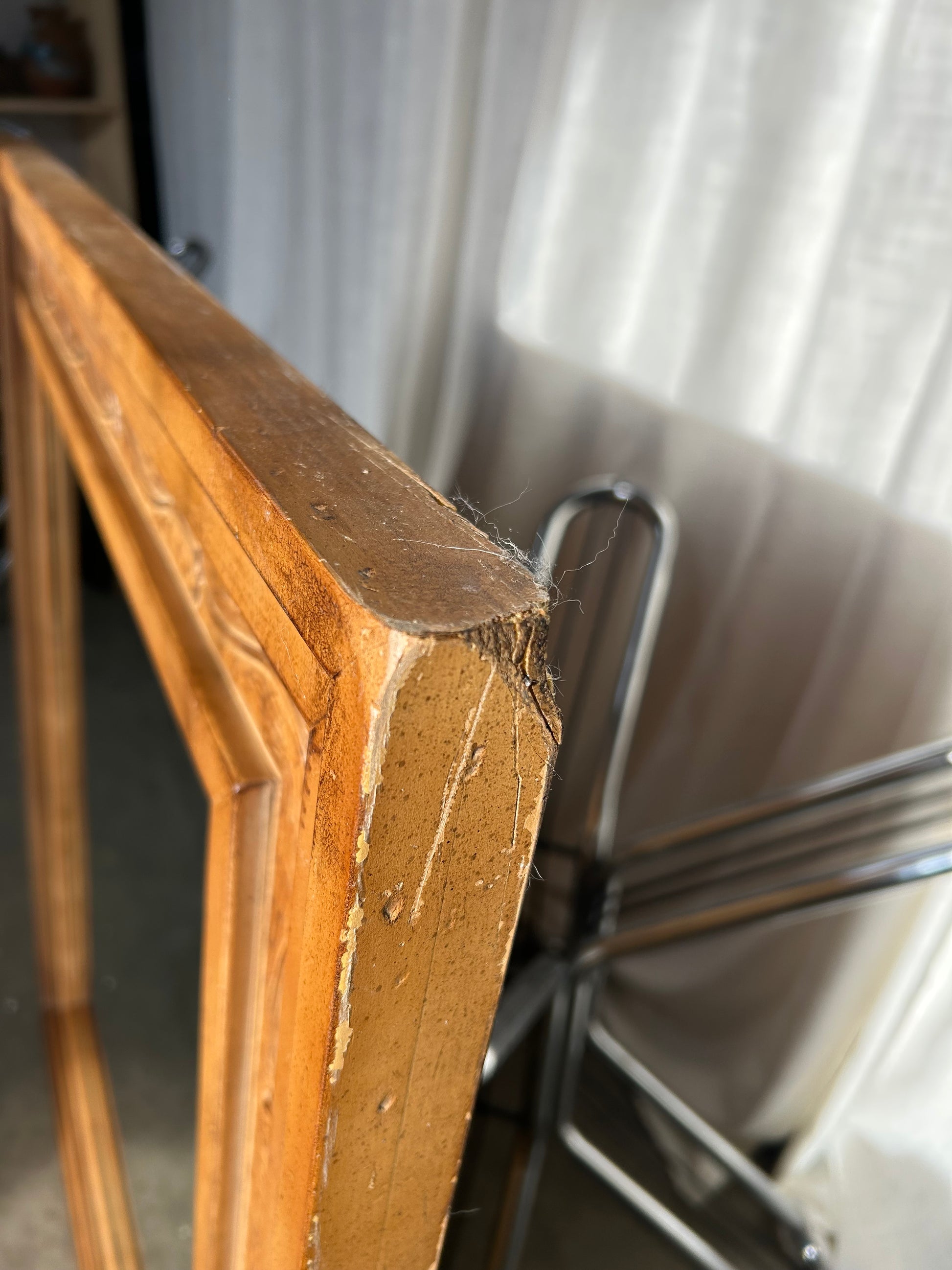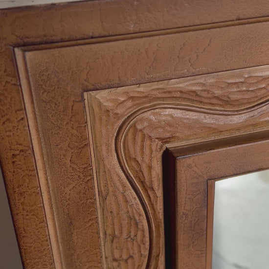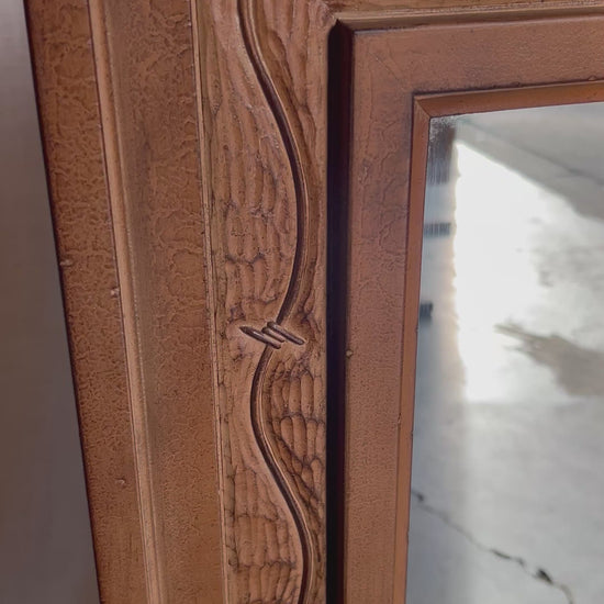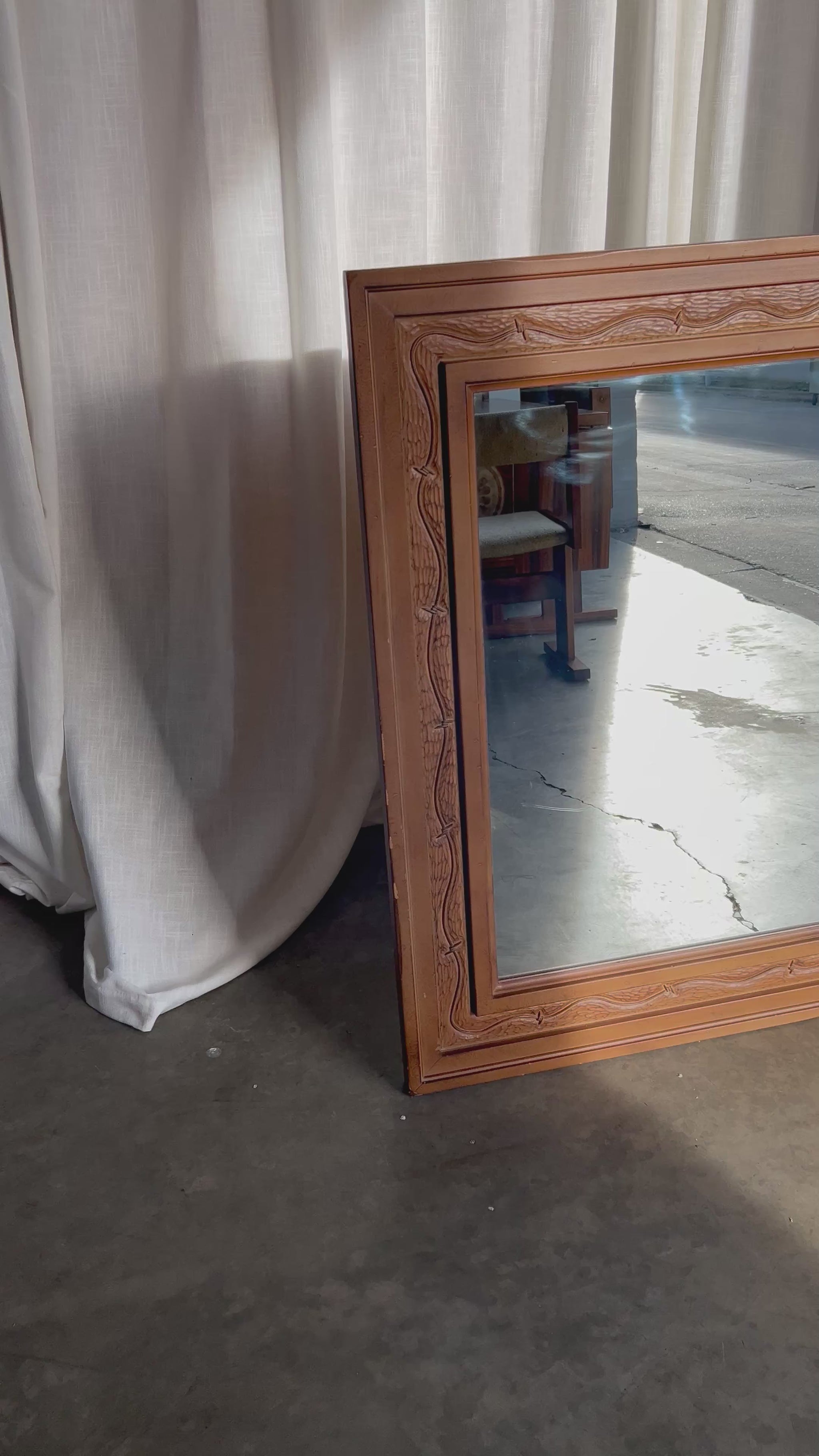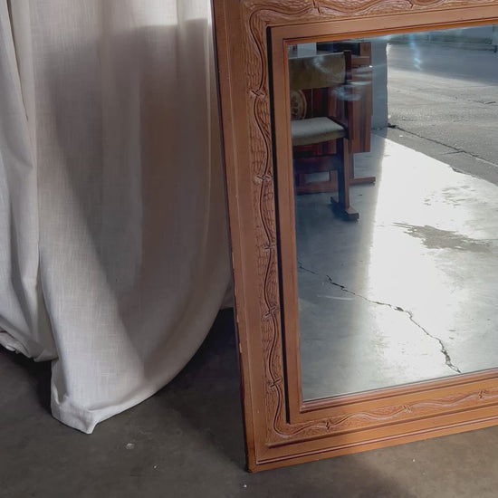 Condition: Some wear and tear to corners and edges of frame. One large scratch on mirror. Mirror is made of a foam faux bois, not real wood. Wired to hung horizontally but can easily be switched to vertical.