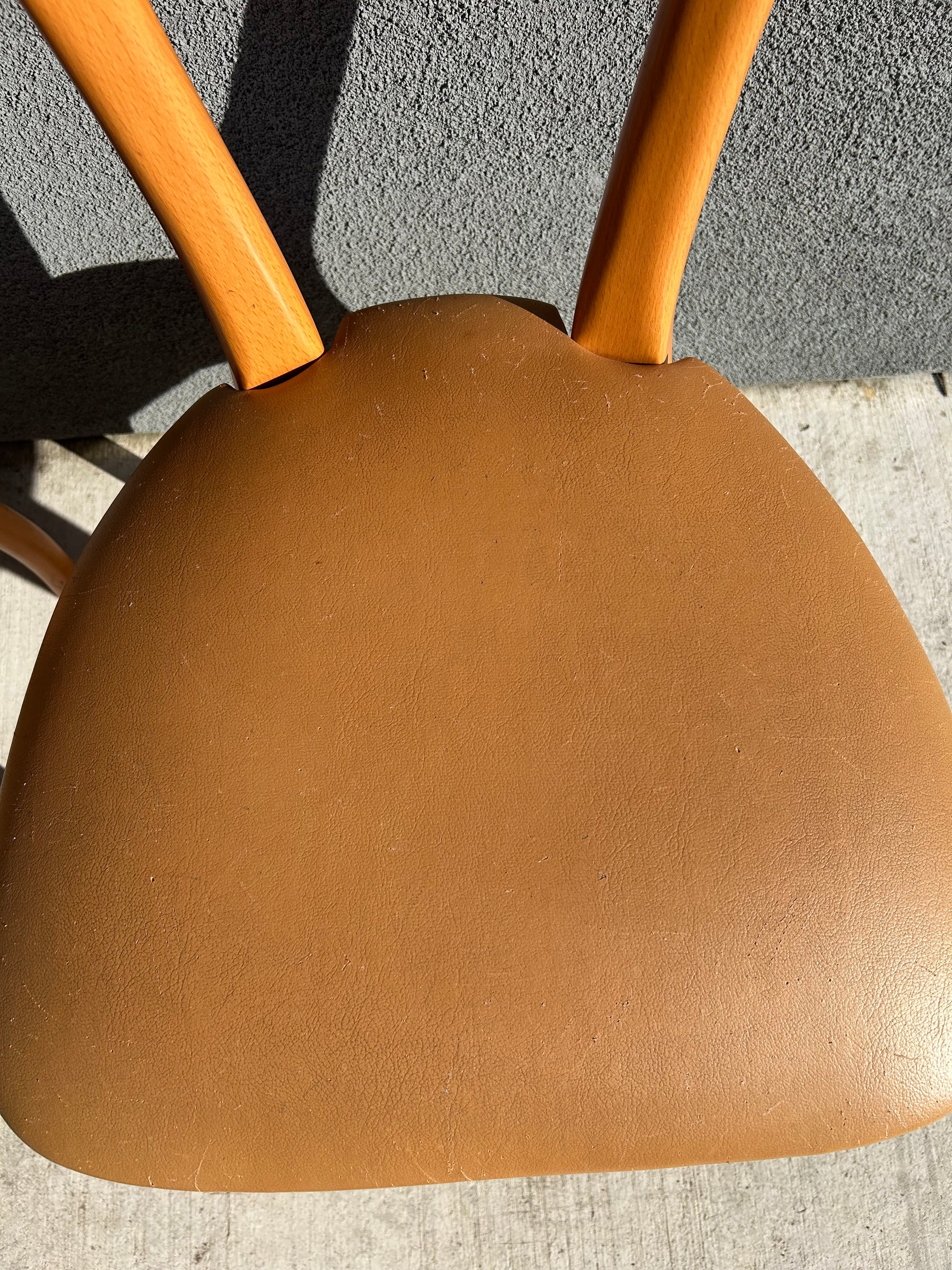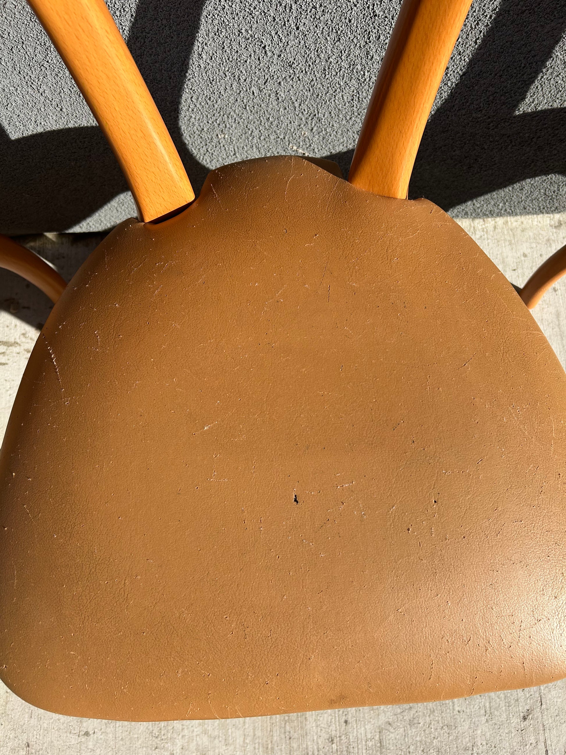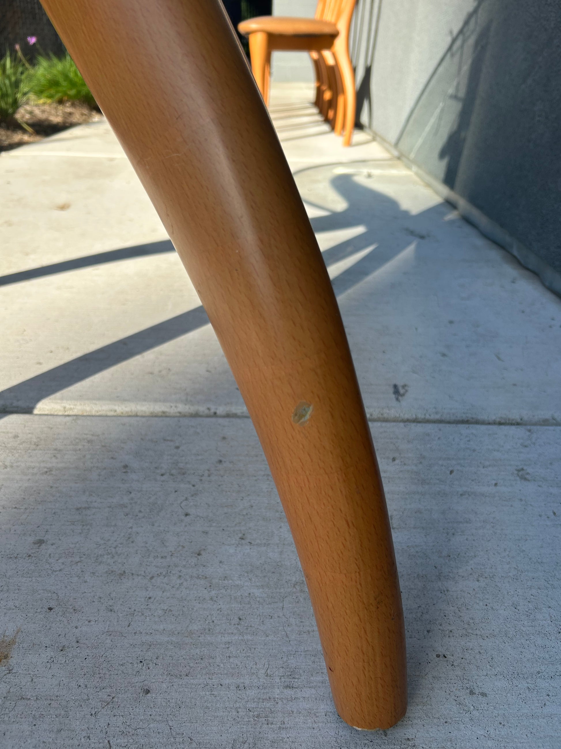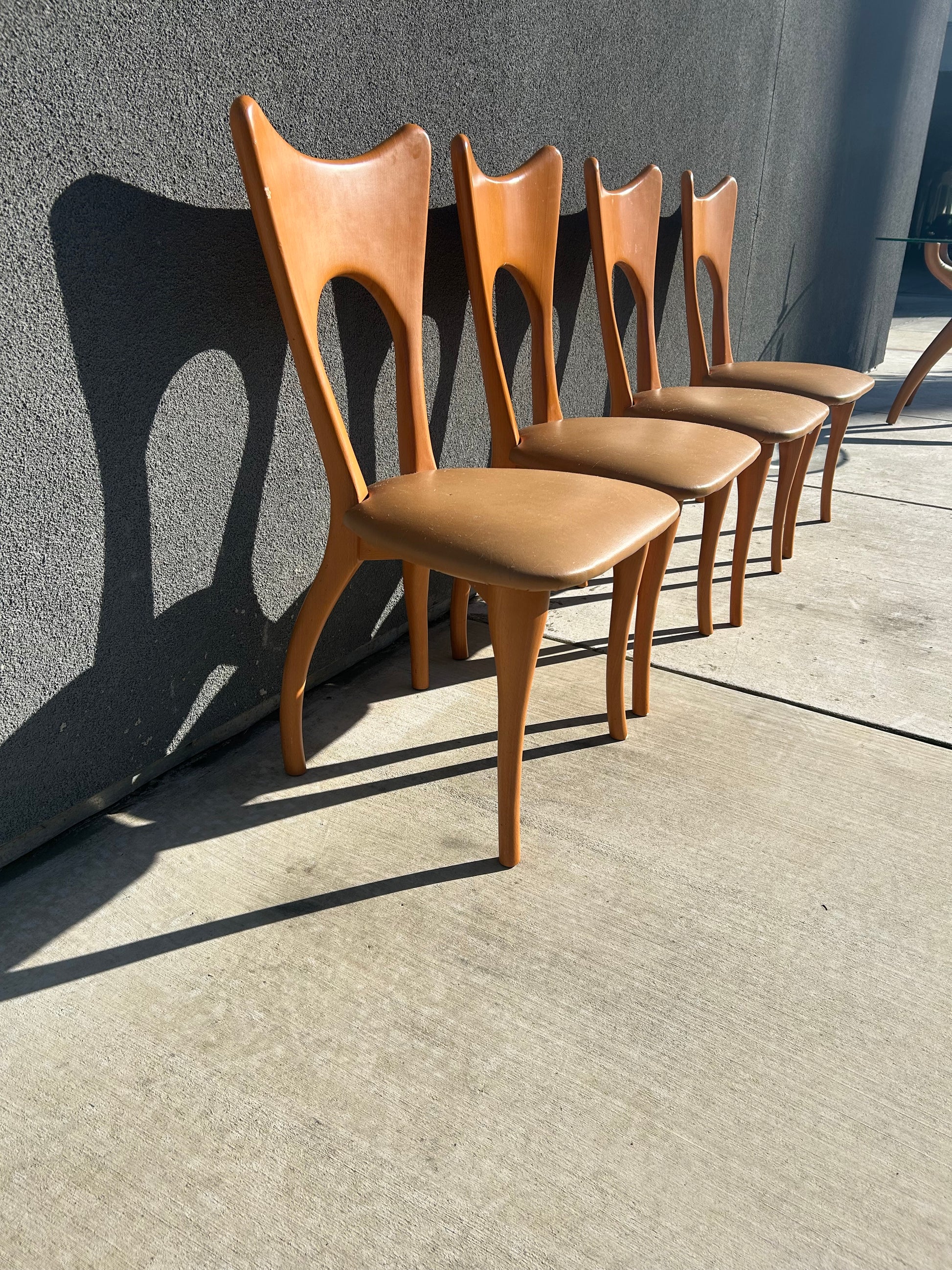 Crafted with sleek lines and a nod to organic forms, this dining set is peak Italian Design. Original vintage condition with some wear and tear to both veneer and leather seats. Condition is factored into price, see photos.