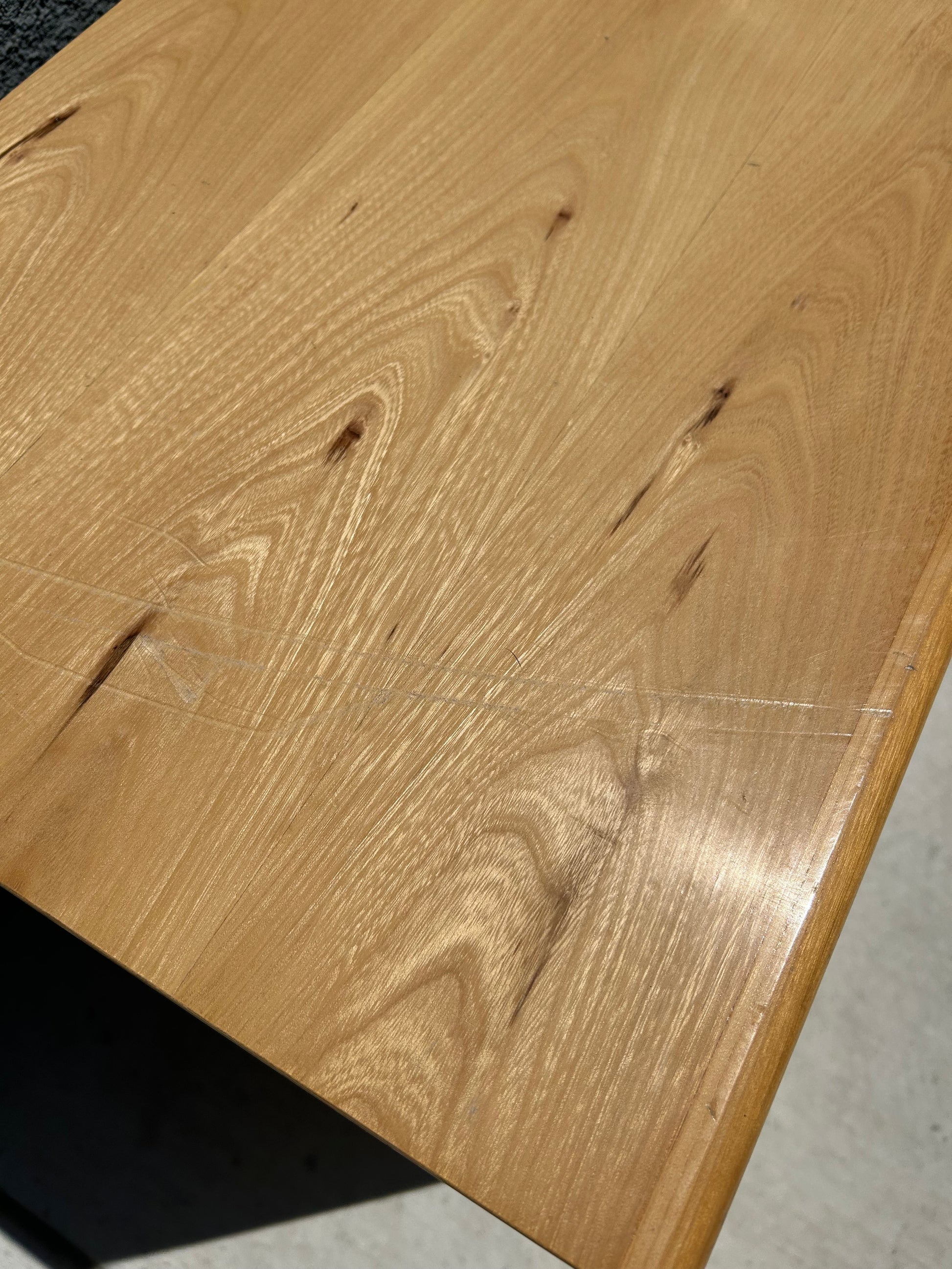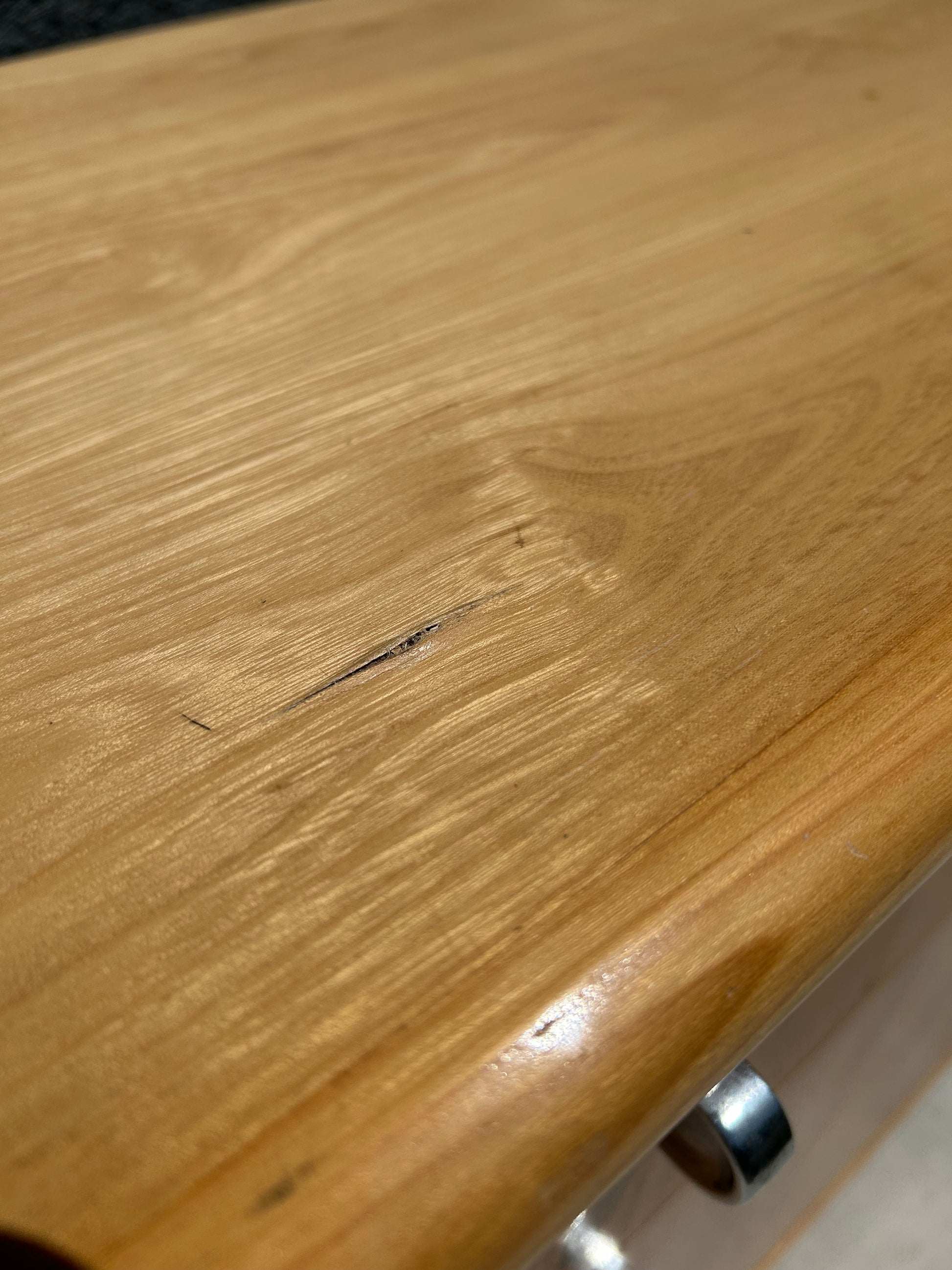 In very good condition with a scratch on top of dresser from hutch and small veneer chip as well. Wear and tear consistent with age and use, all drawers open and close smoothly. See photos.