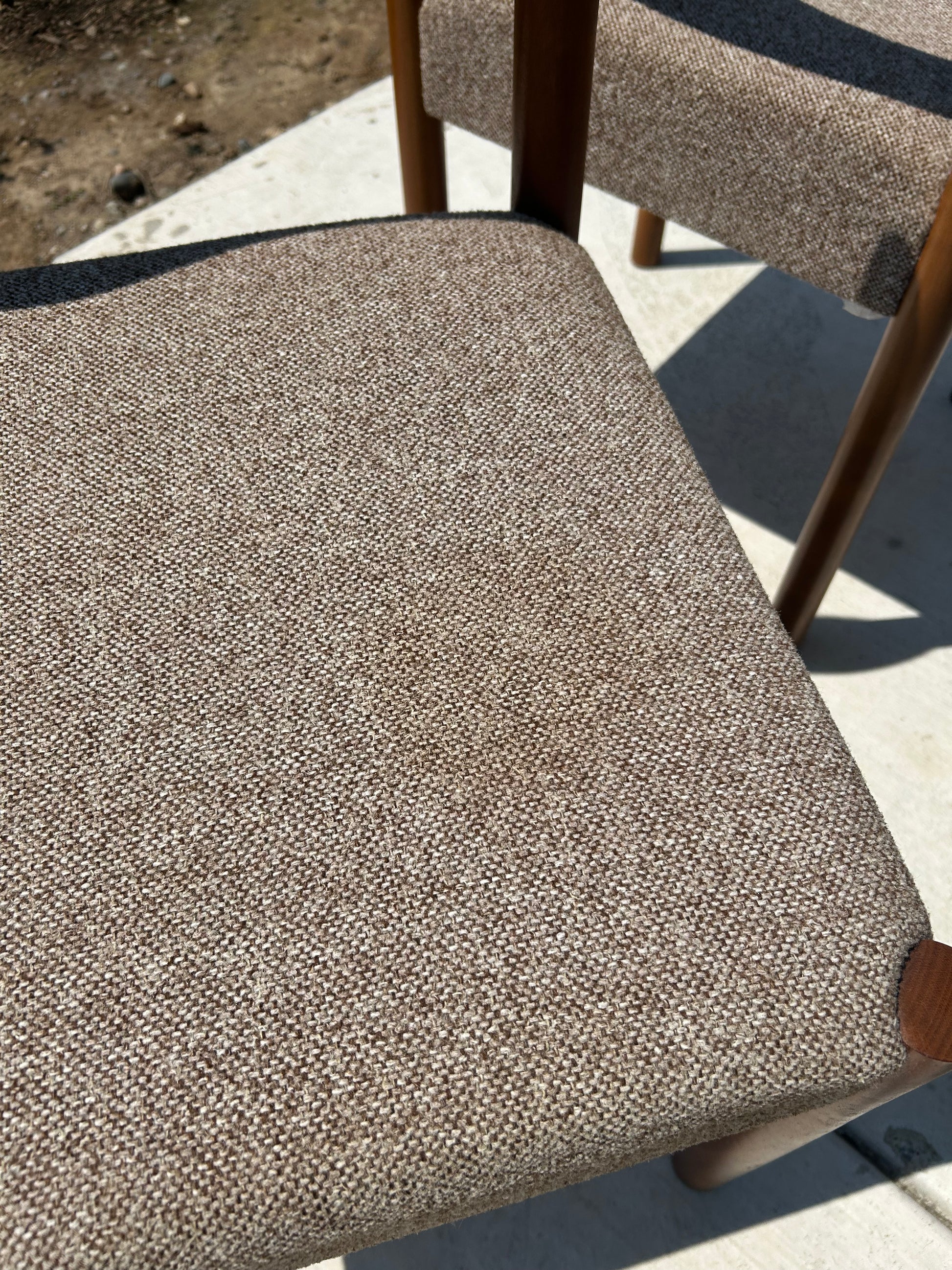 Teak has been conditioned and all chairs are in great structural condition with minor surface imperfections on legs. Original brown and grey wool fabric has been steam cleaned and some wear remains. One faded large stain. See photos.