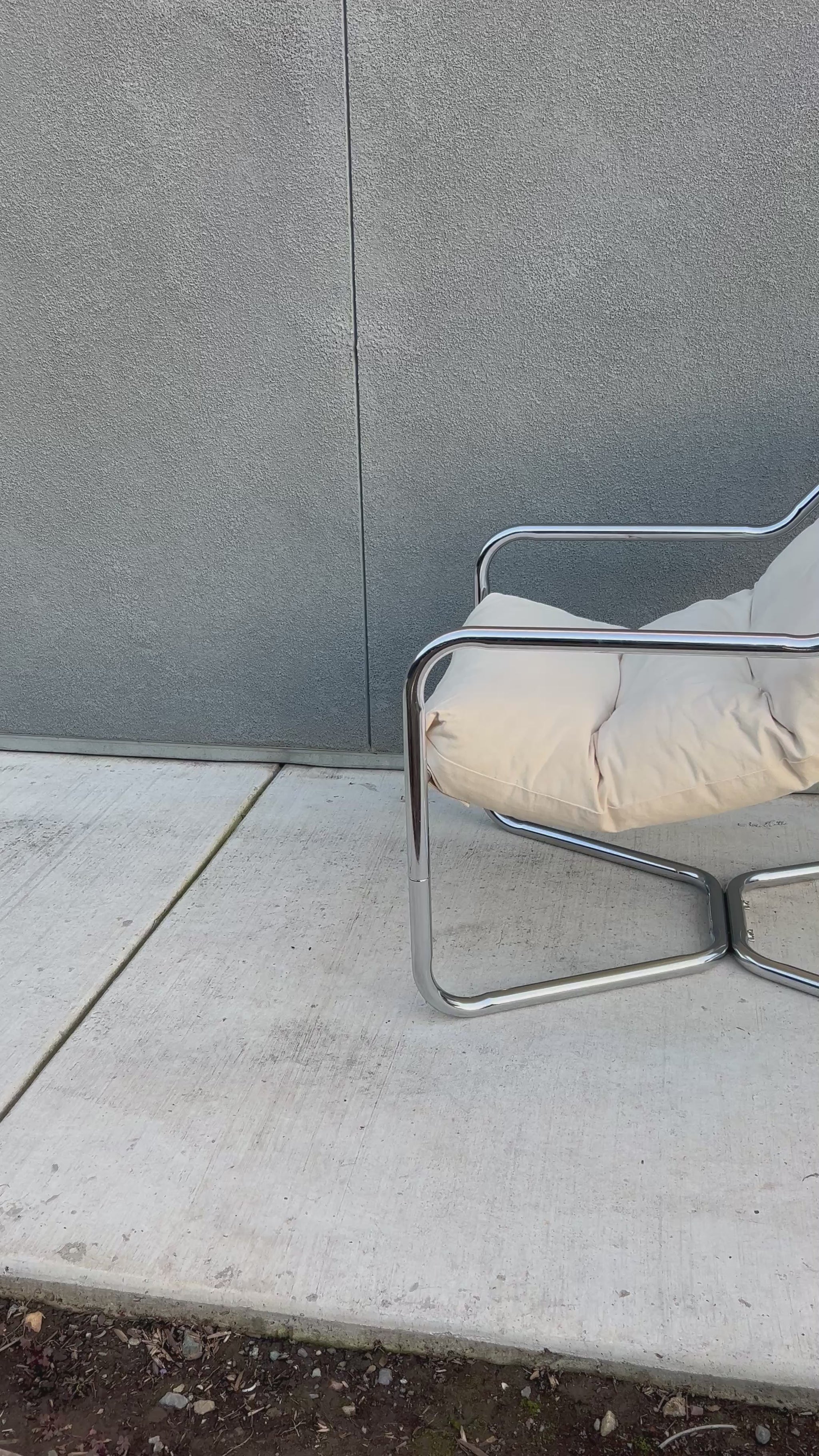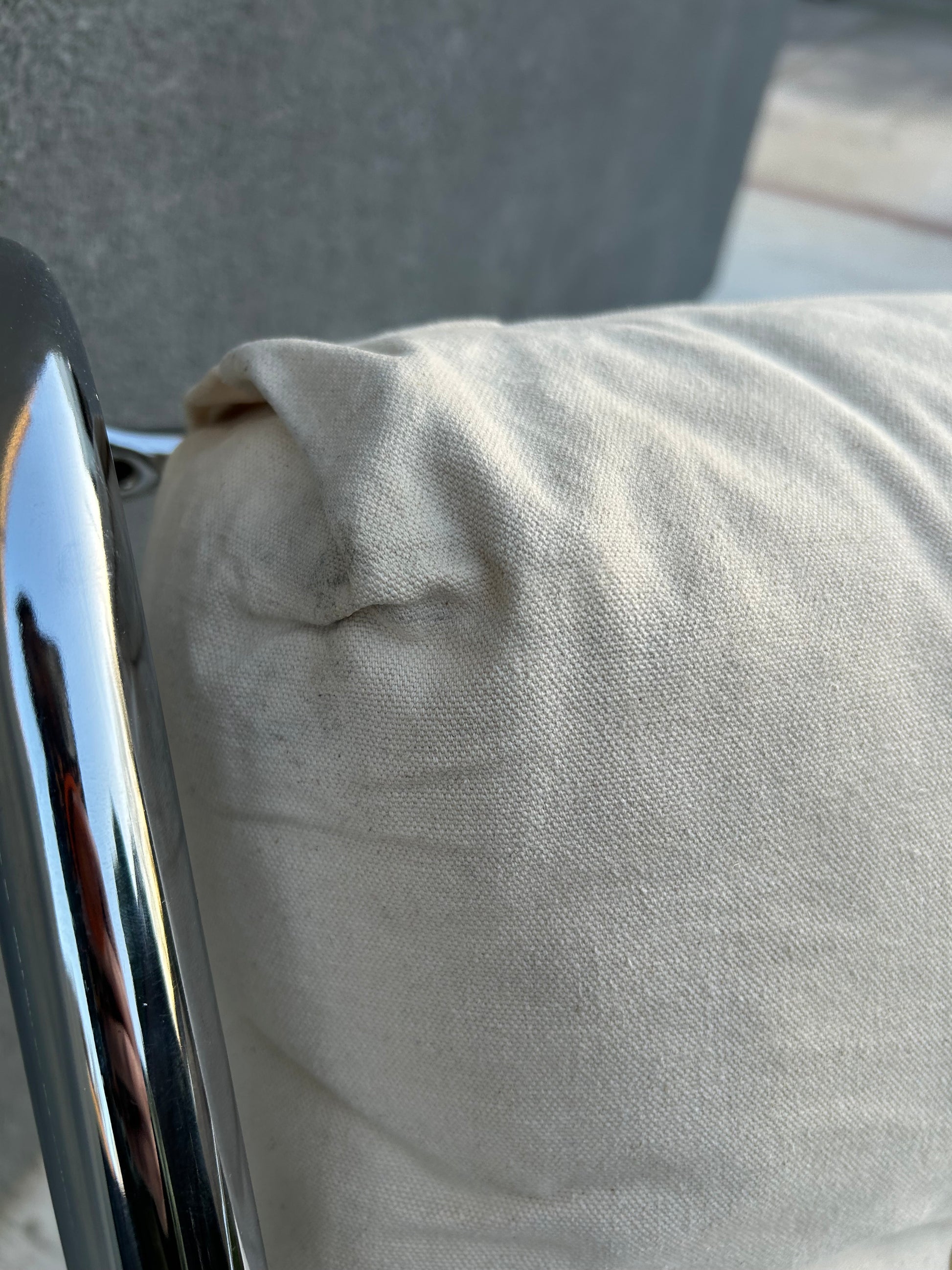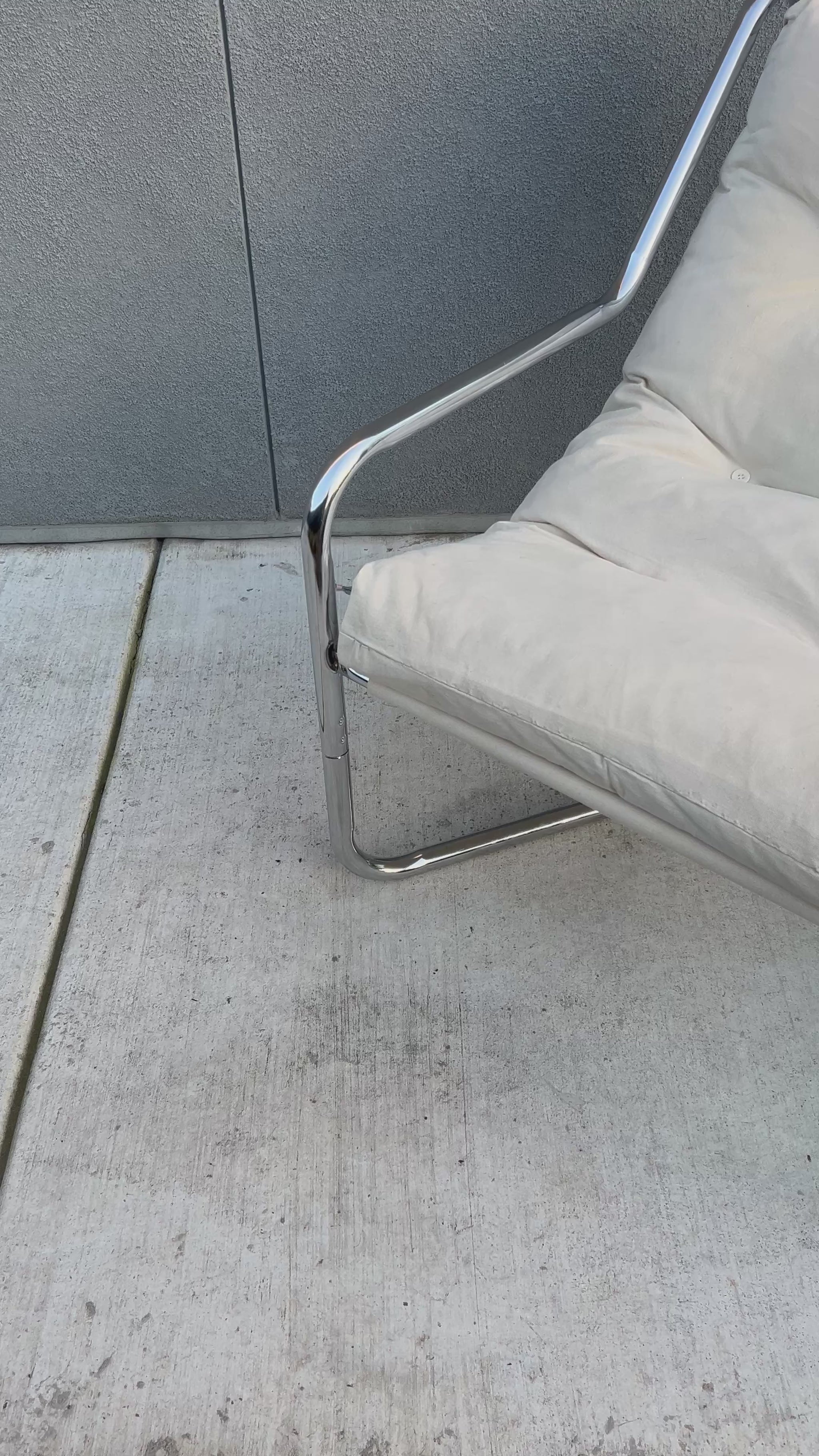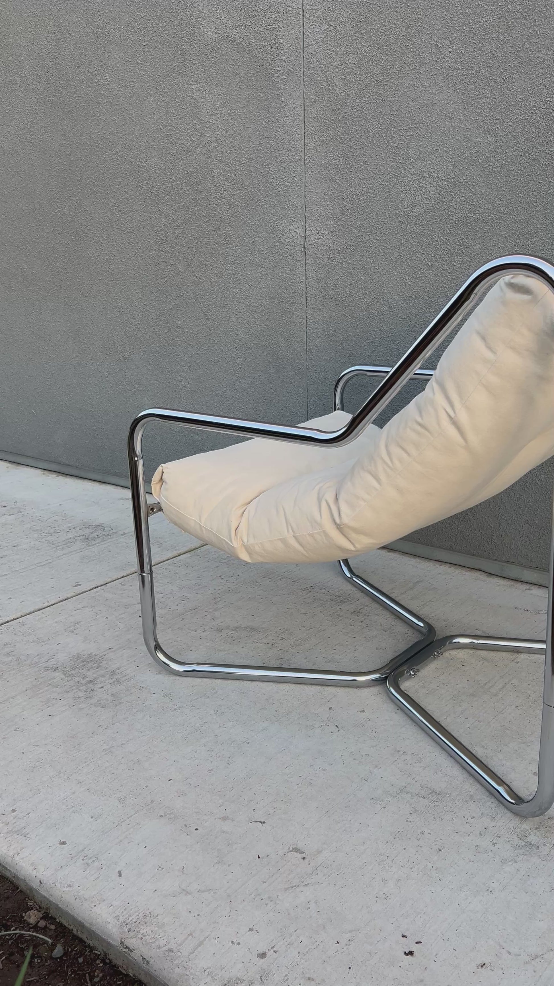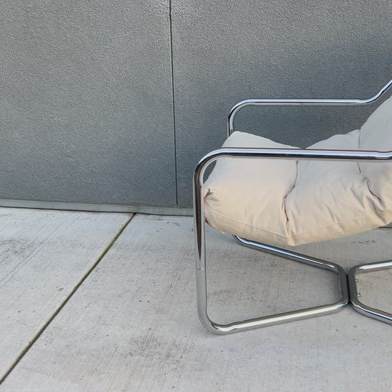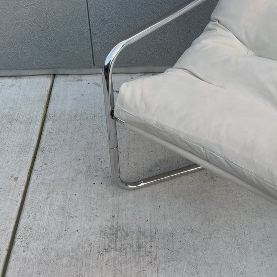 A relaxed classic from the 1970s. This vintage Unarco sling lounge chair features a minimalist metal frame paired with a soft cream canvas seat that cradles the body just right. Supportive and firmer seat. Timeless, comfortable, and effortlessly cool—perfect for a reading nook, living space, or styled corner that needs a little vintage soul.