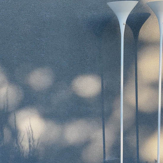 This mid-century modern torchiere floor lamp blends sculptural form with timeless simplicity. Crafted in white-toned metal, it features a distinctive trumpet-cone shade that directs light upward, along with a dimmer to cast a soft ambient glow. The circular base provides stability while maintaining the lamp’s clean silhouette.